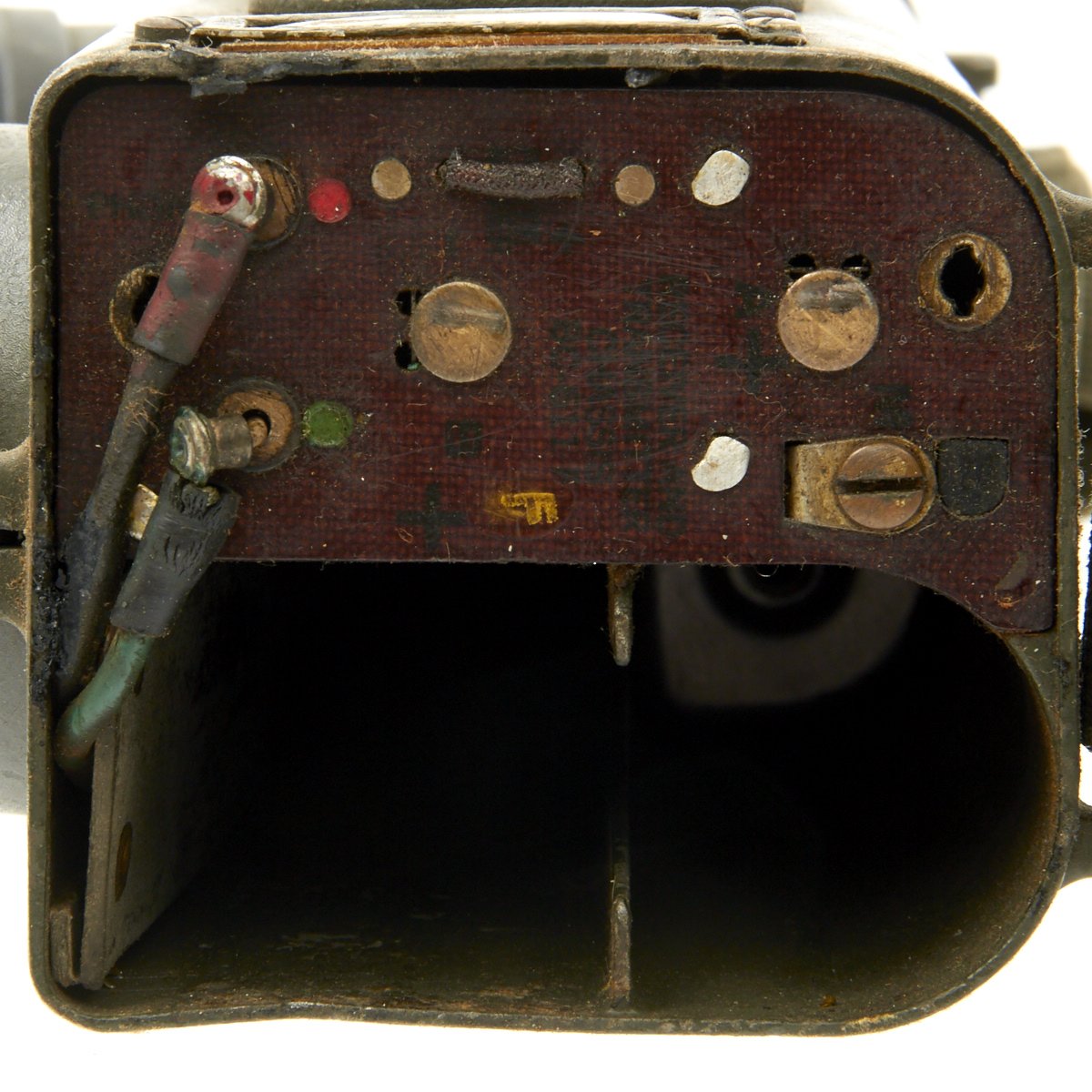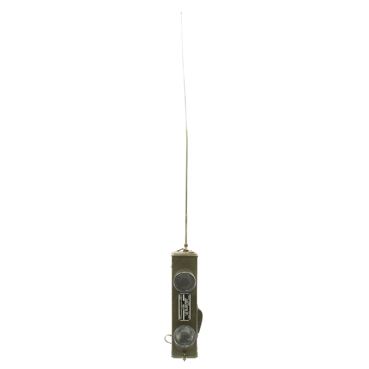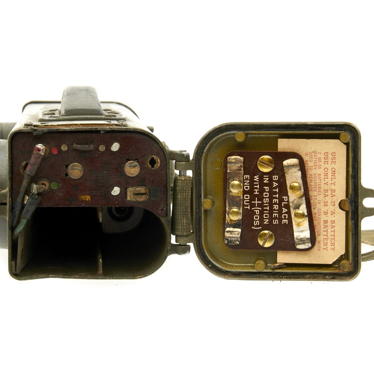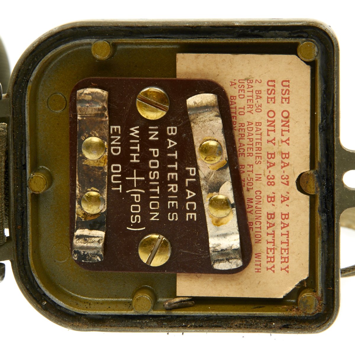The battery door opens, and the contacts appear to be in good condition. It also still has its complete extendable antenna with removable cover, though the securing chain is detached. The plastic base fitting of the antenna is cracked off as well, but could easily be glued back in place. The sling is complete, and in good condition, with a bit of fraying. There is overall wear to the paint, and it does appear to have been repainted once. It also has a frequency tag by the send switch, indicating Fr. 3940. Overall this is a great Handie Talkie radio, ready to add to your collection, or to use in reenactments.