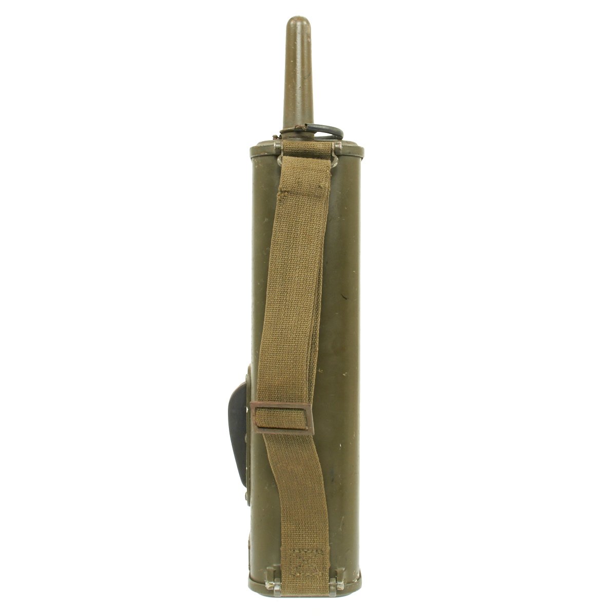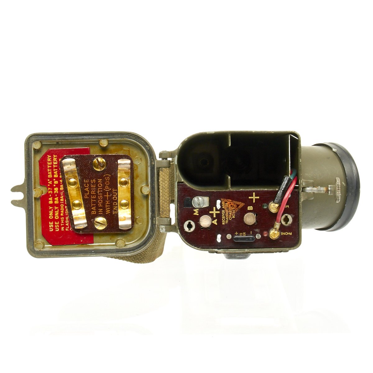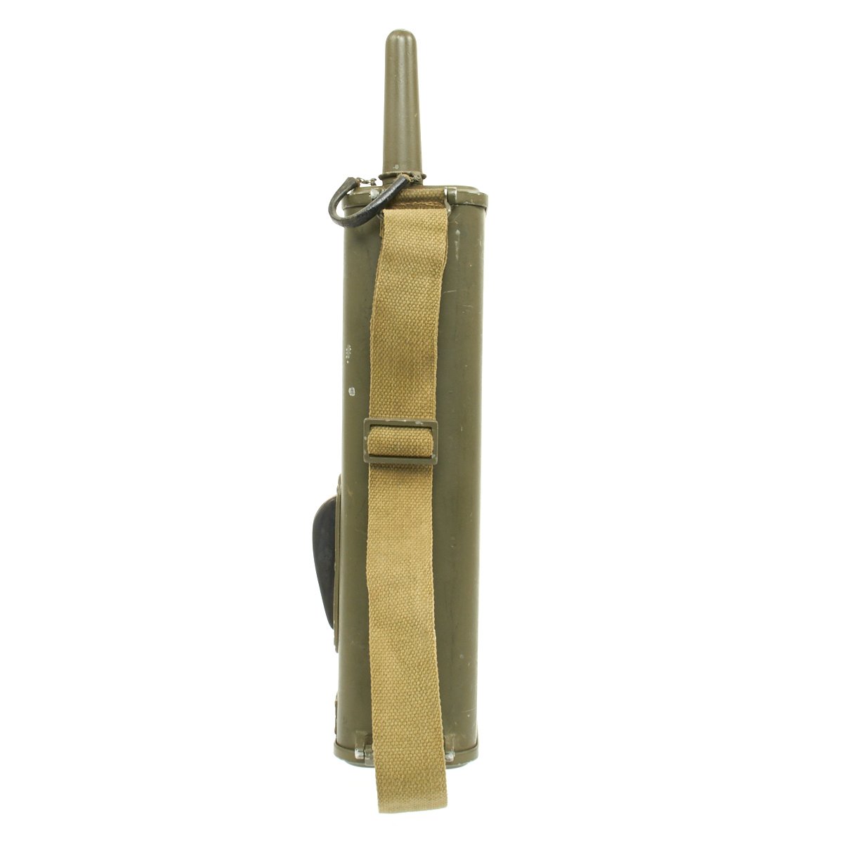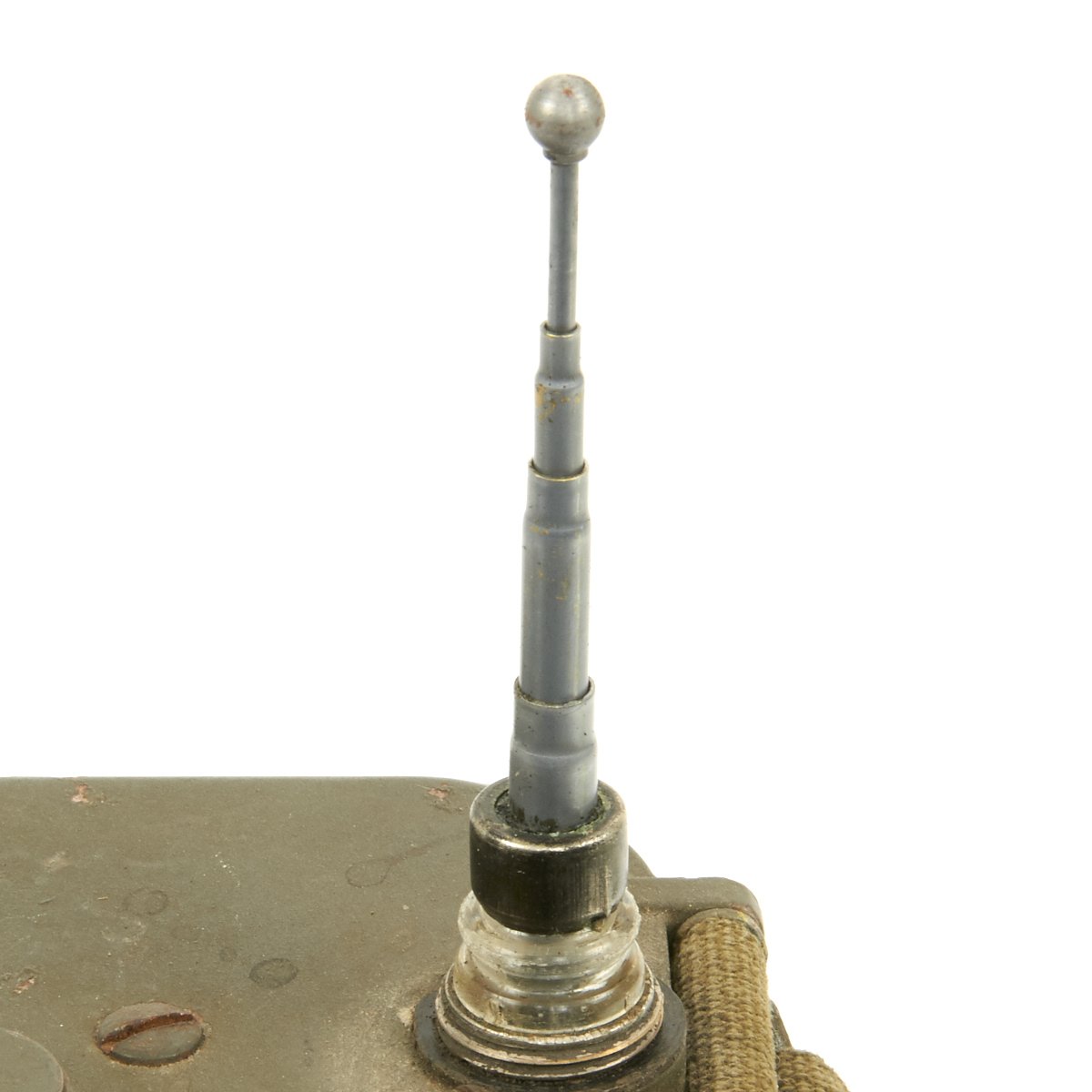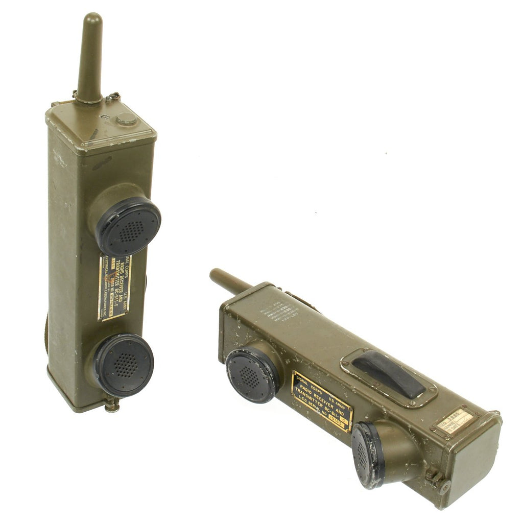 The battery doors on both open, and the contacts appear to be in good condition. Both also still have their complete extendable antennas with removable covers. The slings on both are complete, and in good condition. Overall this is a great set of Handie Talkie radios, ready to add to your collection, or to use in reenactments.