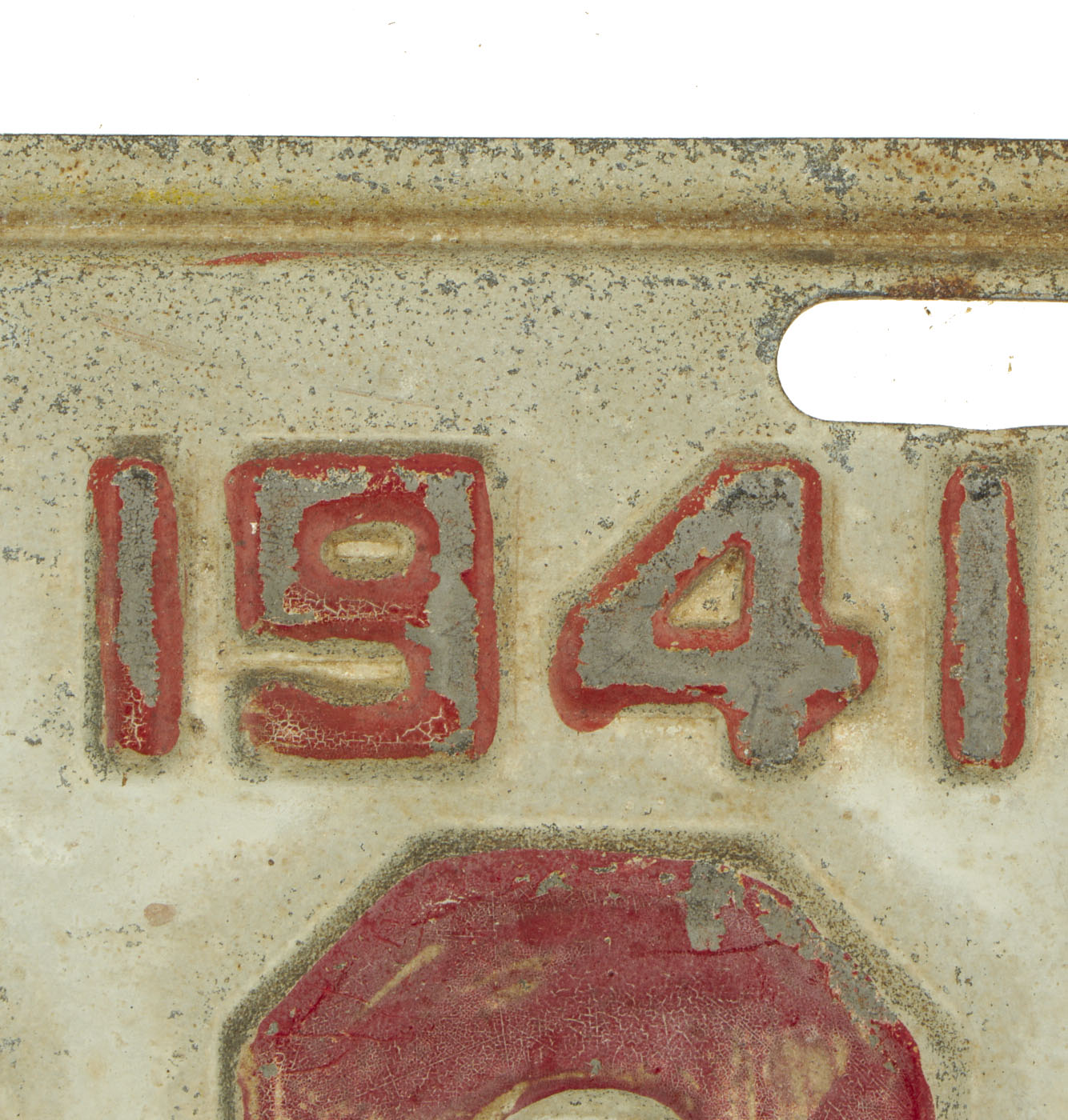 The original colors of this license plate are still visible and are red letters and numbers on a gray background for 1941 only. 1940 Hawaii license plates were black letters and numbers on a yellow background and 1942 Hawaii license plates were white letters and numbers on a black background. From 1943 to 1945, window stickers were issued for vehicle registration. No 1943, 1944 or 1945 dated Hawaiian license plates were made.