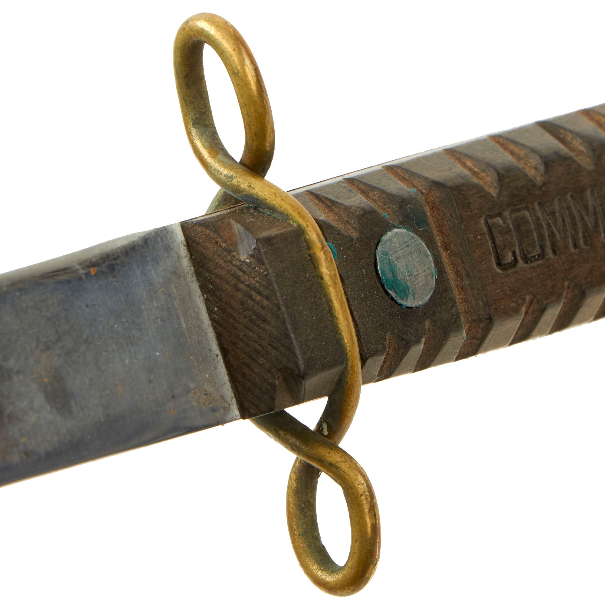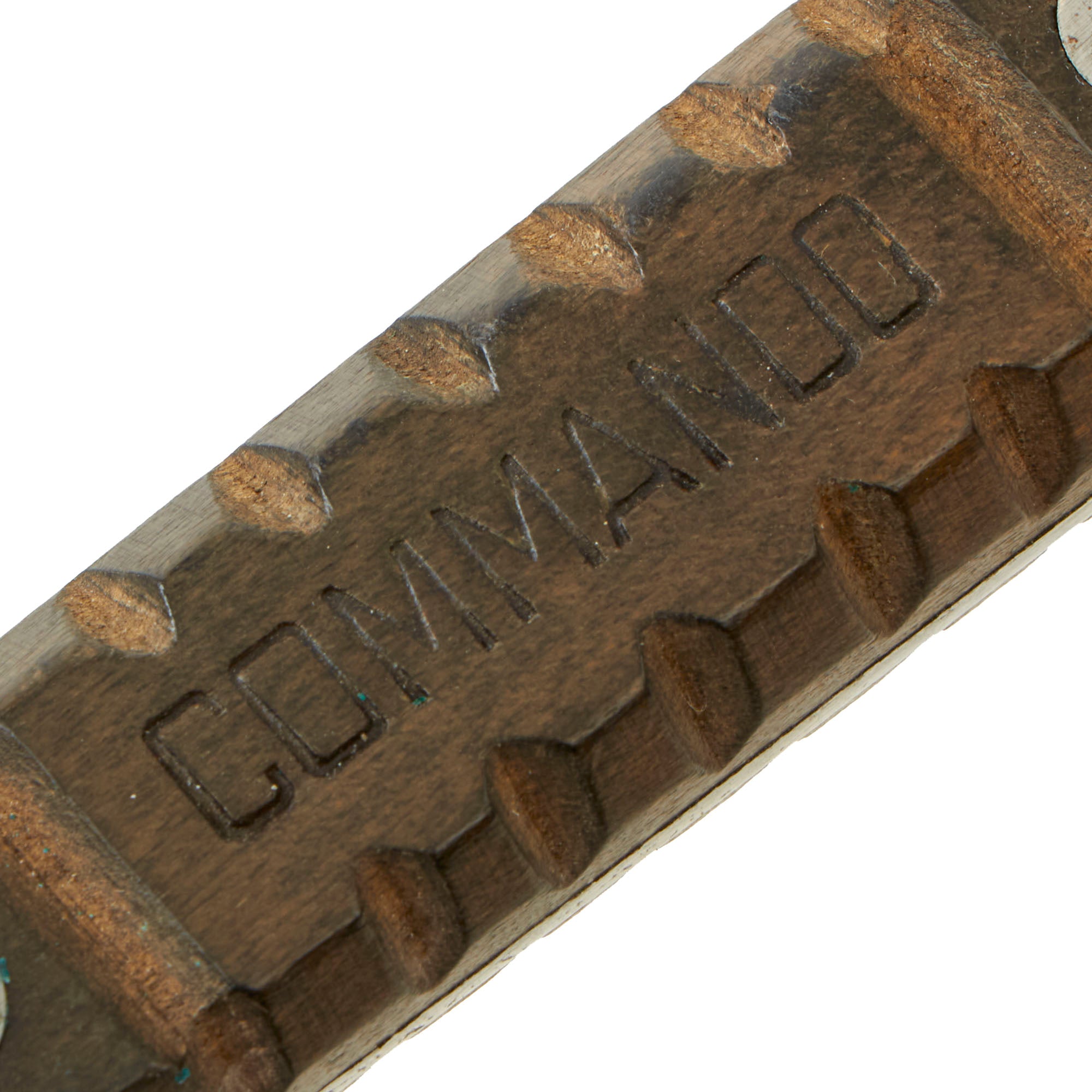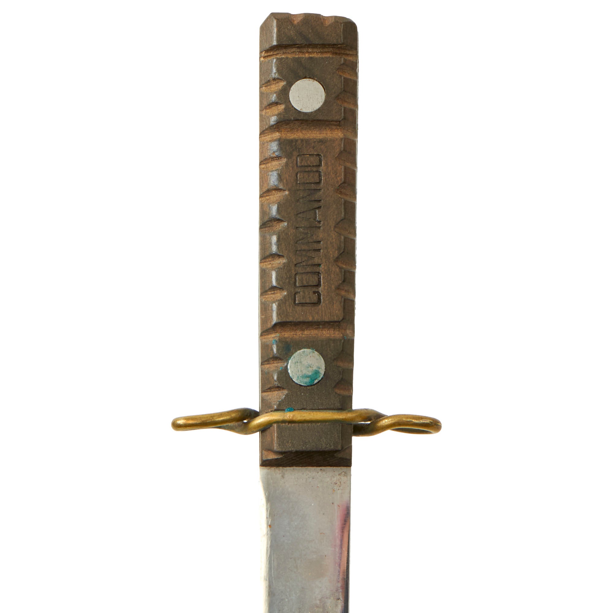 This example has a 5 7/8" single edged spear point blade, double marked two rivet wood grip, and twisted brass wire hand guard. These are very hard to find in such nice condition, where the carving on the handle is still sharply defined, and the blade not showing extensive use and sharpening. The two rivet handle is marked on both sides, with the right side reading COMMANDO and the left reading: