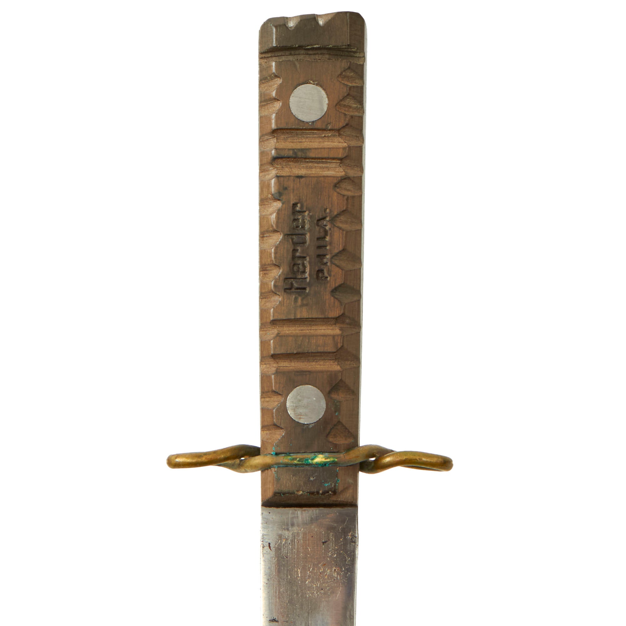 The Herder "COMMANDO" is one of the rarest U.S. fighting knives used during WW2. Theses bare bones knives were available in several variants, and were definitely utilitarian, having simple carved handles, and the cross guards were all made with heavy twisted brass wire, similar to what was used for WWI belt clips. Some variants had a twisted brass pommel guard as well. For more information please see U.S. MILITARY KNIVES BAYONETS & MACHETES: BOOK IV by M.H. Cole, pages 150-151.