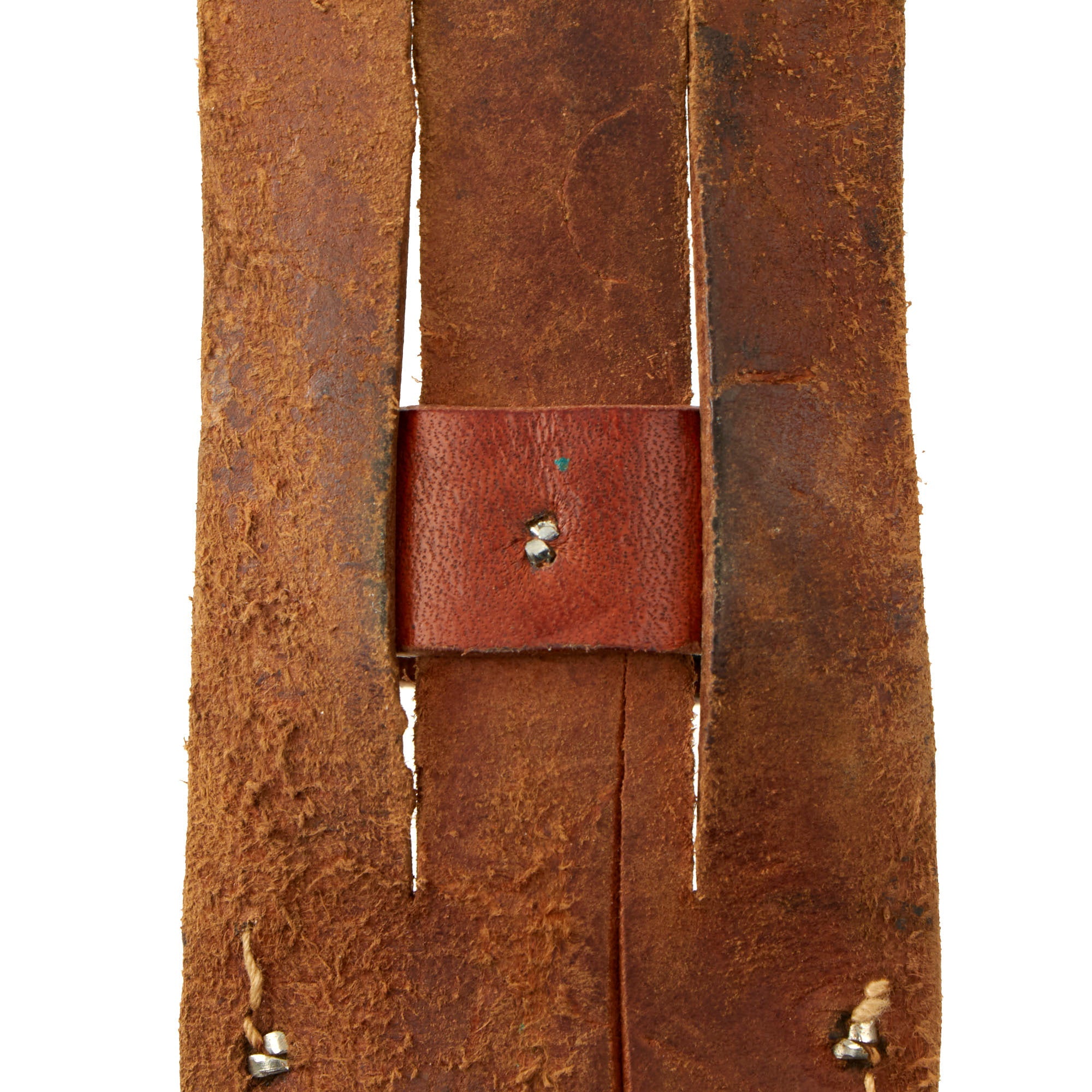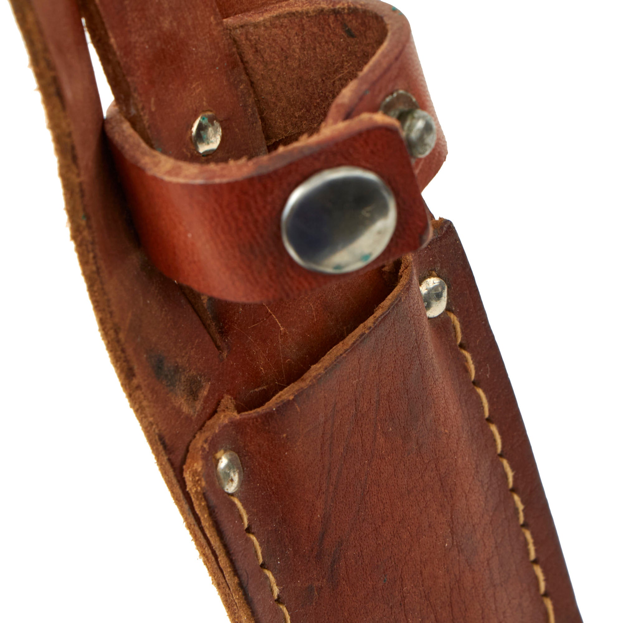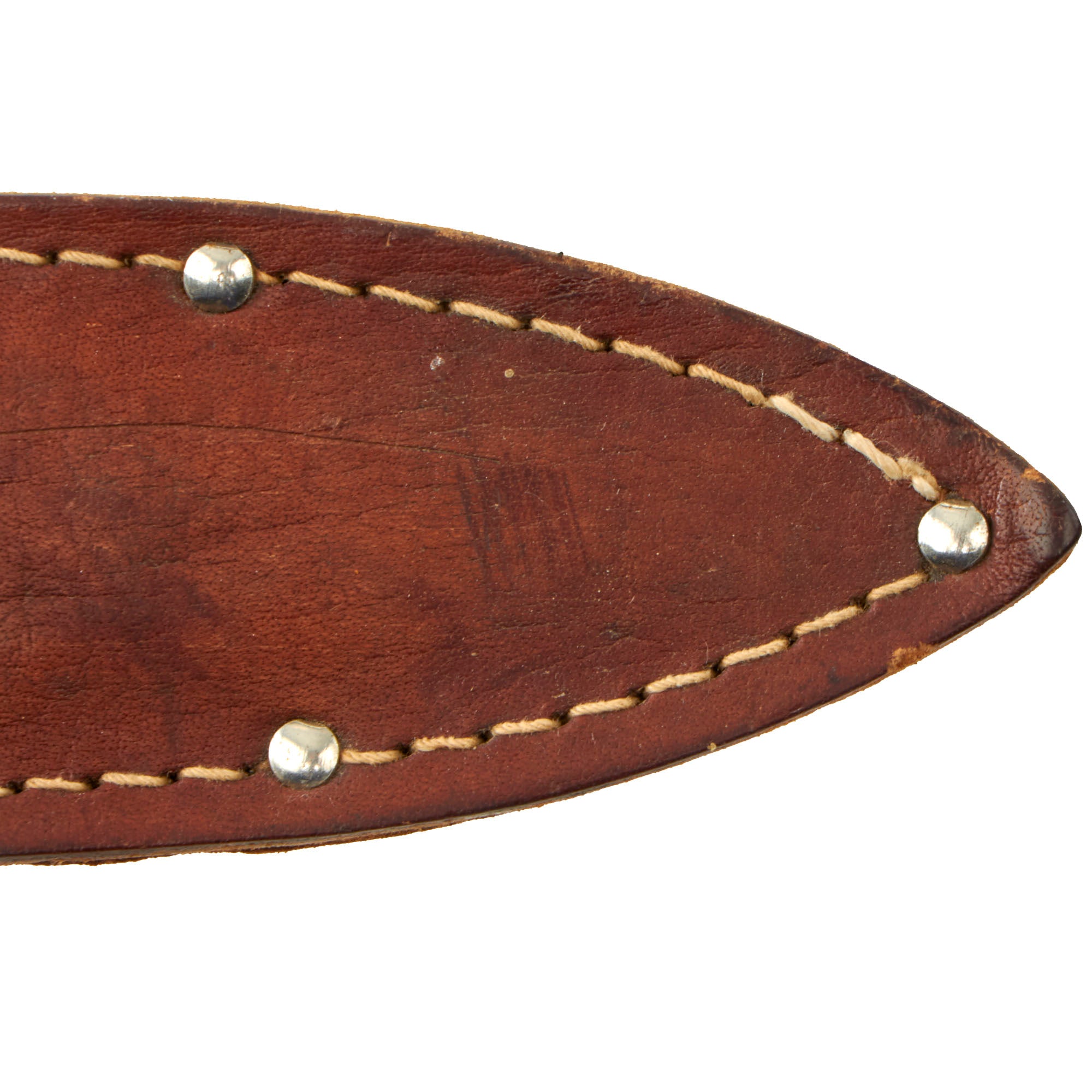 The leather sheath is intact and solid, and matches the "pancake" style these are usually found in. On the types with larger blades the sheathes were often marked by Herder, but the varieties with narrower blades commercially available sheaths were common.