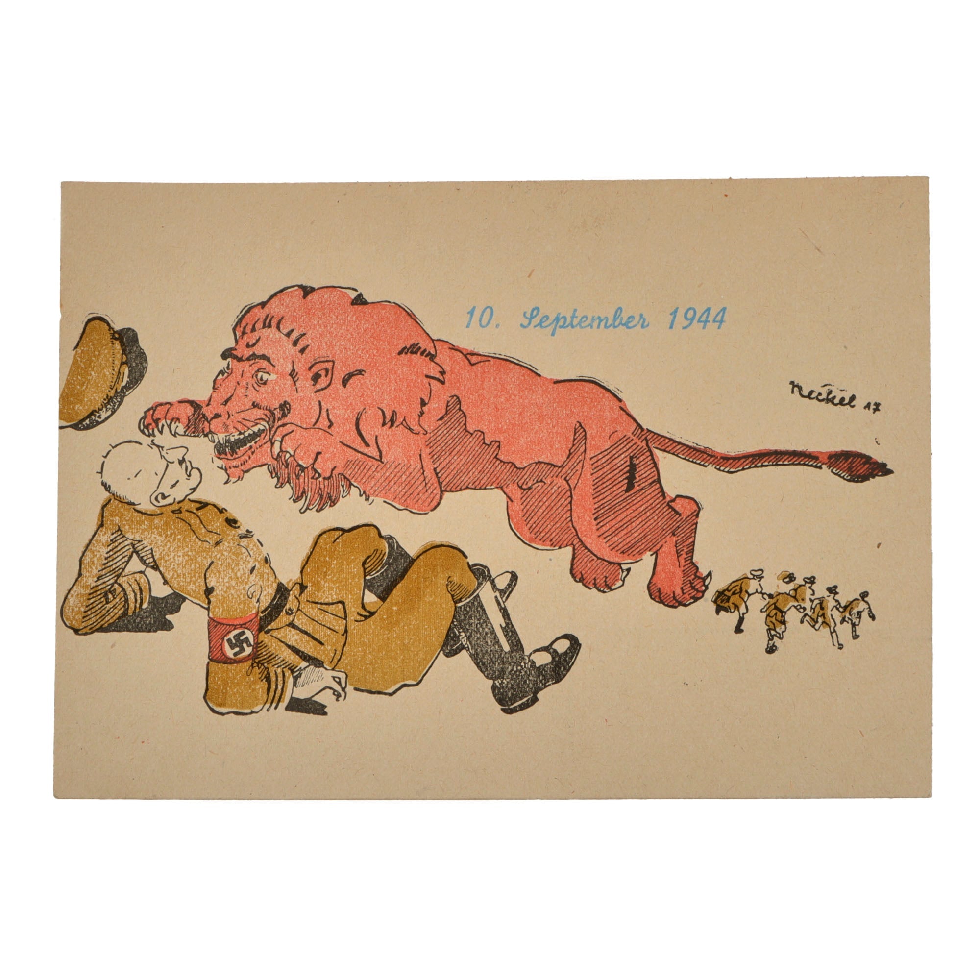 - September 10 1944 postcard showing lion about to maul AH.