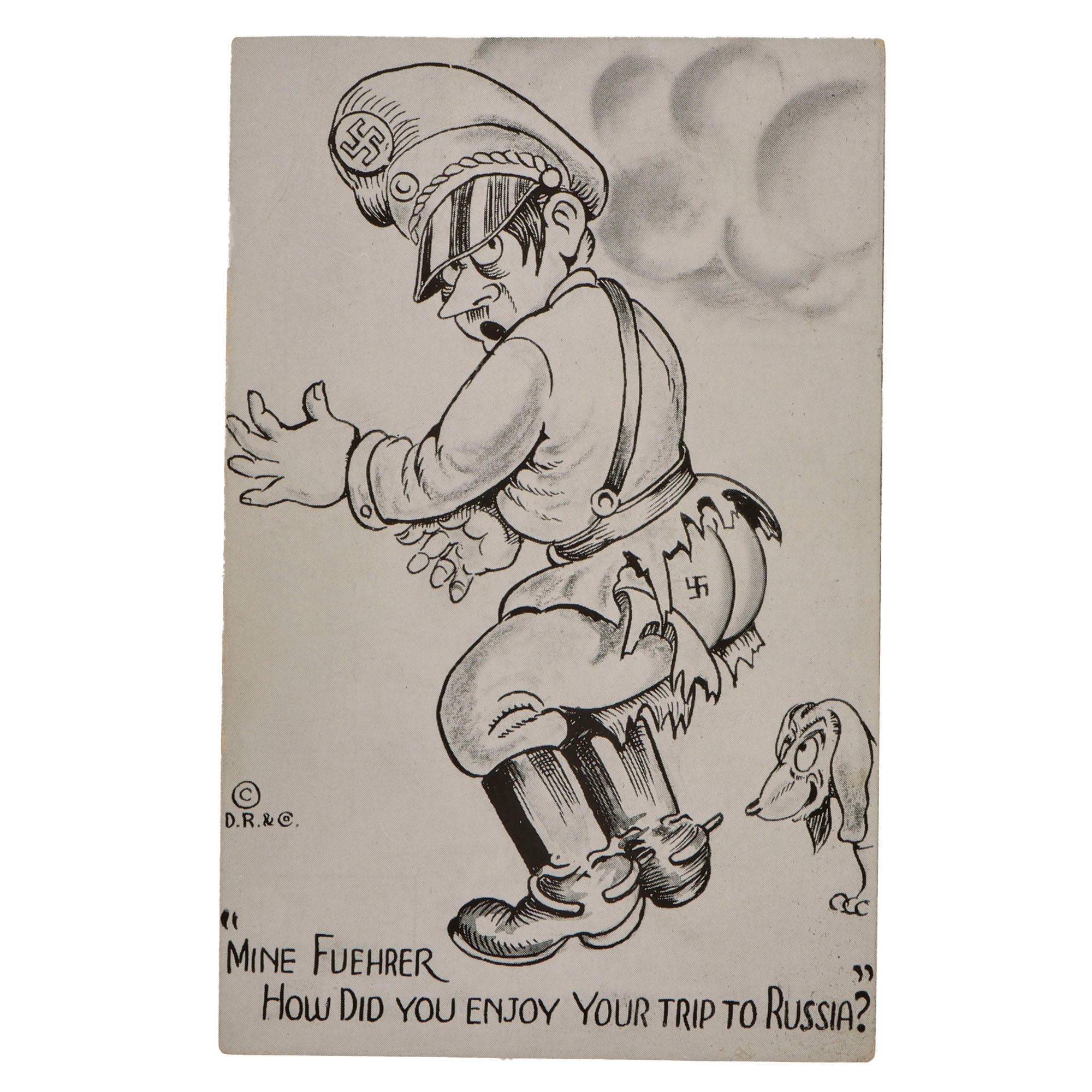 - “Mine Fuehrer” postcard showing AH with dog having ripped off his pants to show his buttocks.