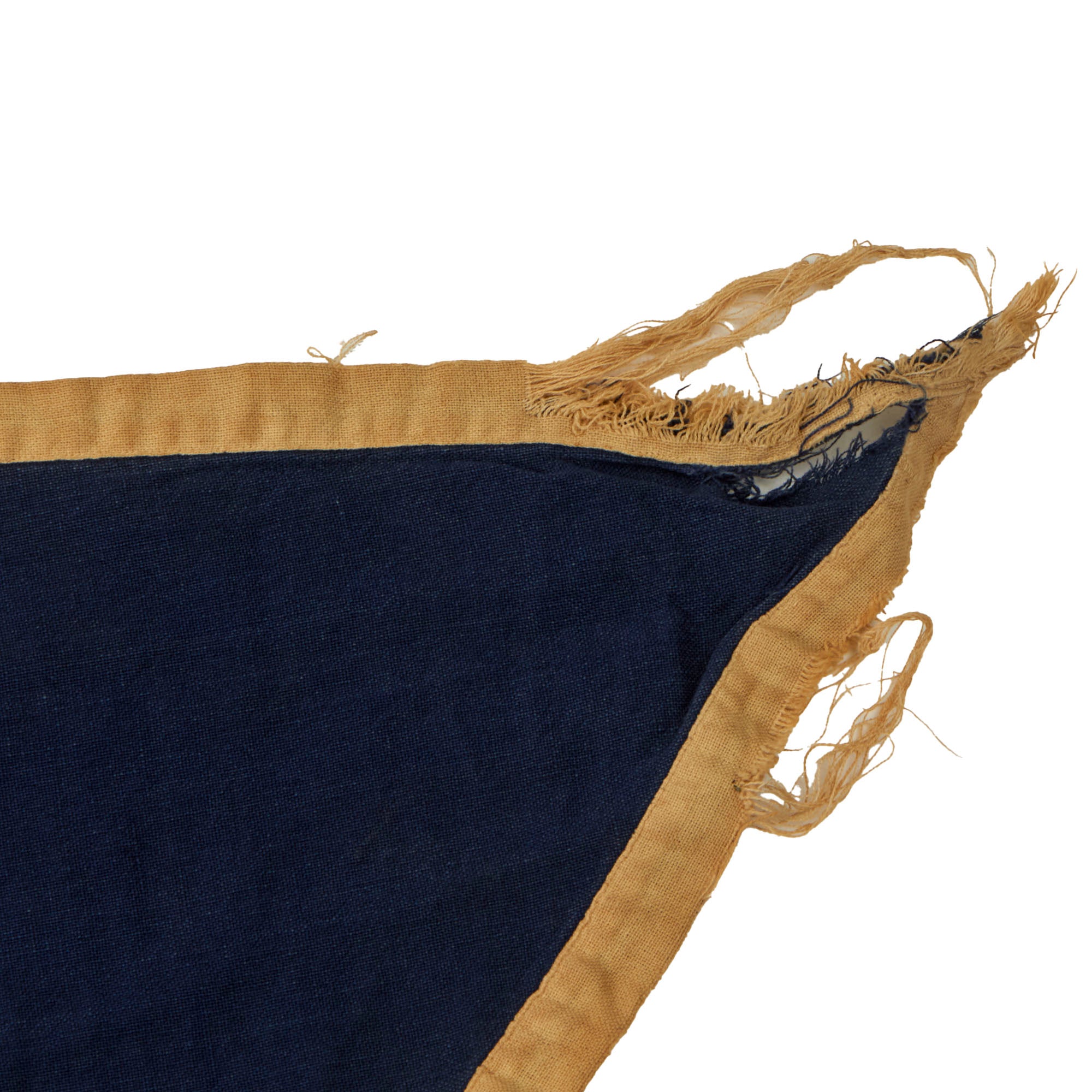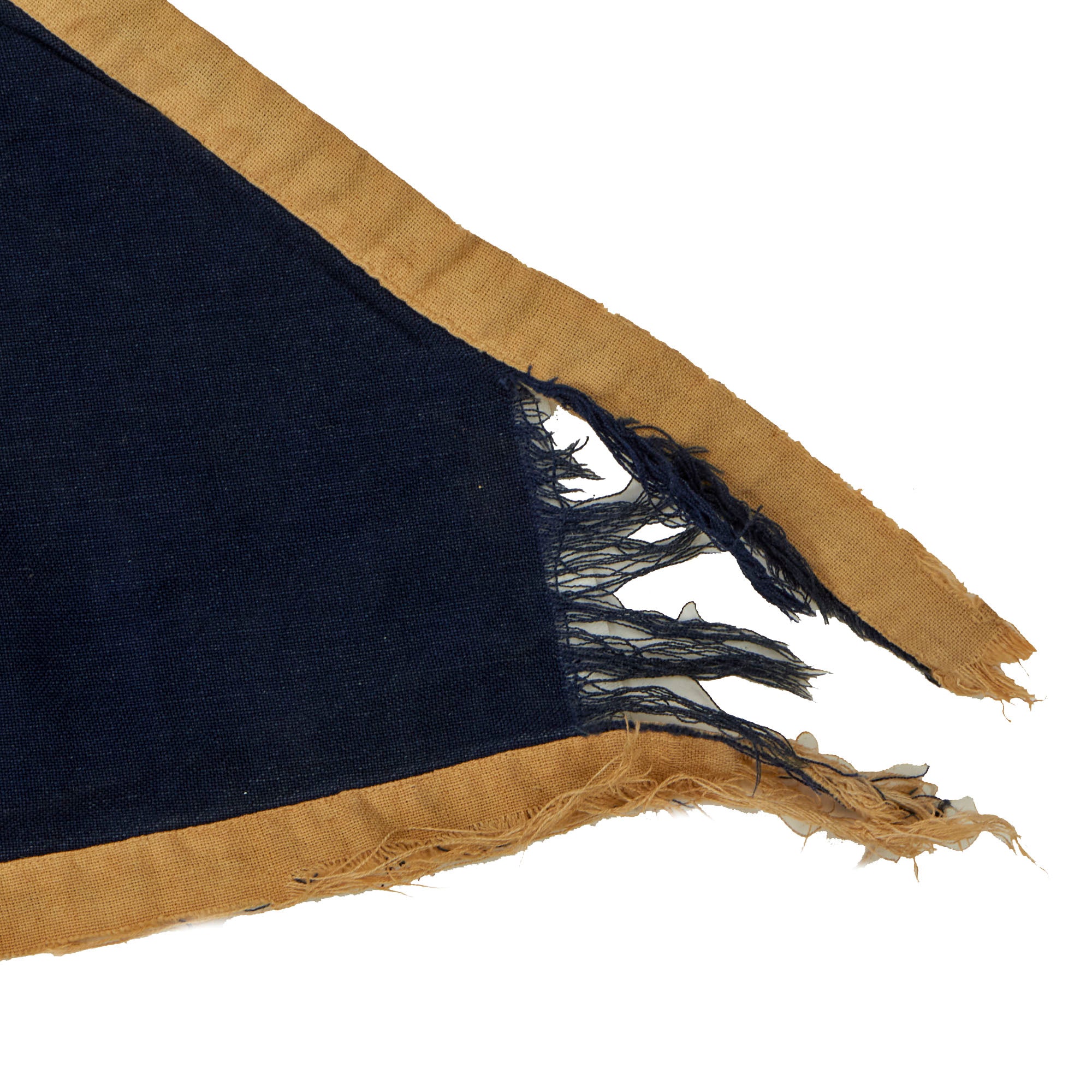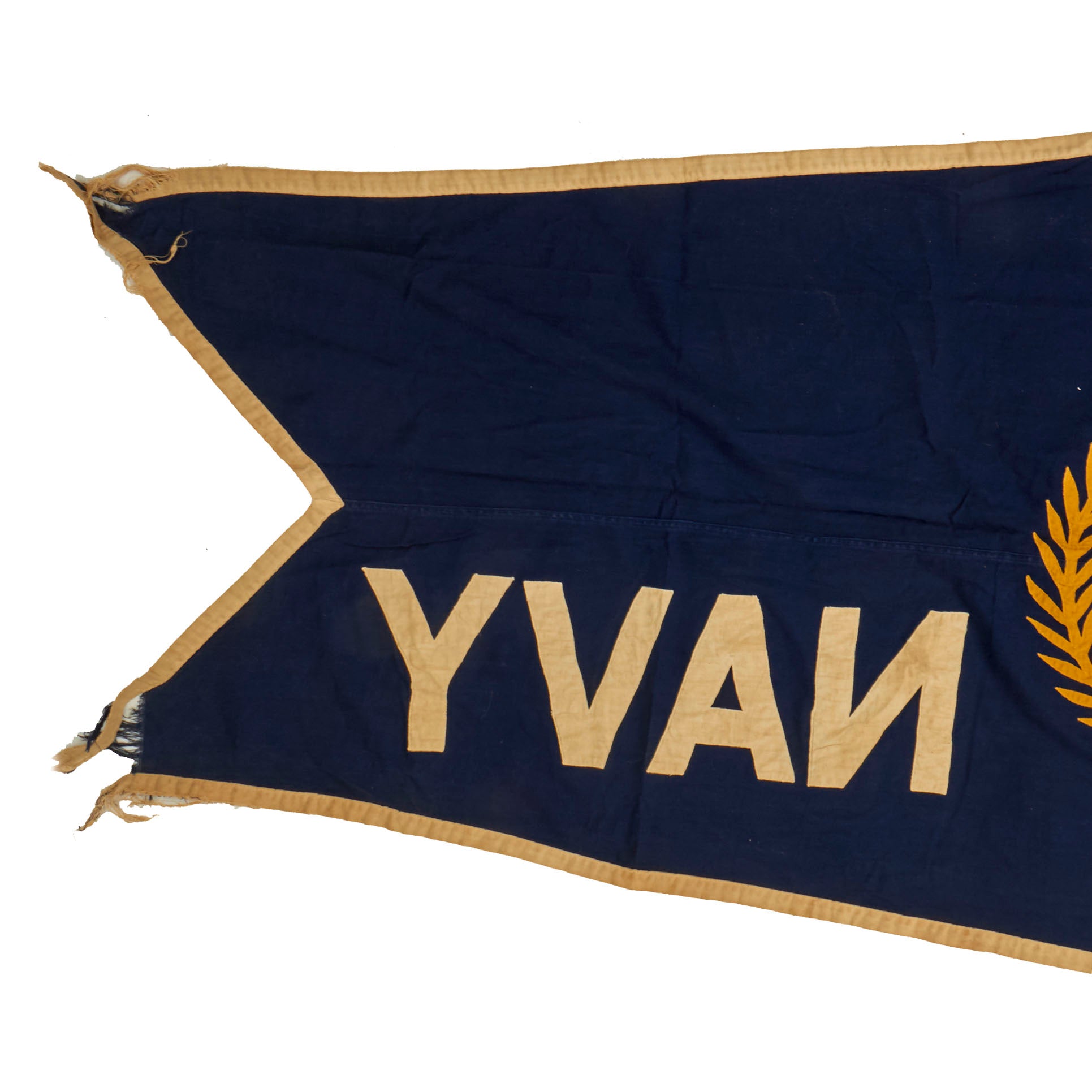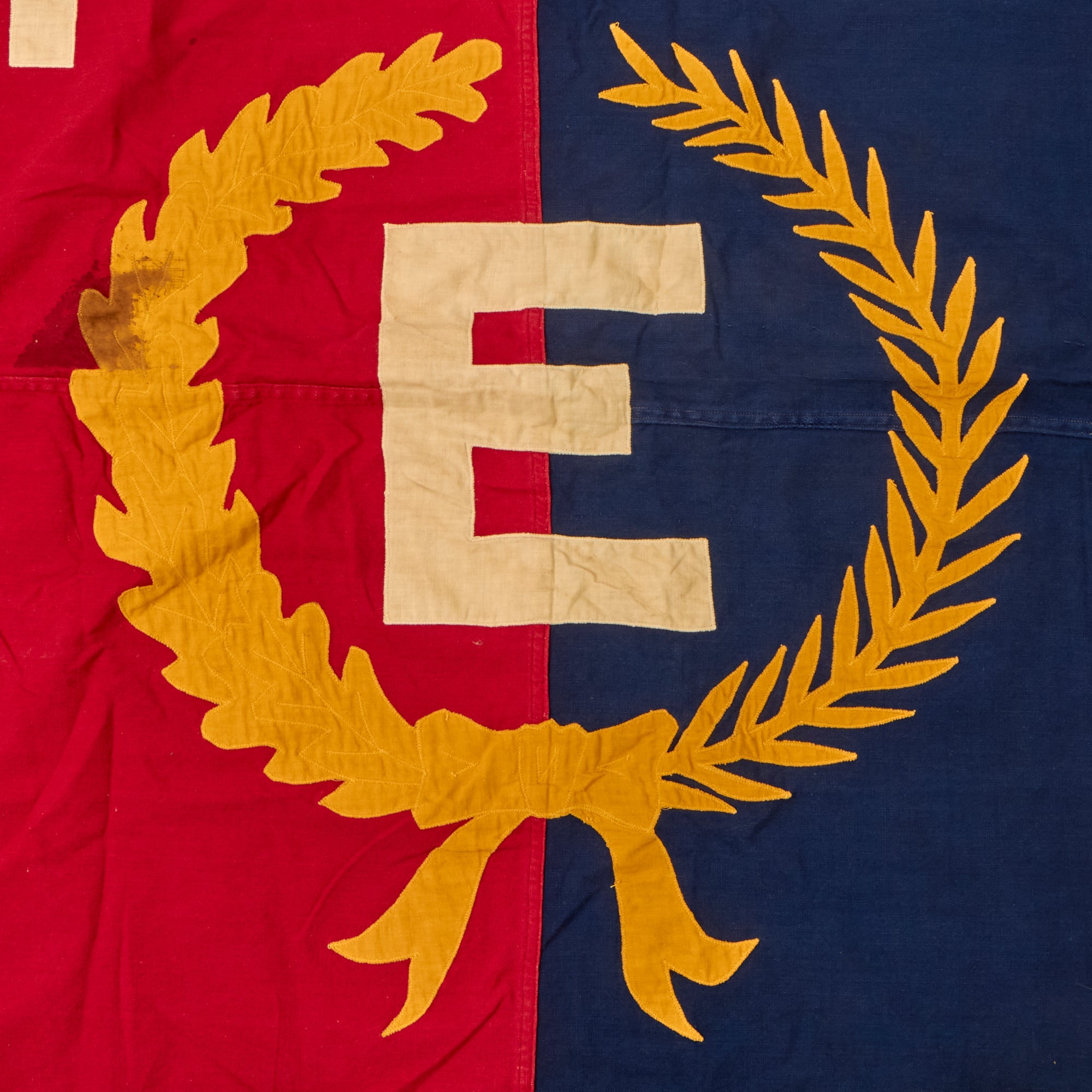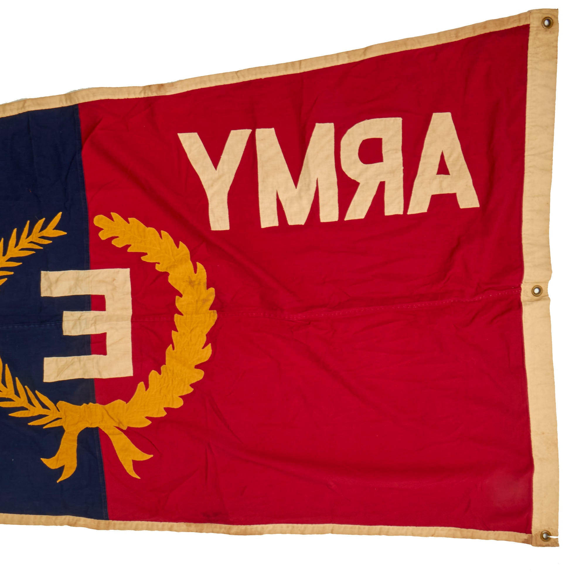 • The award consisted of a pennant for the production plant and emblems for all employees in the plant at the time the award was made. The pennant is a triangular swallowtail (V-Shape) with a white border, with a capital E within a yellow wreath of oak and laurel leaves on a vertical divided blue and red background. ARMY is on the red background and NAVY on the blue background. The condition is absolutely lovely but does show signs of extensive use. There are scattered small holes throughout as well as age toning and staining, but nothing subtracts from the beauty of the award.