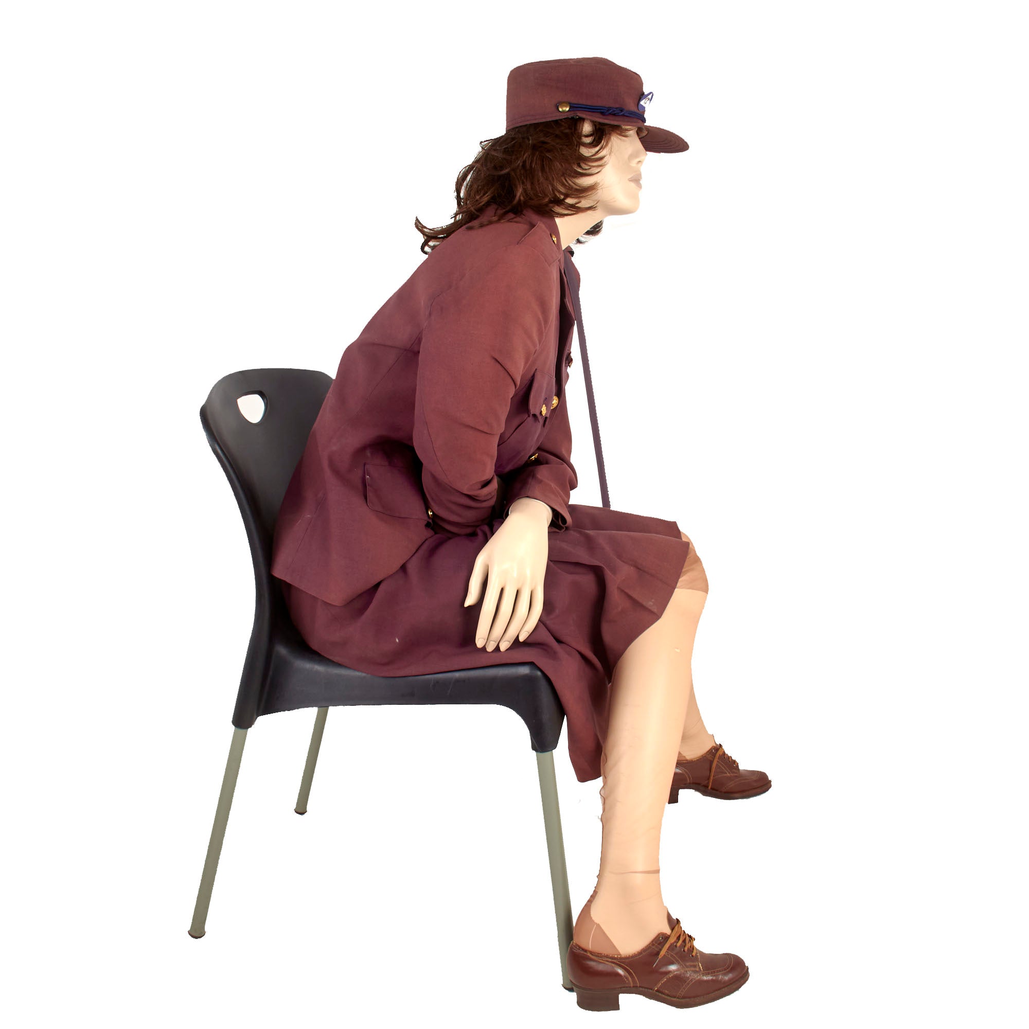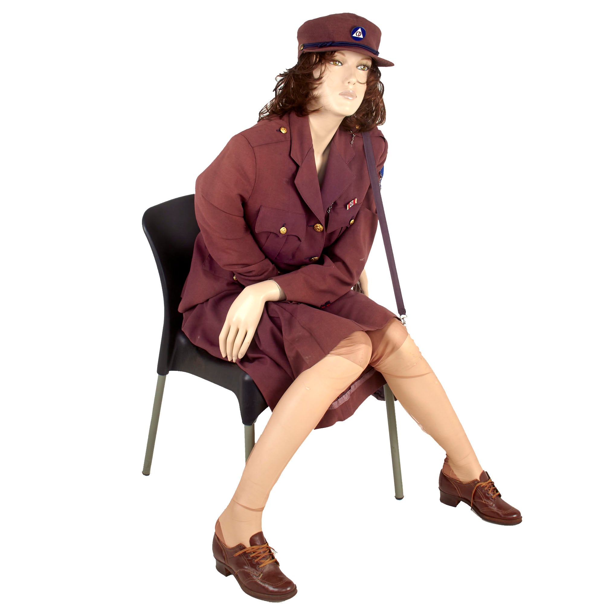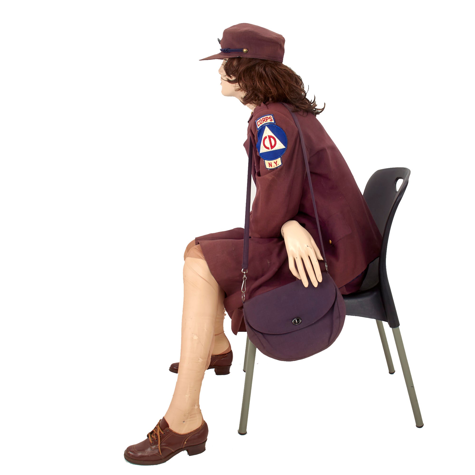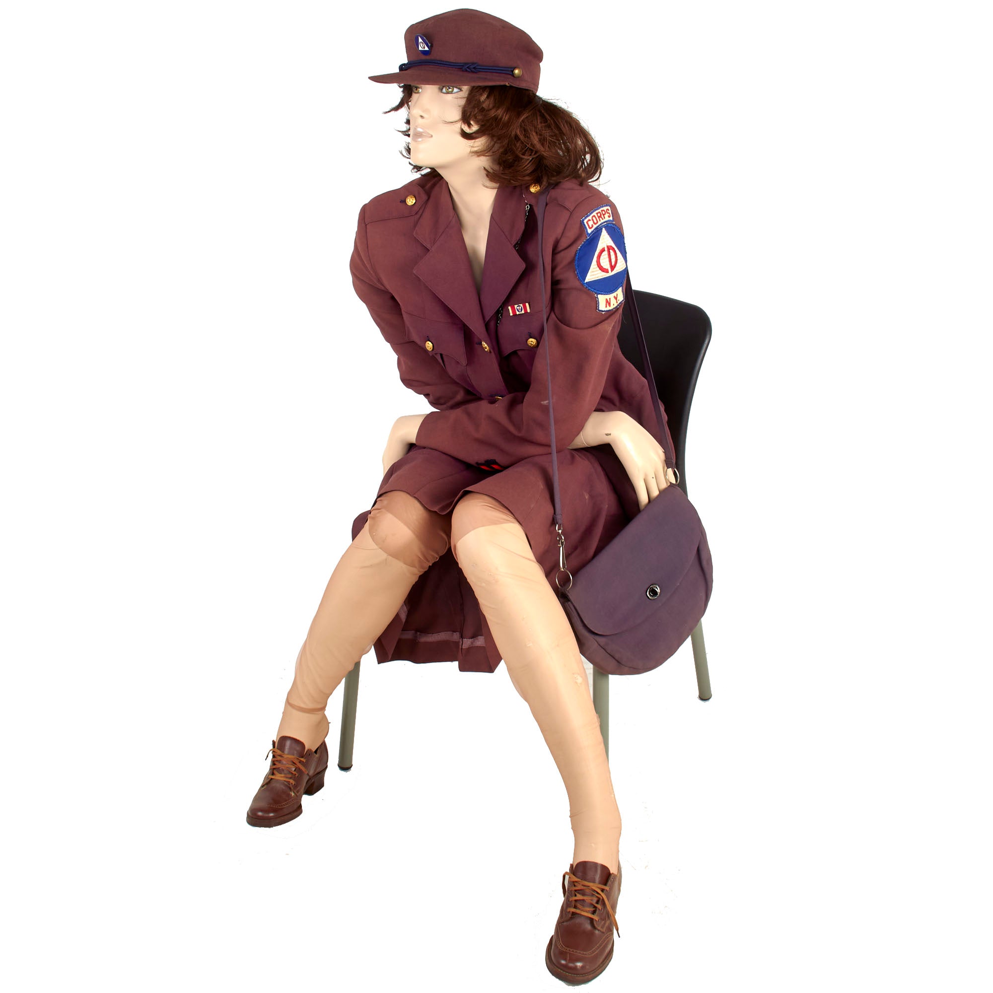 Original Items: Only One Set Available. This is an incredible, “ready to display” uniform set, complete on a female mannequin. The uniform is of a WWII period service uniform belonging to woman Civil Defense Air Raid Warden from New York State. The complete uniform consists of an original Civil Defense marked whistle, matching service hat and skirt, purse with carry strap, a small photo and glove. There is a Civil Defense pin above the left pocket and a New York Civil Defense shoulder patch. On the lower left sleeve has 2 service stripe style hash marks, more than likely denoting 6 months of service. The tank museum added a correct style Civil Defense helmet, a pair of Oxford style shoes and a correct color of stockings to complete the outward appearance.