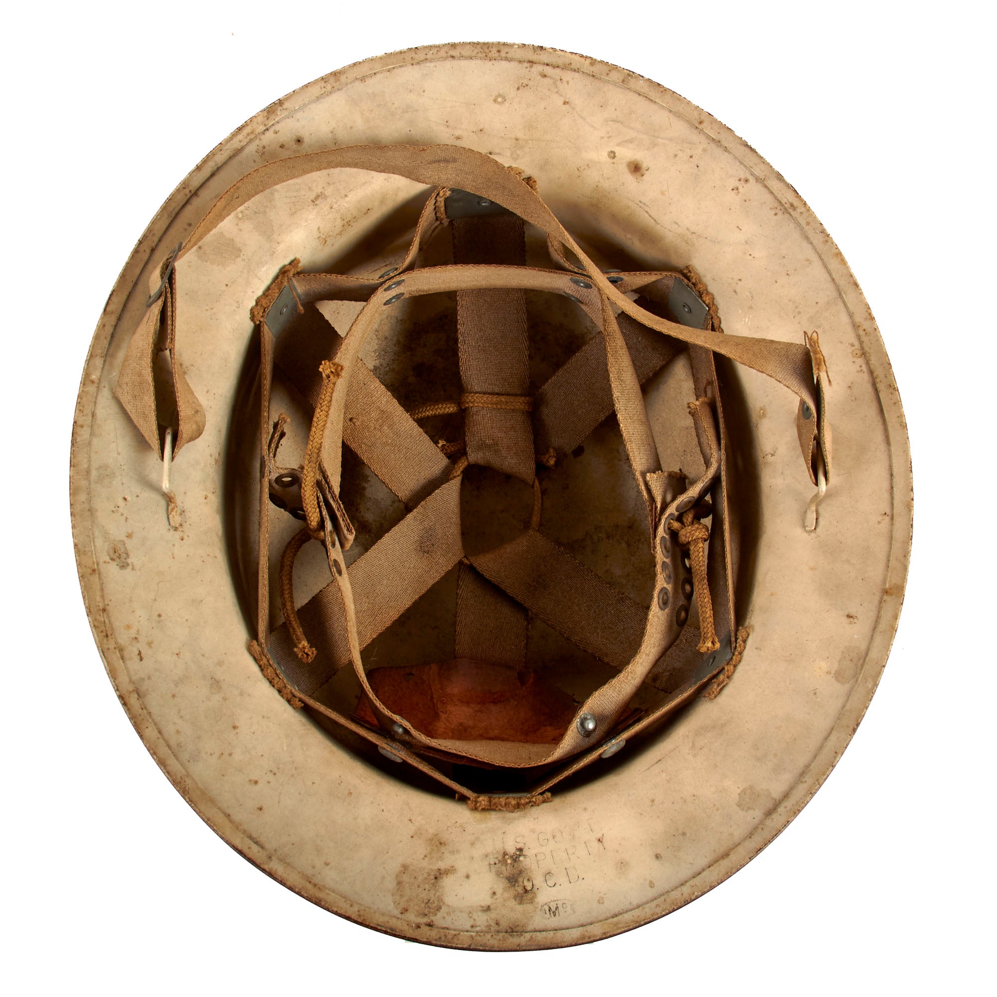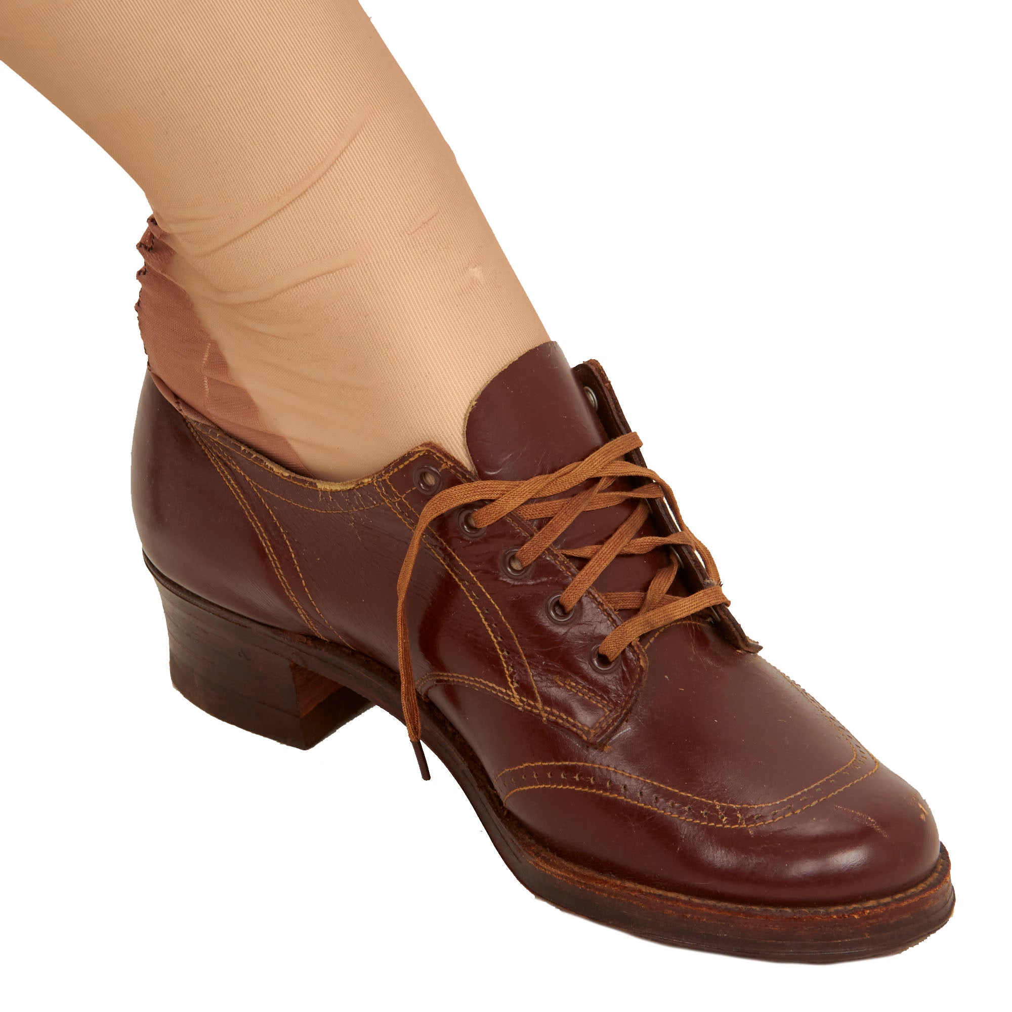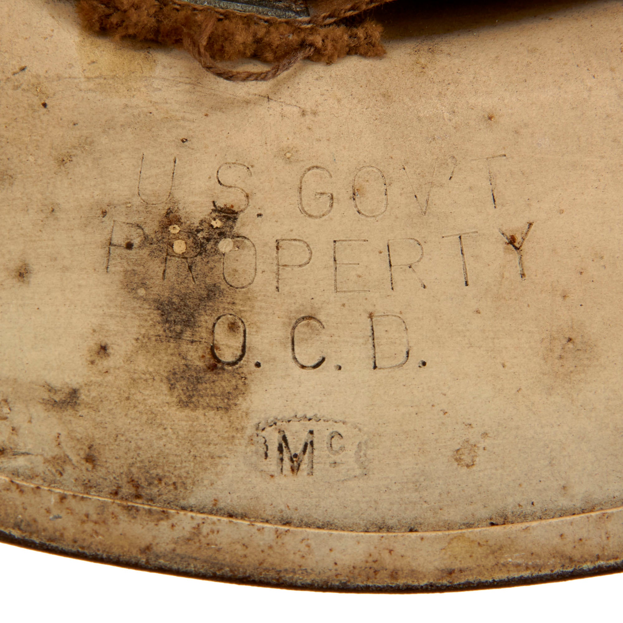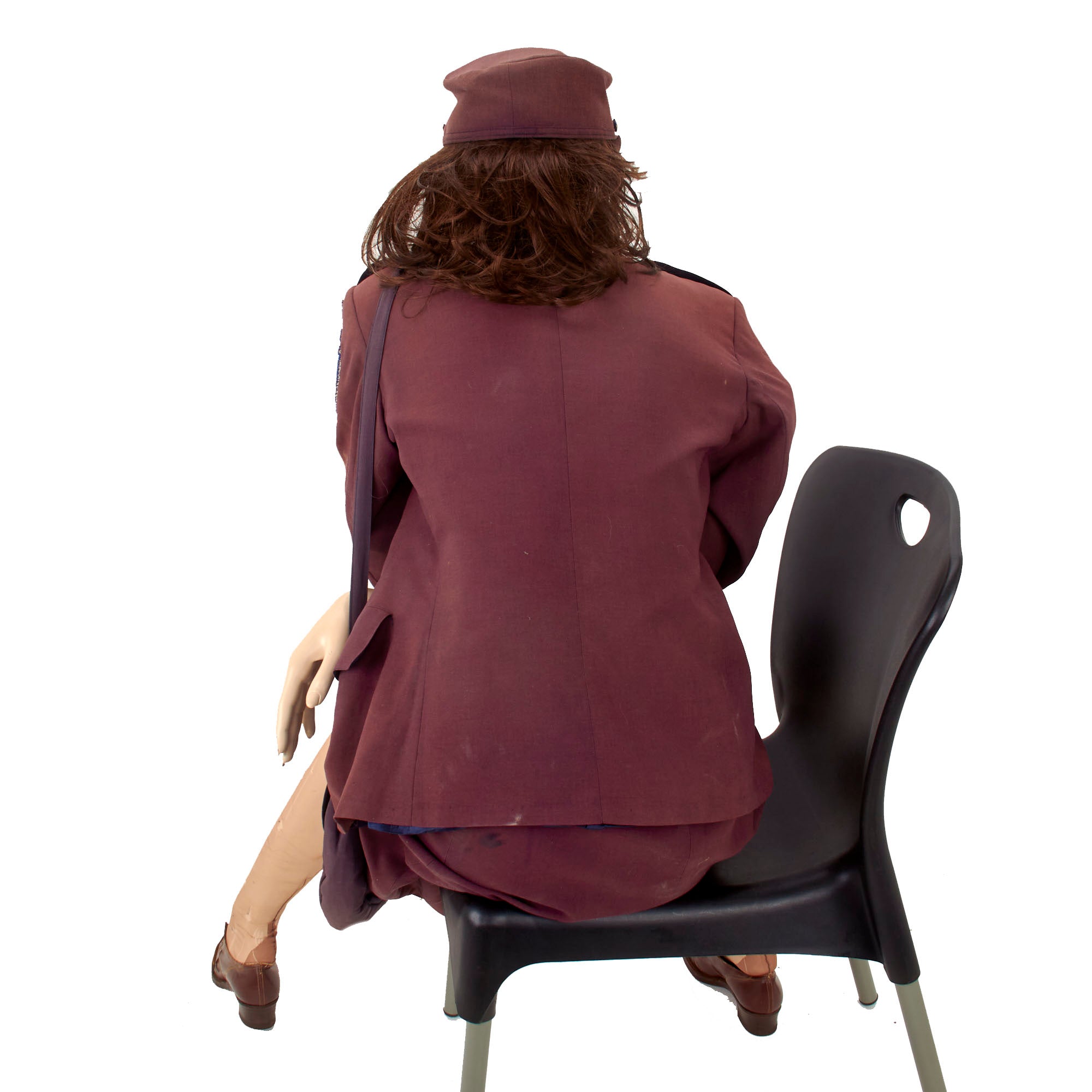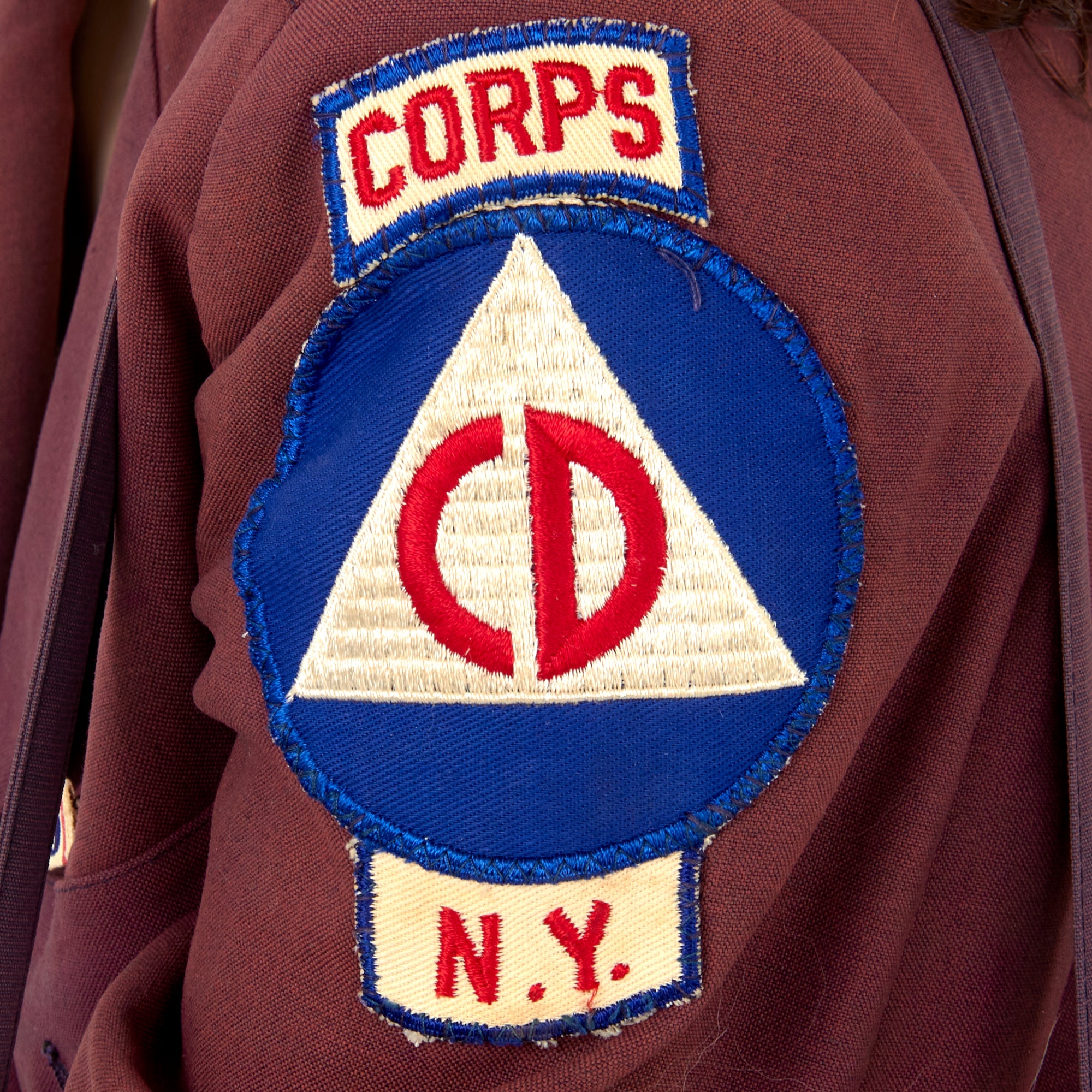 Original Items: Only One Set Available. This is an incredible, “ready to display” uniform set, complete on a female mannequin. The uniform is of a WWII period service uniform belonging to woman Civil Defense Air Raid Warden from New York State. The complete uniform consists of an original Civil Defense marked whistle, matching service hat and skirt, purse with carry strap, a small photo and glove. There is a Civil Defense pin above the left pocket and a New York Civil Defense shoulder patch. On the lower left sleeve has 2 service stripe style hash marks, more than likely denoting 6 months of service. The tank museum added a correct style Civil Defense helmet, a pair of Oxford style shoes and a correct color of stockings to complete the outward appearance.
