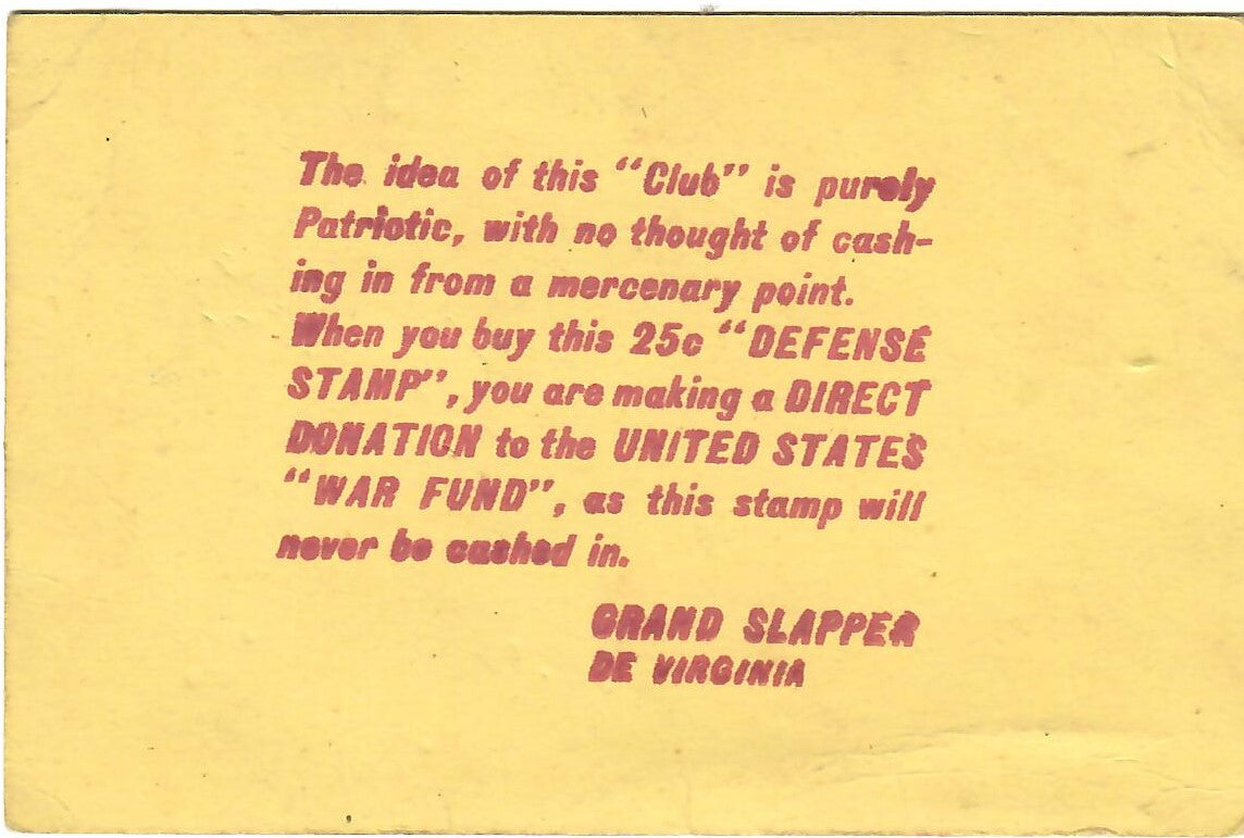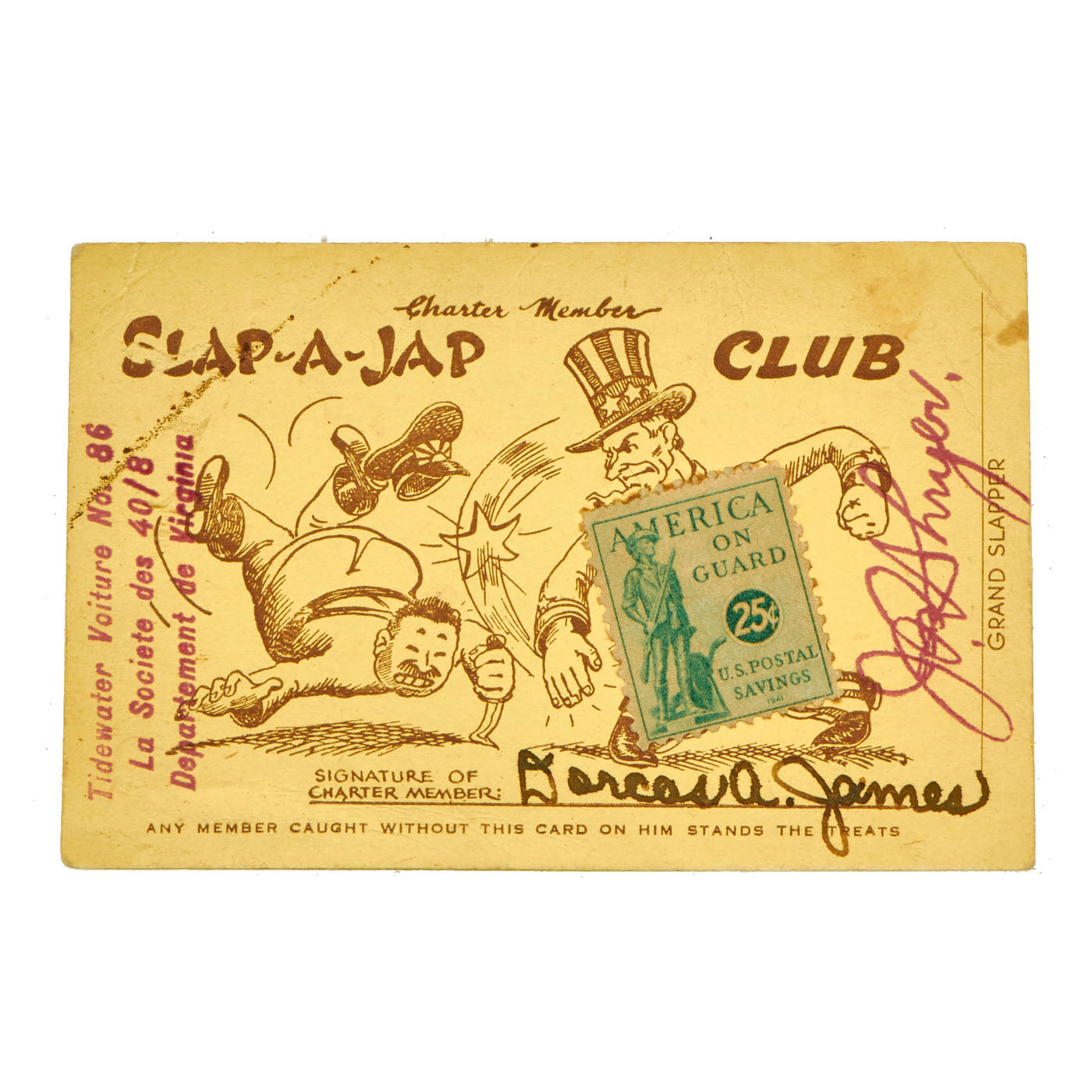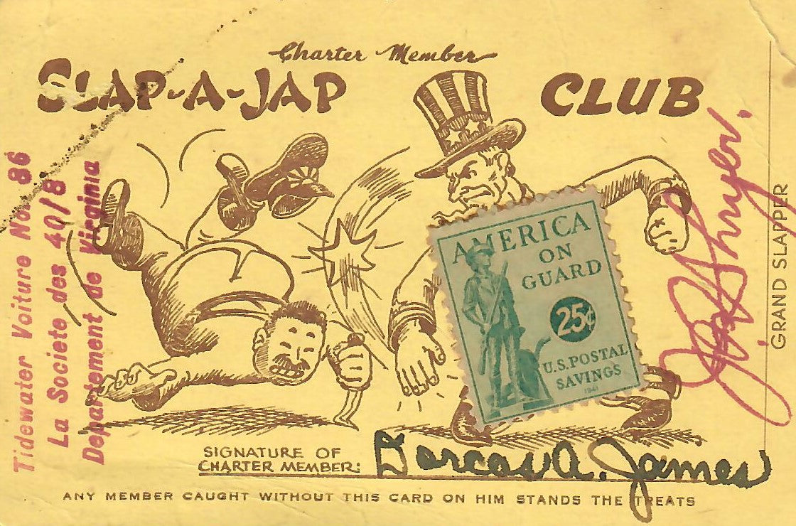 Soon after President Franklin D Roosevelt had proclaimed 7 December ‘a date which will live in infamy’, anti-Japanese paraphernalia and propaganda surfaced across the United States. In late 1941, the American Legion, in Jonesboro, Arkansas, formed the “Slap-A-Jap Club”. The public was encouraged to join by purchasing one 25c Defense Stamp per week for the duration of the war and these “Club Cards” were made.