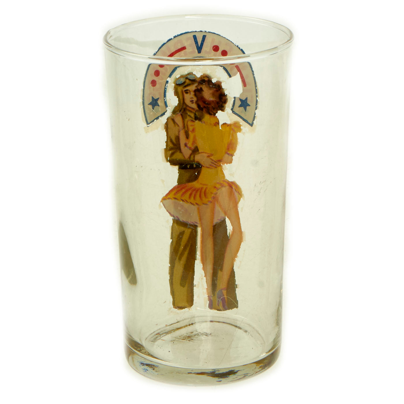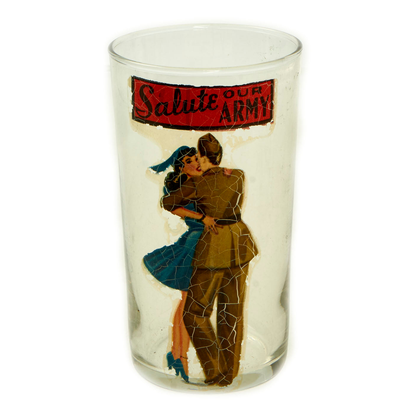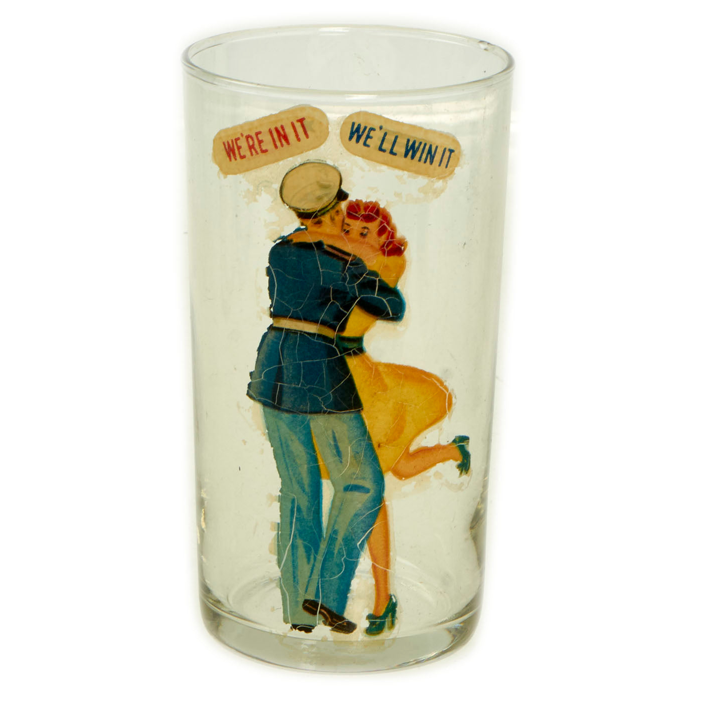 The condition of these homefront glasses reflect long and proud use. Much of the original artwork is still highly visible, however, they clear coat that was applied to the decals is worn and flaking in areas. The colors are still vibrant and easily discernible.