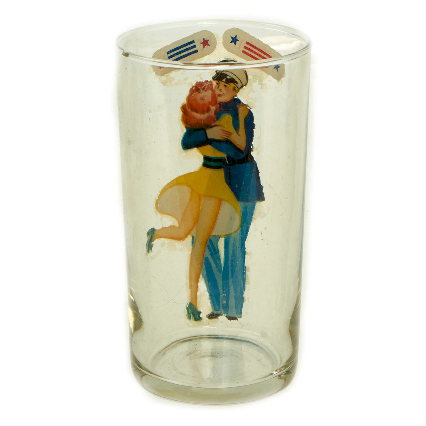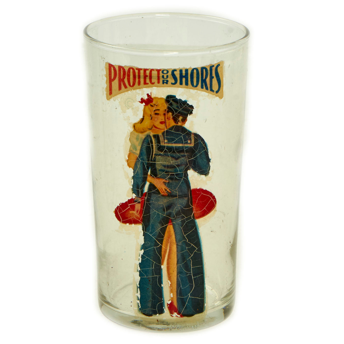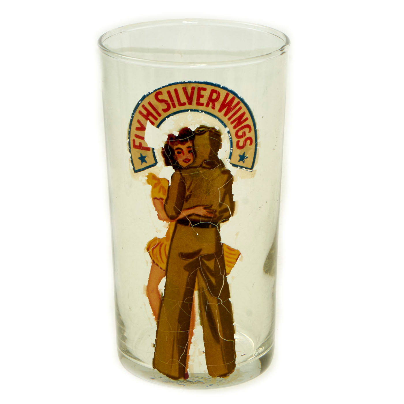 The condition of these homefront glasses reflect long and proud use. Much of the original artwork is still highly visible, however, they clear coat that was applied to the decals is worn and flaking in areas. The colors are still vibrant and easily discernible.