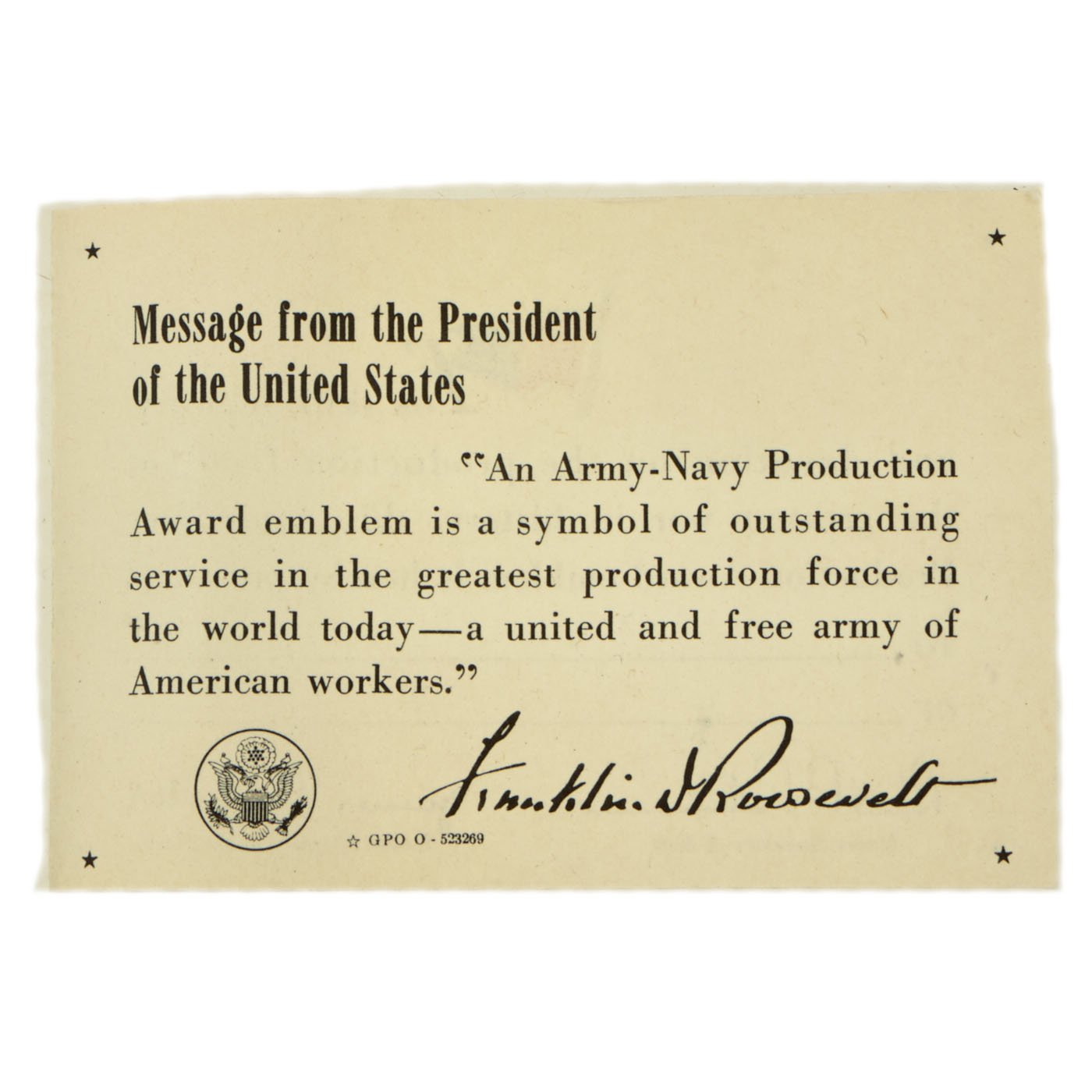 The Army-Navy "E" Award was an honor presented to companies during World War II whose production facilities achieved "Excellence in Production" ("E") of war equipment. The award was also known as the Army-Navy Production Award. The award was created to encourage industrial mobilization and production of war time materials. By war's end, the award had been earned by only 5% of the more than 85,000 companies involved in producing materials for the U.S. military's war effort.