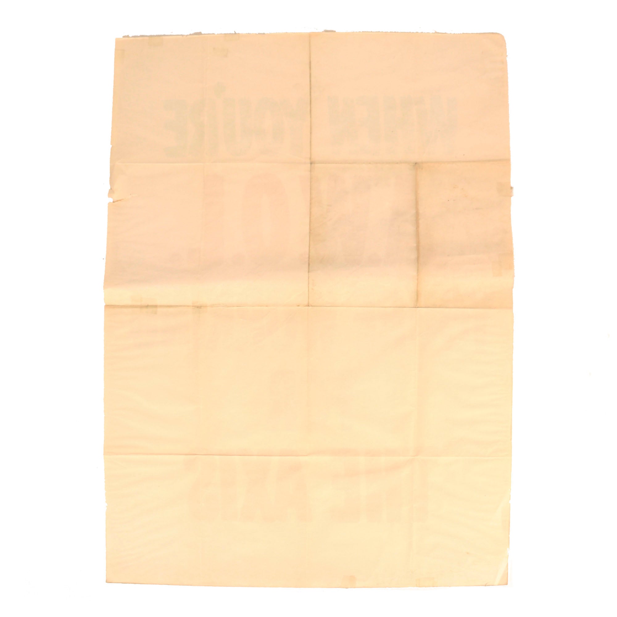 This poster reads “WHEN YOU’RE A.W.O.L. YOU’RE WORKING FOR THE AXIS”. This poster dates to 1942. It is marked in the bottom right corner to the War Production Board in Washington, D.C. The poster measures 28 ¼” x 40". The poster has several folds as shown which are an integral part of its character.