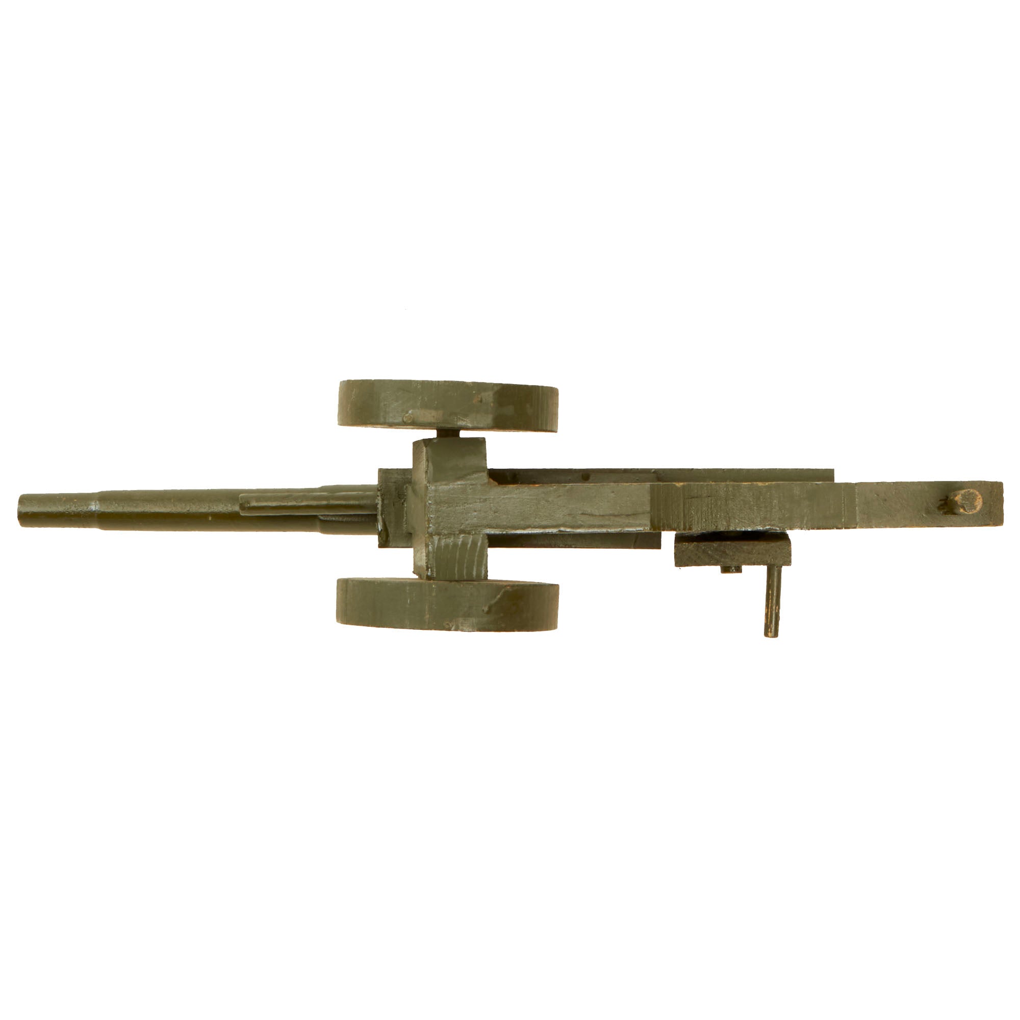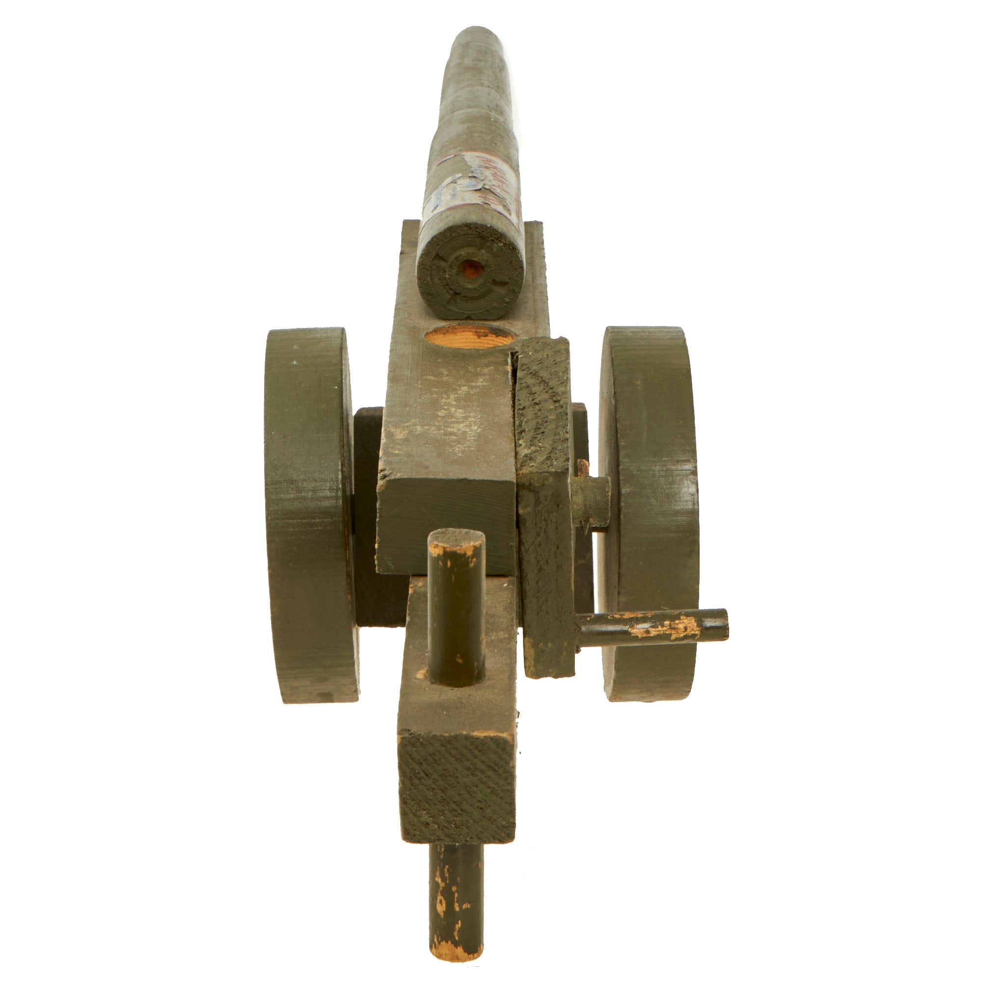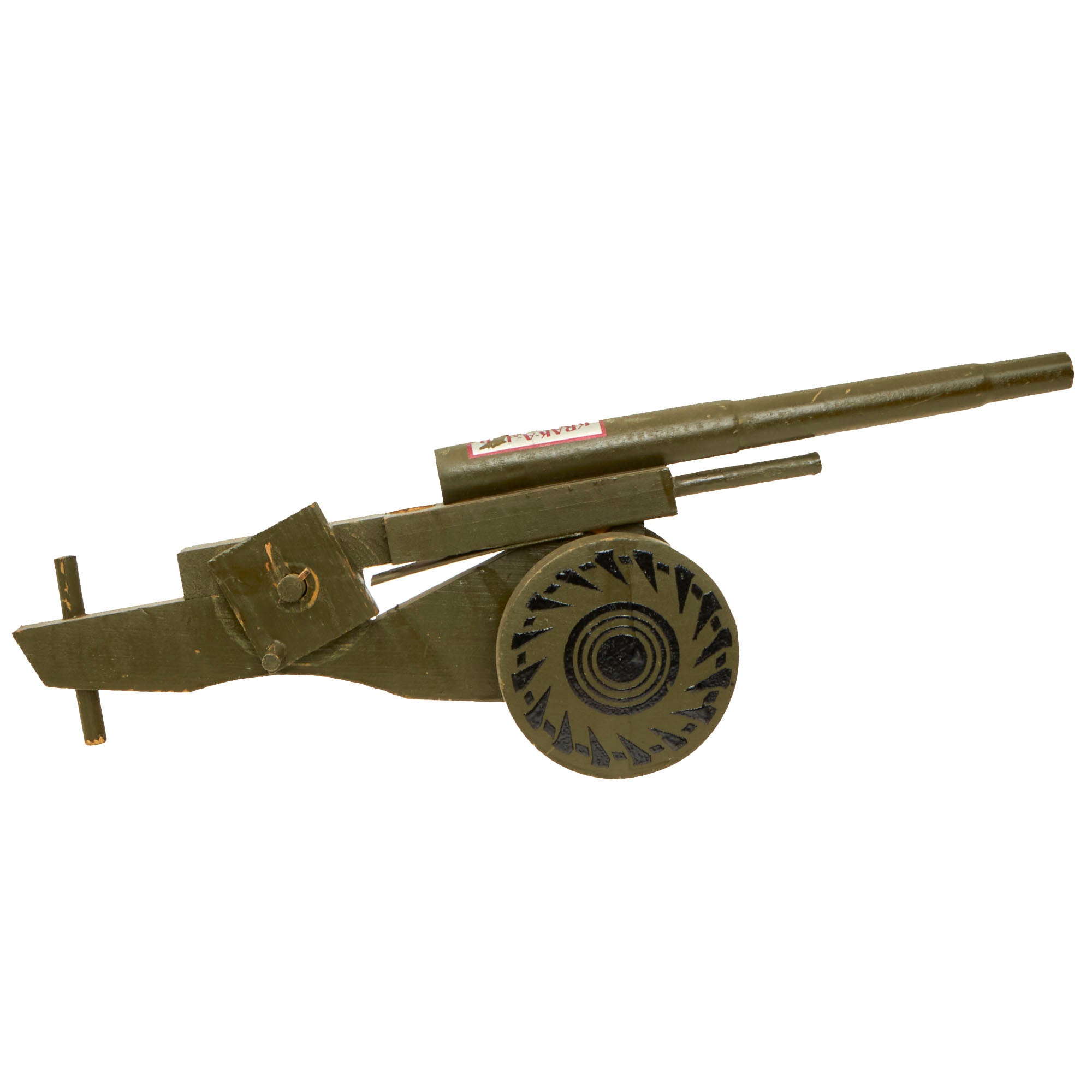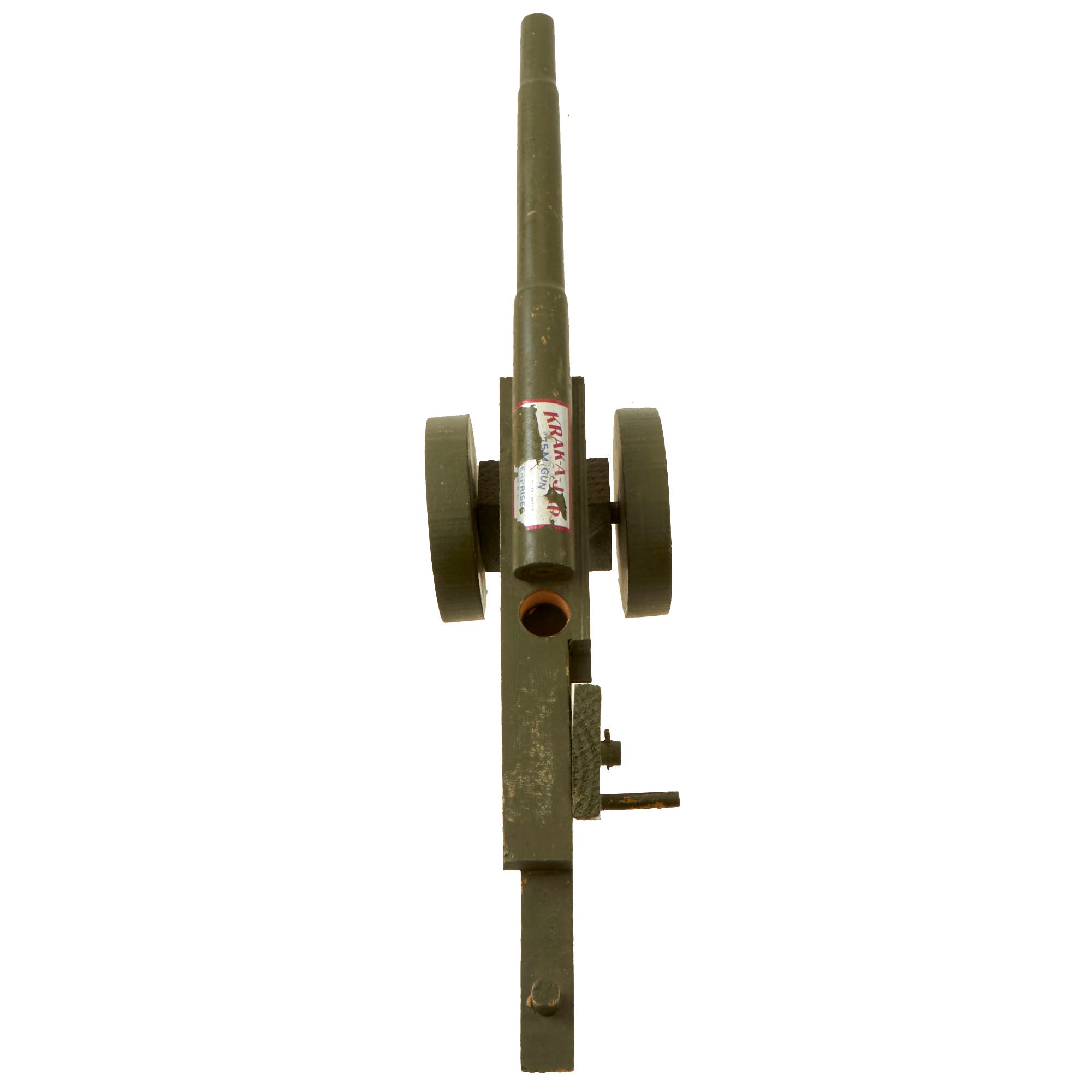 This is a prime example of one of the Anti-Japanese propaganda pieces, a toy "KRAK-A-JAP" Toy Wooden Cannon. There were various different makers and styles for these toys, which were made almost completely out of wood, which was plentiful and a "non-essential material" during the war, so it could be used freely without rationing. The toy cannon is painted with a lovely period OD green color, and is missing some of the original maker’s label on the breech end of the barrel, which from another example we had reads: