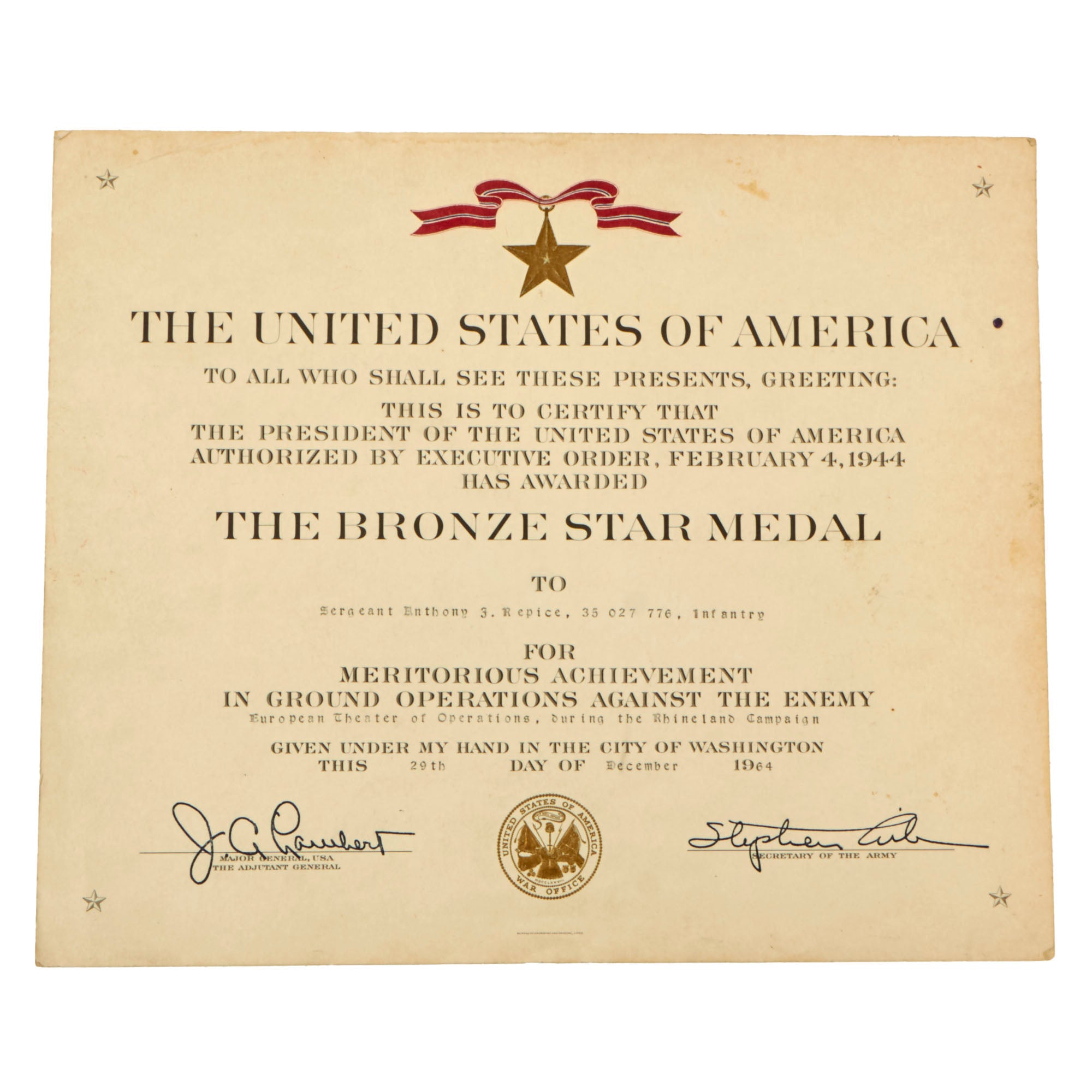 Original Item. One-of-a-Kind. Sergeant Anthony Joseph Repice was awarded the Bronze Star for Meritorious Achievement in Ground Operations against the enemy in the European Theater of Operations, during the Rhineland Campaign.