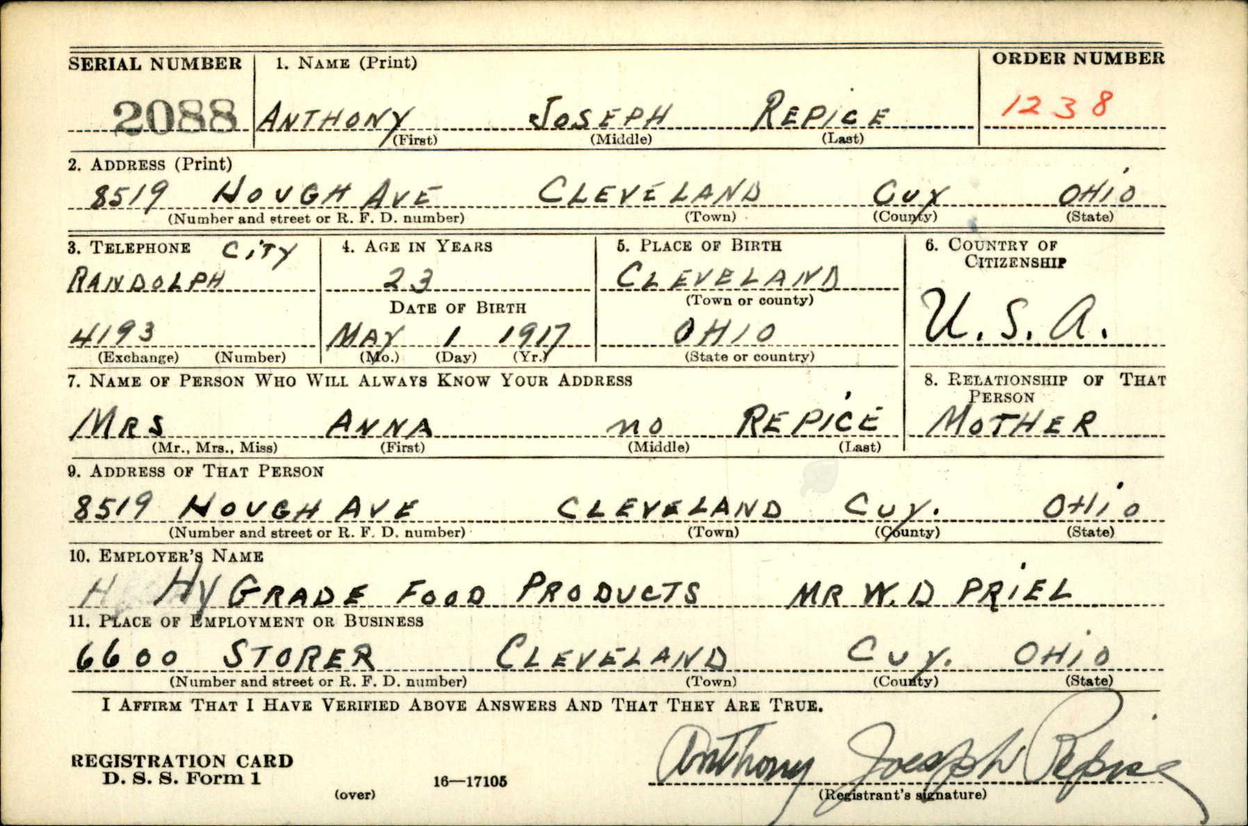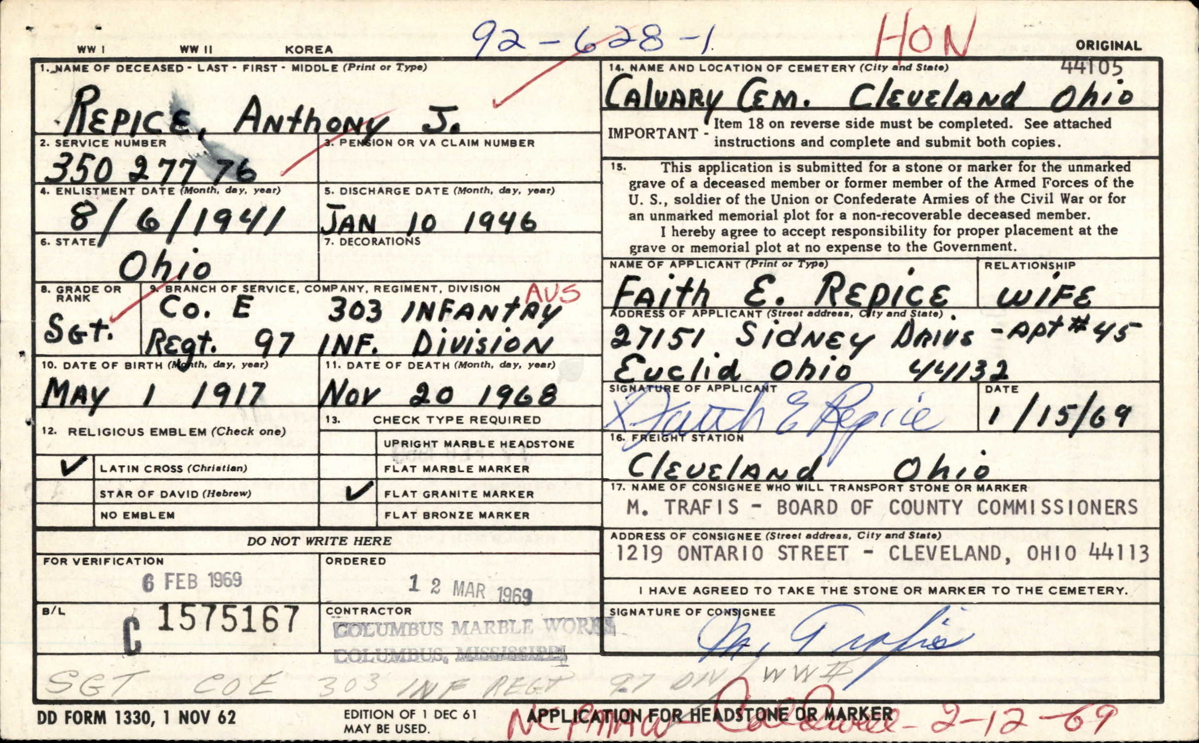 Anthony Joseph Repice was born on May 1st, 1917, in Cleveland, Ohio. He enlisted in the U.S. Army on August 6th, 1941, serial number 35027776, serving as a Sergeant in Company E, 303rd Infantry Regiment, 97th Infantry Division. Repice would see heavy combat in the European Theater of Operations, being awarded a Bronze Star for his service in the Rhineland Campaign.
