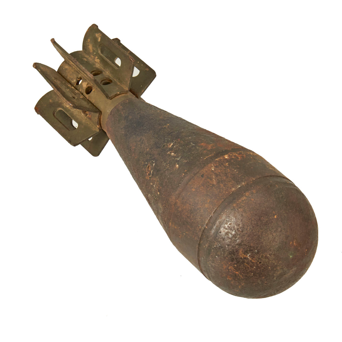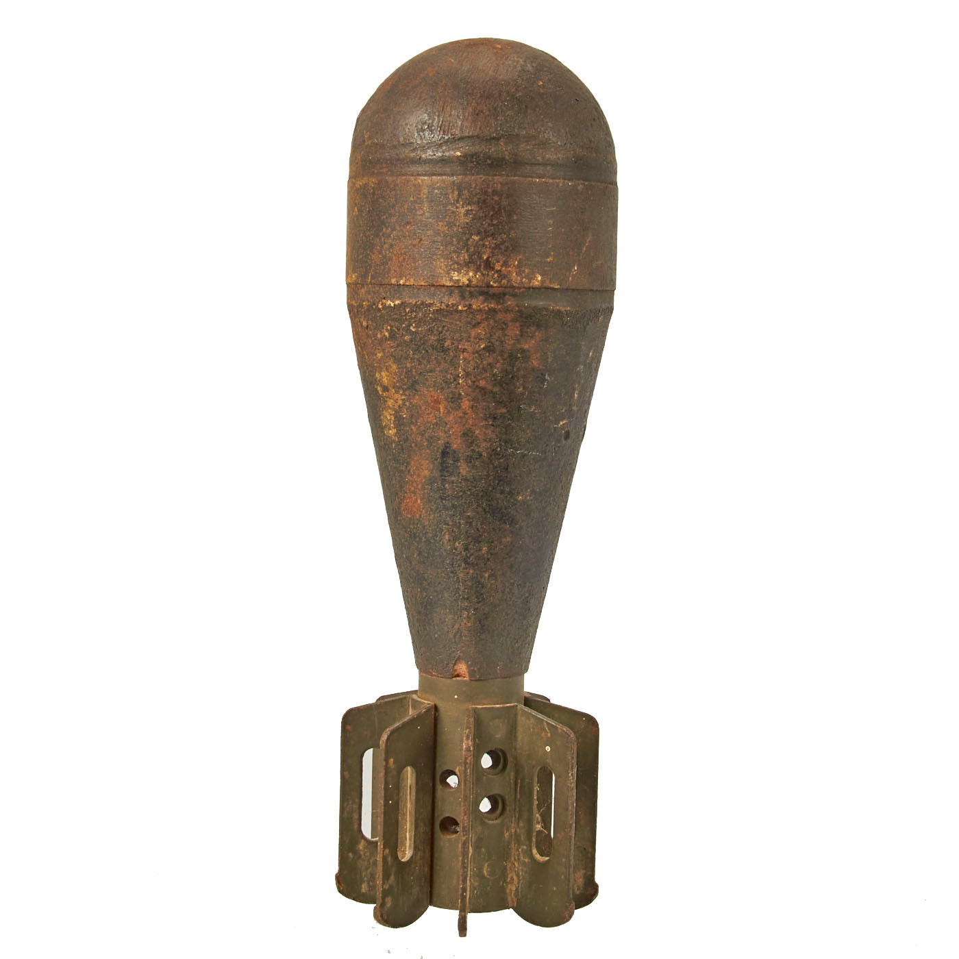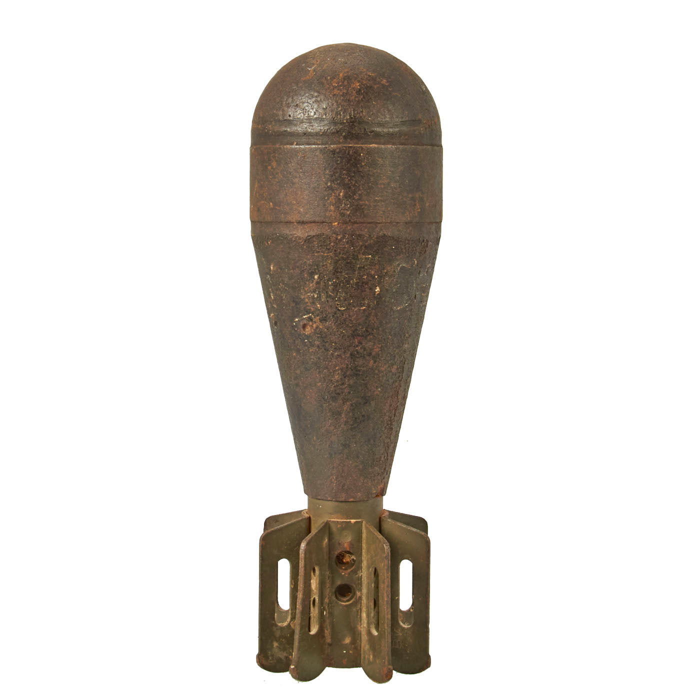 M69 Training Practice Round: These are hard to find WWII Era M69 Training / Practice rounds, as used with the U.S. WWII issue M2 60mm Mortar. This mortar also continued to be used during the Korean war, and into the Vietnam era. The training round itself is a shell with a cast iron body, inert filler, and detachable fin assembly used to train recruits in firing. The cast iron body is reusable and the fin assembly can be replaced if damaged. These were usually refinished and painted almost after every training session, but this one appears to have never been repainted. The fin assembly appears to be without damage and does not have a date stamped into it.
