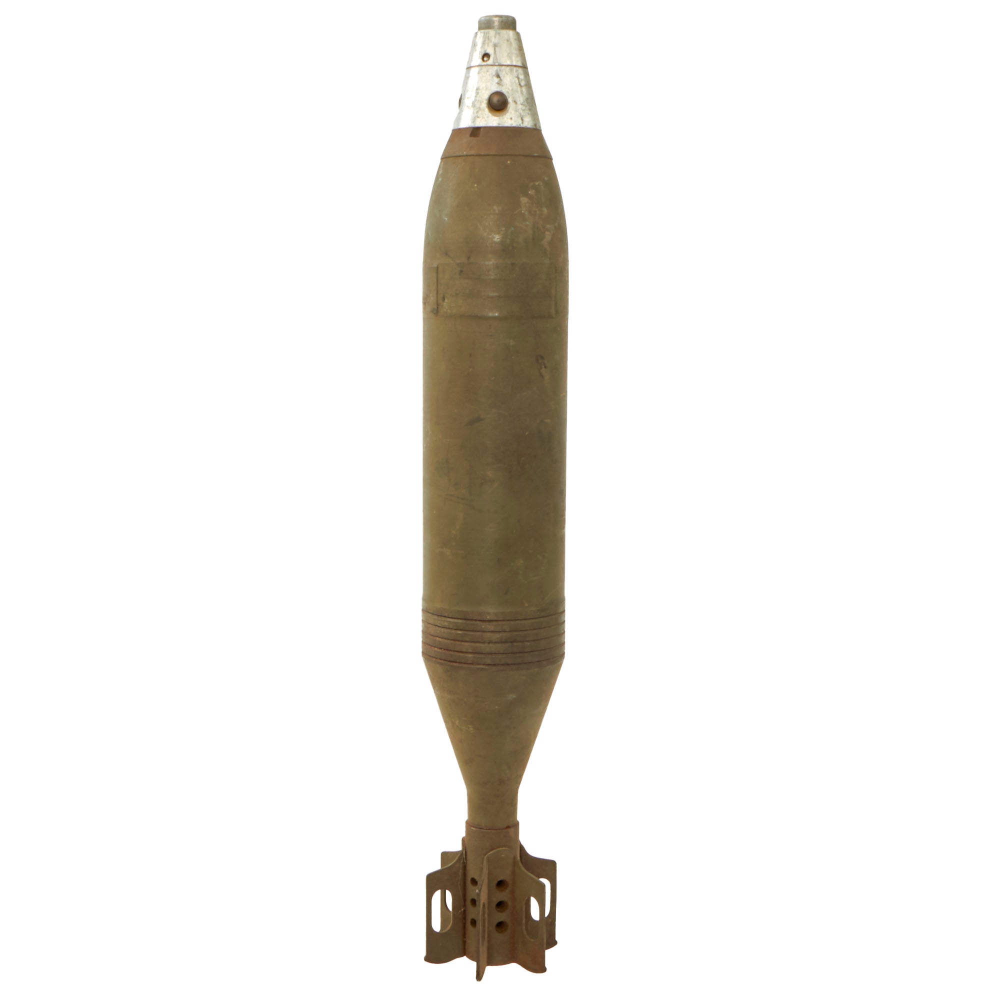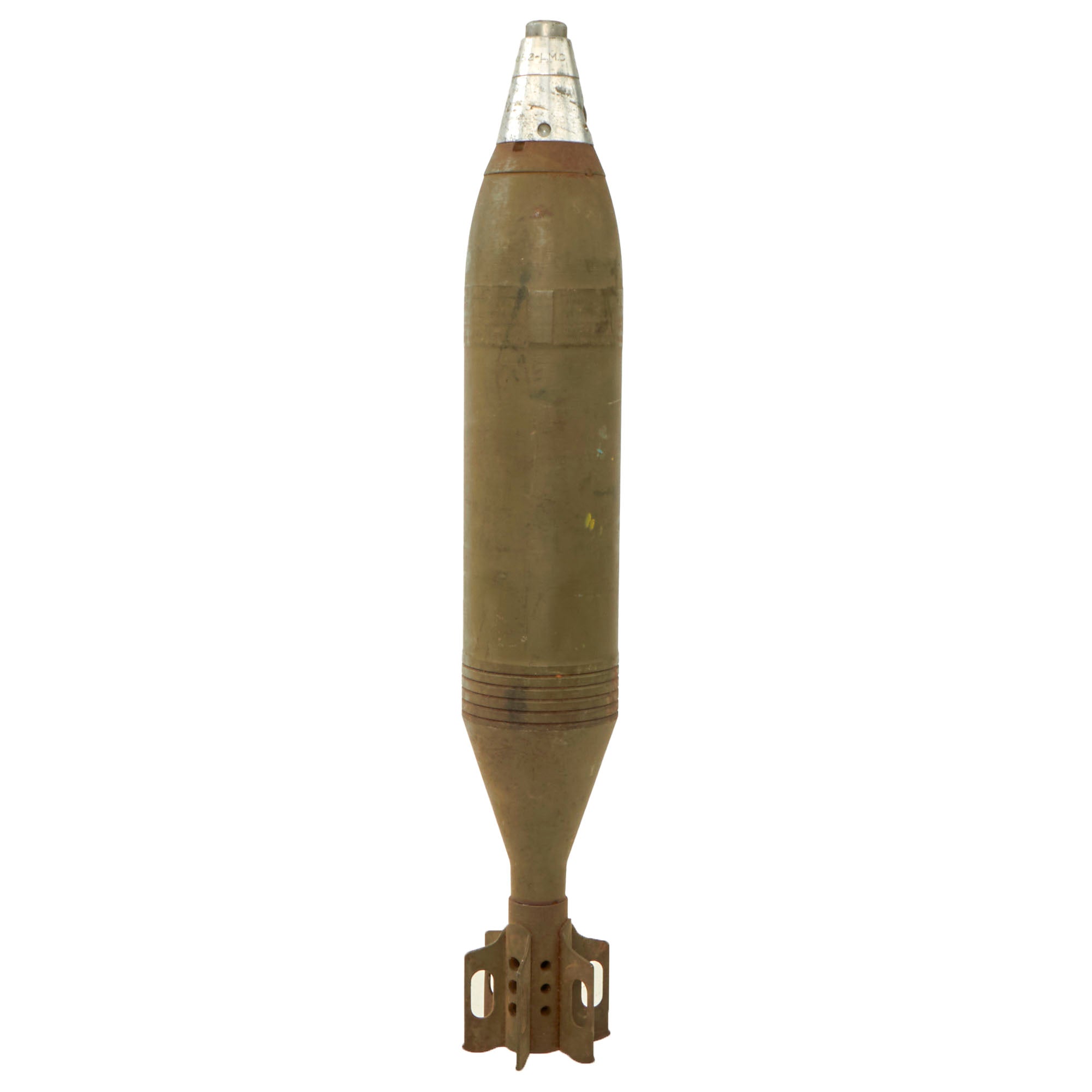 Original Item: Only One Available. This is a totally genuine United States military WWII produced SHELL, M56, with incorrect base fins. The round still has a lot of the original OD green paint on the exterior, though unfortunately the stamped paint markings on the body have mostly worn away. Measures approximately 20 5/8 inches long.