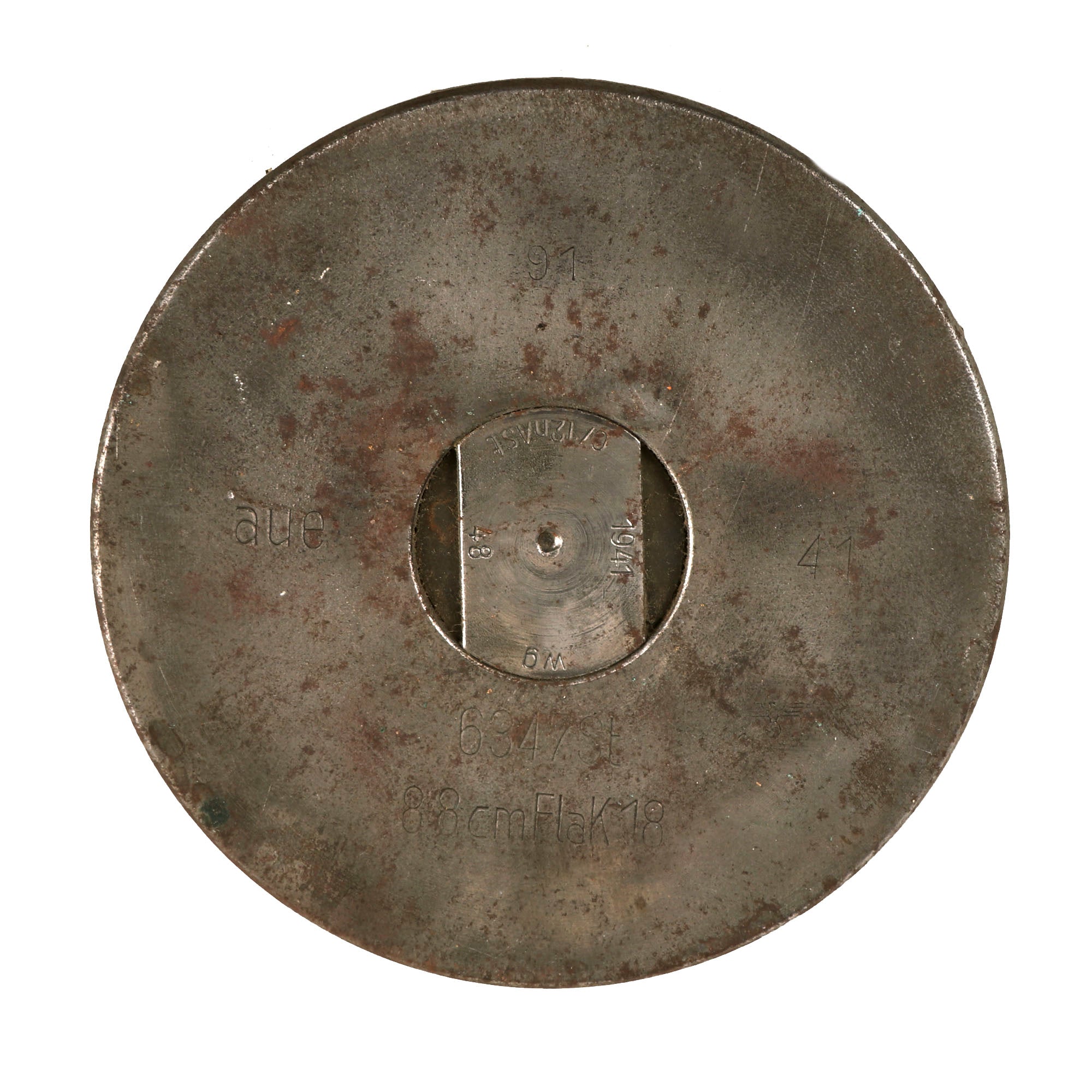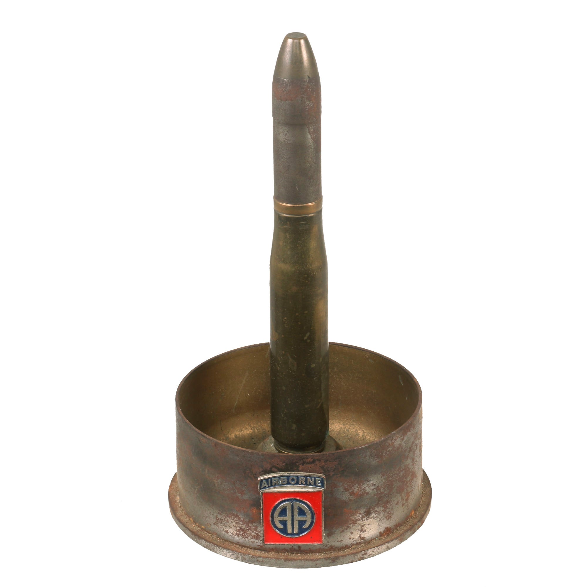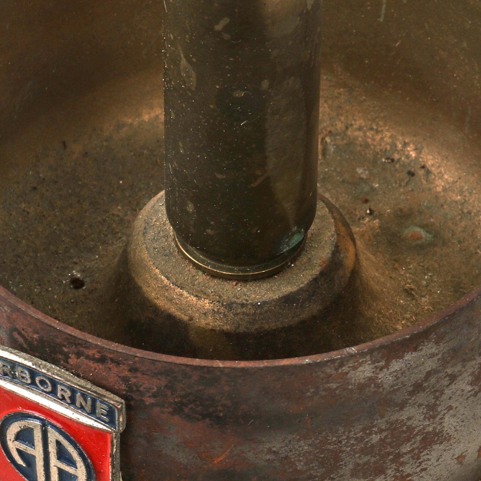 This is a great ashtray made from a German 88cm flak shell. The shell is dated 1941 and has a smaller German round affixed in the middle. On the side of the shell, a theatre-made DUI for the 82nd Airborne Division has been affixed. The shell has a base diameter of 4½” and a height of 8¼”. A great piece of trench art, ready for further research and display.