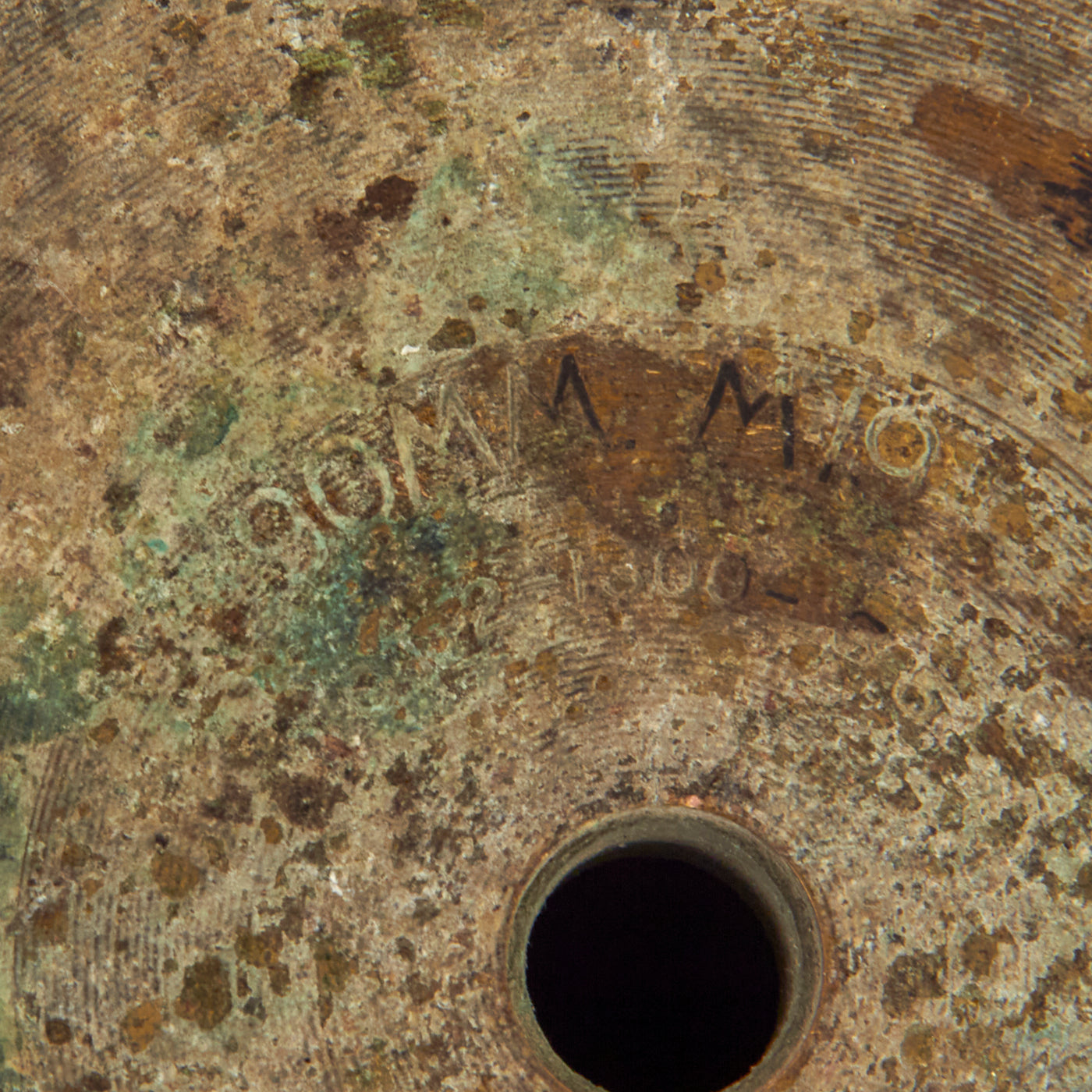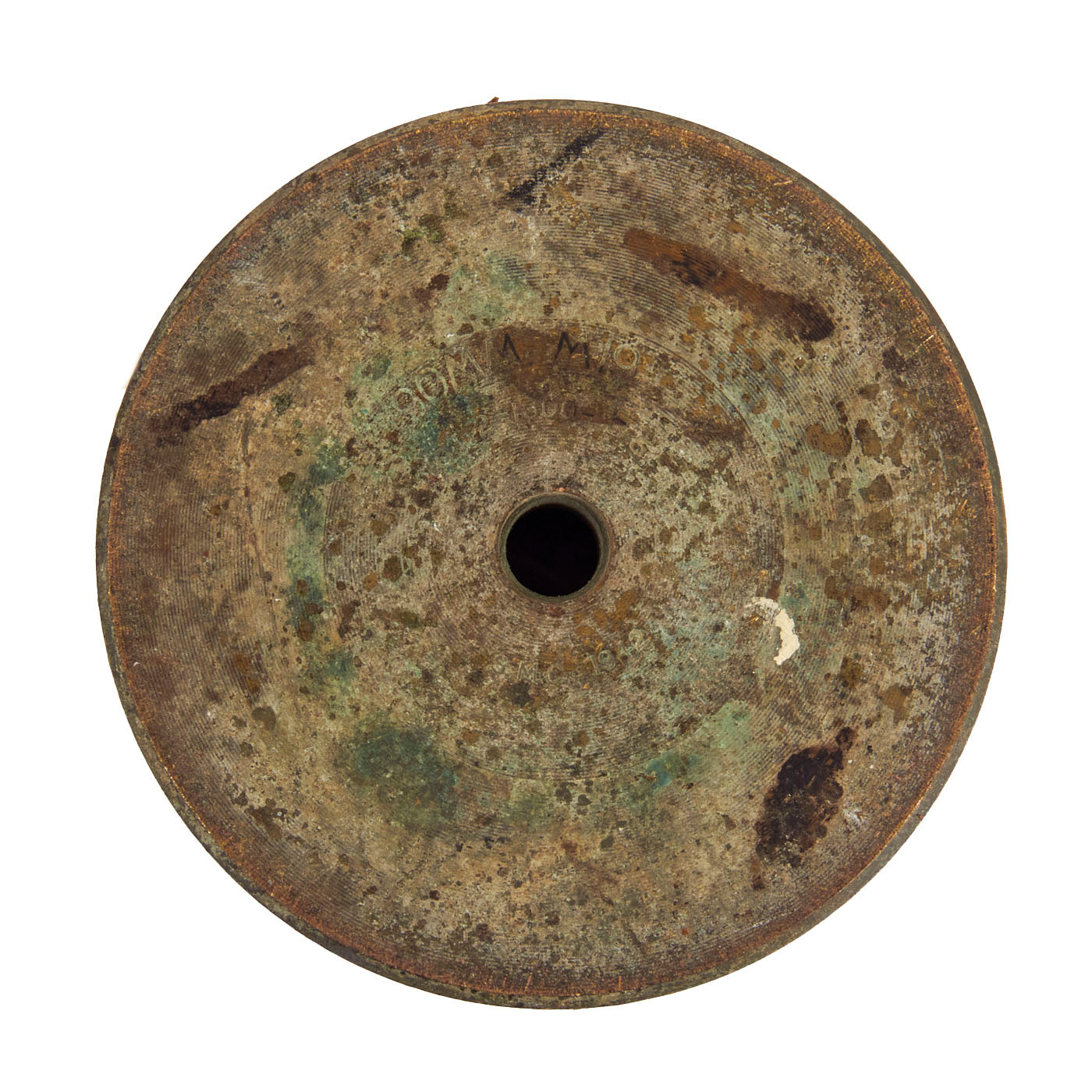 The bottom of the brass casing is stamped with 90MM M19 with an unreadable lot number beneath it. On the opposite side is the date 1942. The projectile is not crimped onto the shell casing and is still easily removable. The driving band still has a complete arsenal marking visible: 88-23136-8-H&B-1943-90-MM-M-77. M77 is the projectile used and is an obsolescent armor piercing model currently used for training purposes in 90mm guns. The projectile is a hardened steel monobloc slug and has no windshield. The projectile base is threaded to receive a tracer. The brass or steel cartridge case is loosely packed with propellant and is fitted with a percussion primer in the base.
