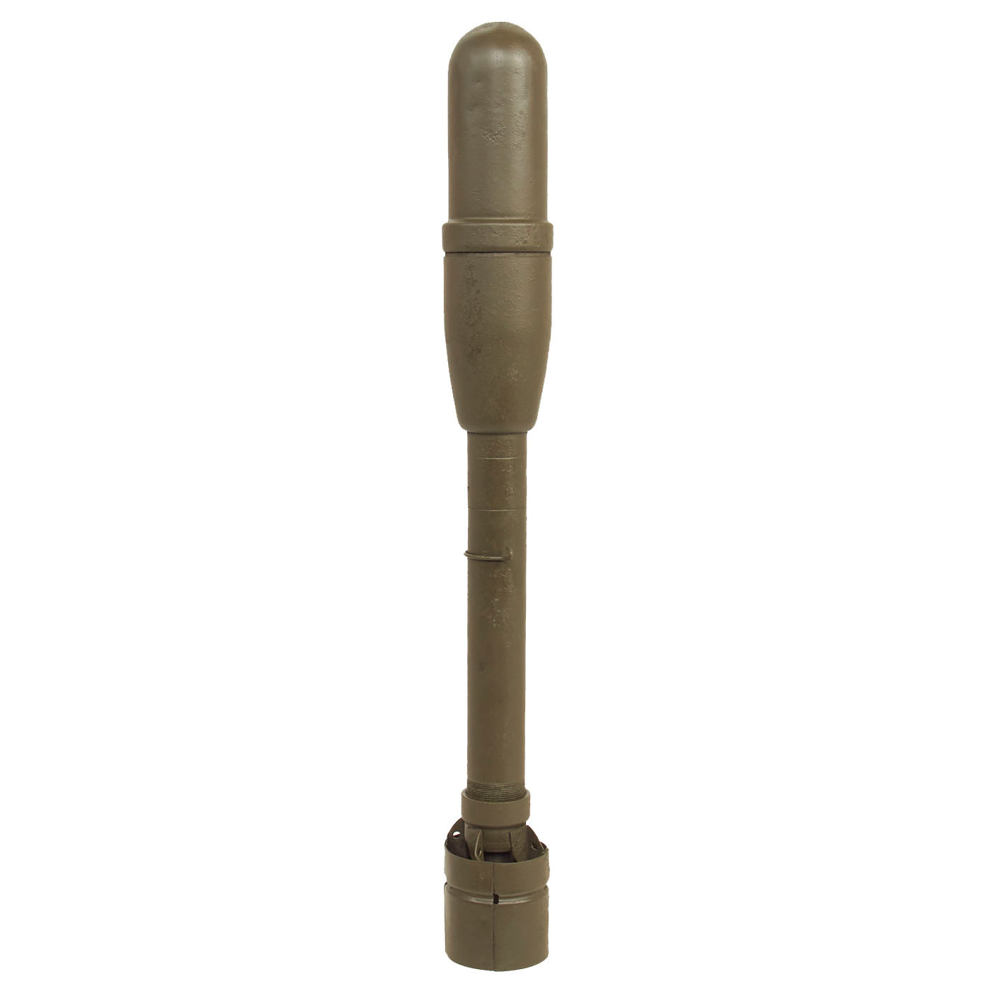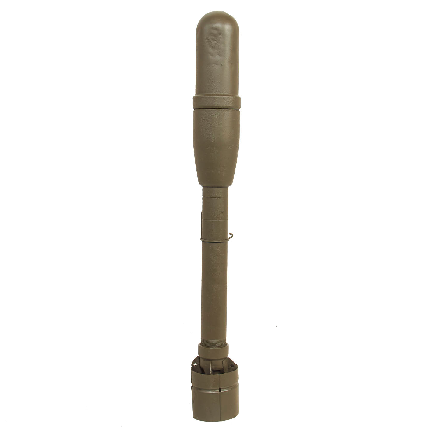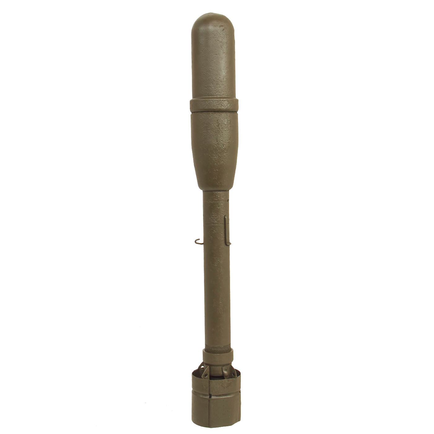 The inert rocket measures approximately 19 ½” inches long and has been repainted OD green from the original INERT practice blue, more than likely to give it a “real” look. The warhead and fin assembly no longer unscrews. The rocket is stamped 14 CBD on all components.