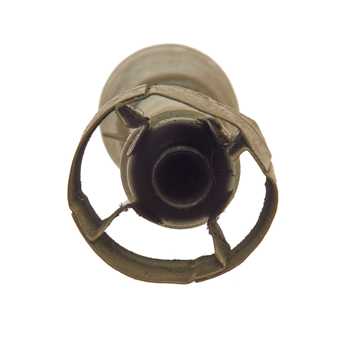The M7A1/A3 Practice rockets were manufactured without that HE cone, which was necessary to make room for a counterweight rod to simulate the correct mass and center of balance of the live round. A counter balance rods screw into the same cavity as otherwise occupied by the fuze. This example no longer unscrews, so we cannot confirm that the internal weighted rod is still present.