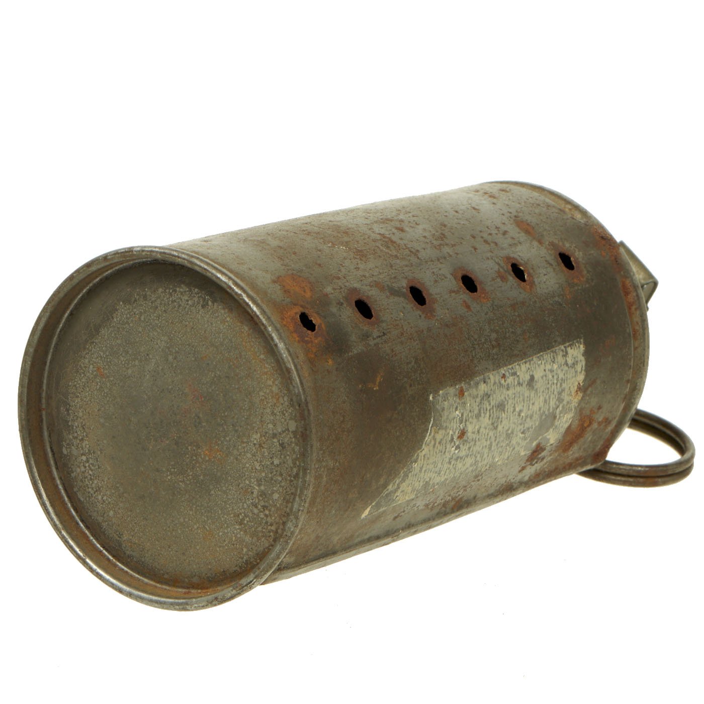 This is a very nice WWII issue cylinder smoke or gas grenade, complete with the original inert fuze. The tin plated sheet steel body still has a lot of the original plating, however the paint has all fallen off, so there is unfortunately no way to tell exactly which type of grenade it originally was. It has 6 emission holes on the top, and an additional three rows of 6 on the sides, which doesn't match the expected pattern for most. We assume that it is most likely an early example. before the large hole on the bottom was adopted.
