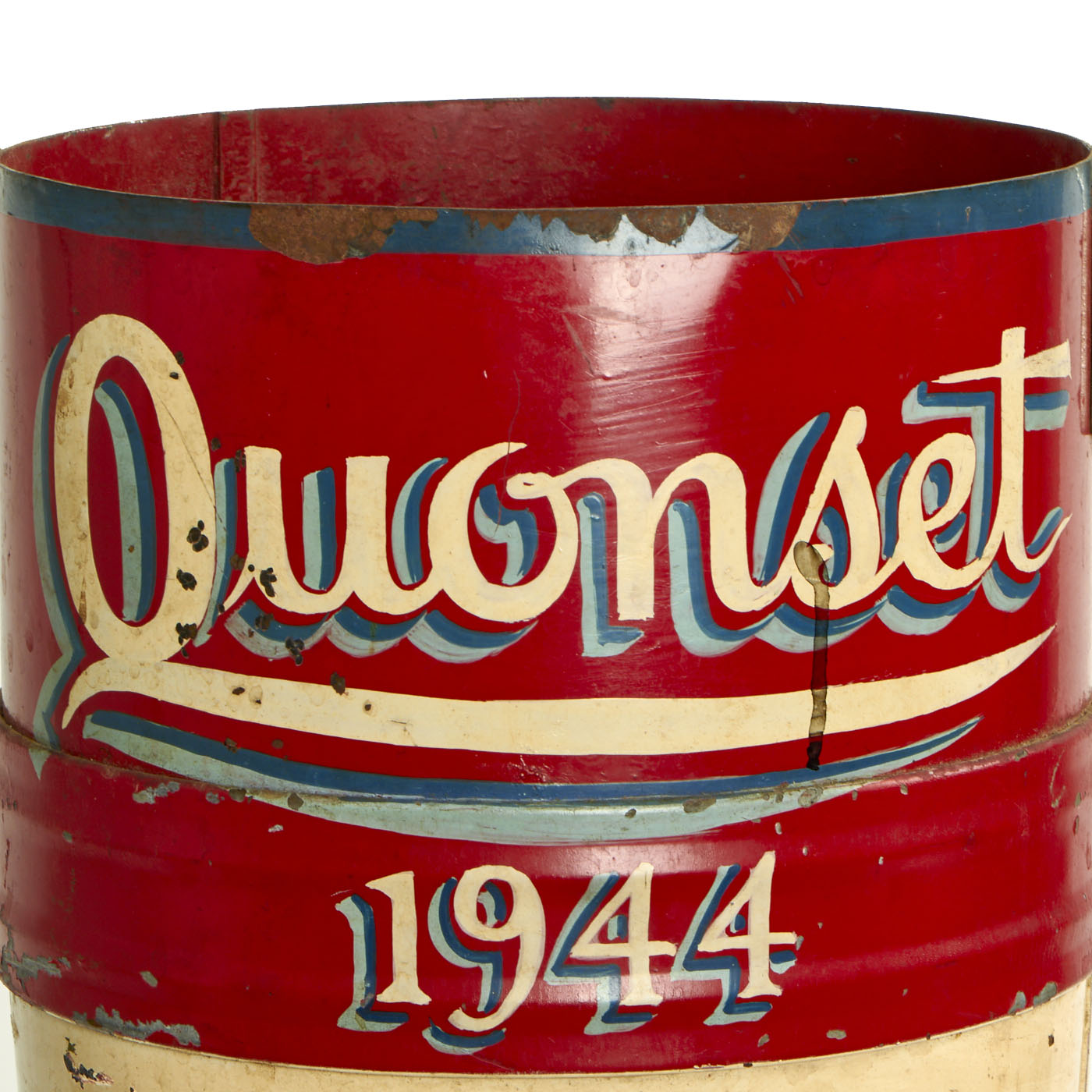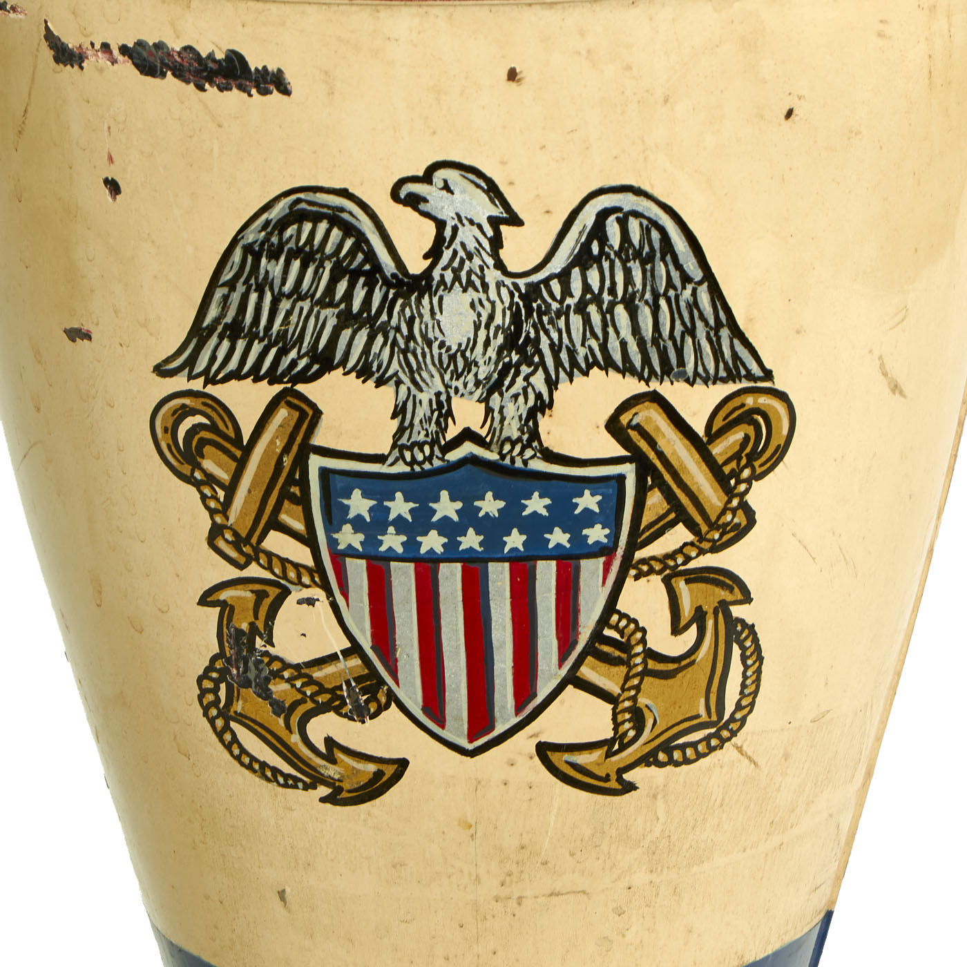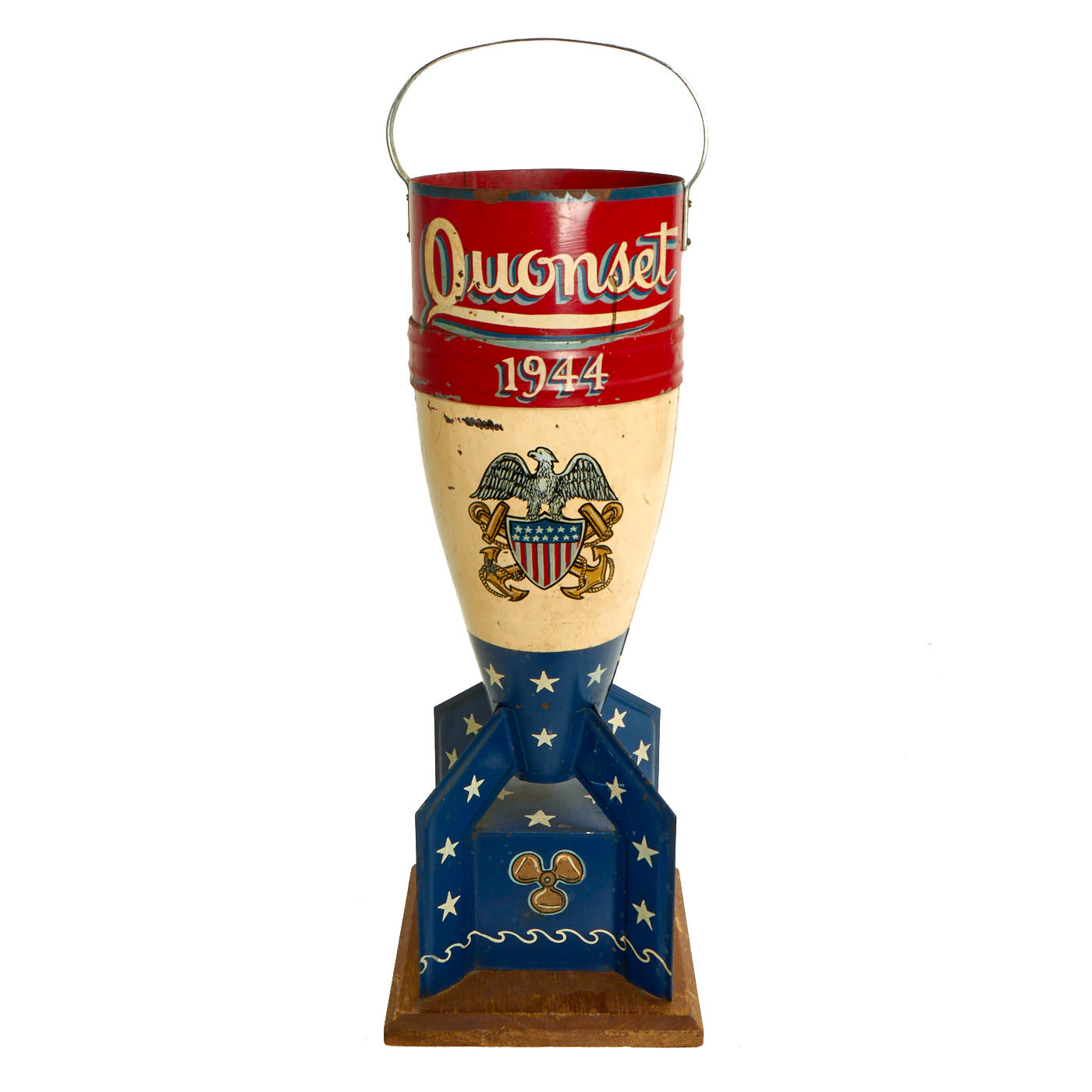 The artwork displayed is very patriotic in nature. The front features the words Quonset / 1944 with a lovely USN Aviation eagle beneath it. The base has lovely ships props painted on them with waves along the base of the fin assembly. Whoever made this took their time and made sure the artwork was perfect, which it still is almost 80 years later!