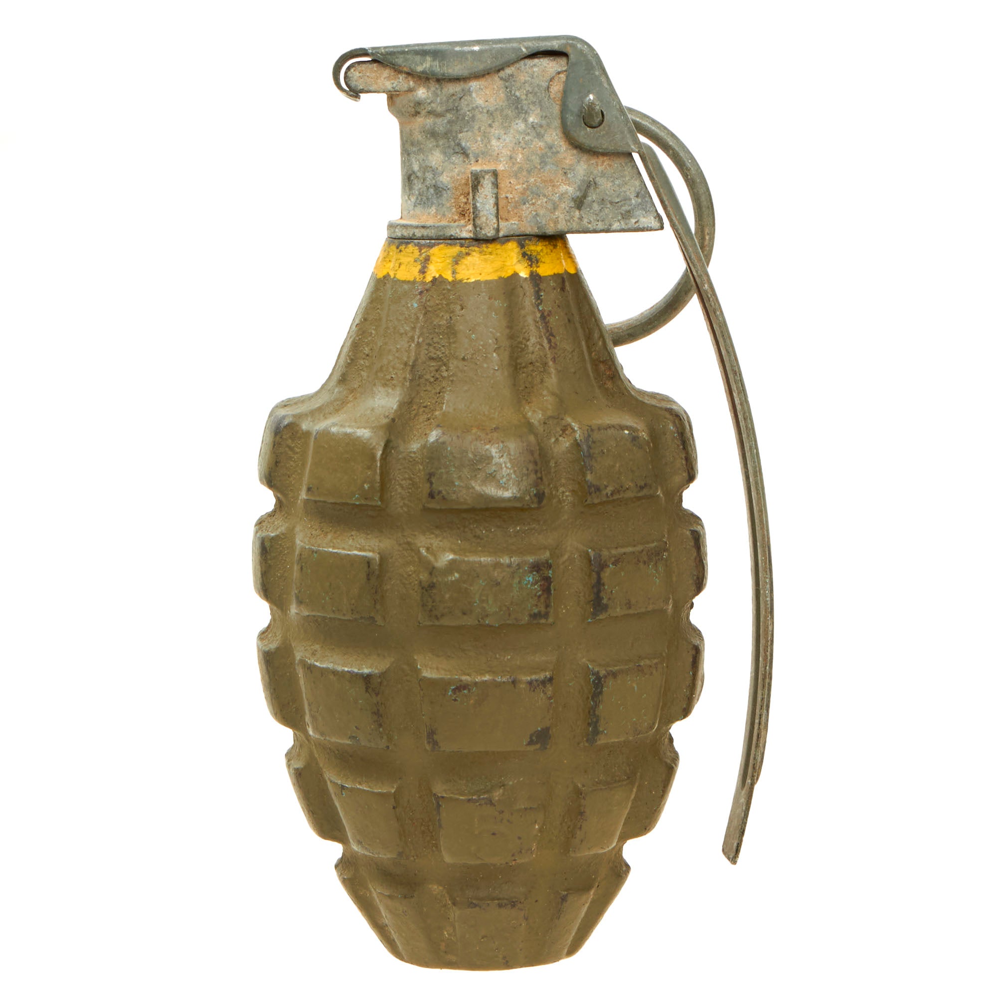 Original Item: Only One Available. This is a wonderful example of an American MkII “Pineapple” practice grenade which has been repainted olive green with a yellow ring to resemble a real Mk. II. This example is in great shape and is affixed with an M10A3 fuze. Like all deactivated ordnance, this grenade is Not Available for Export.