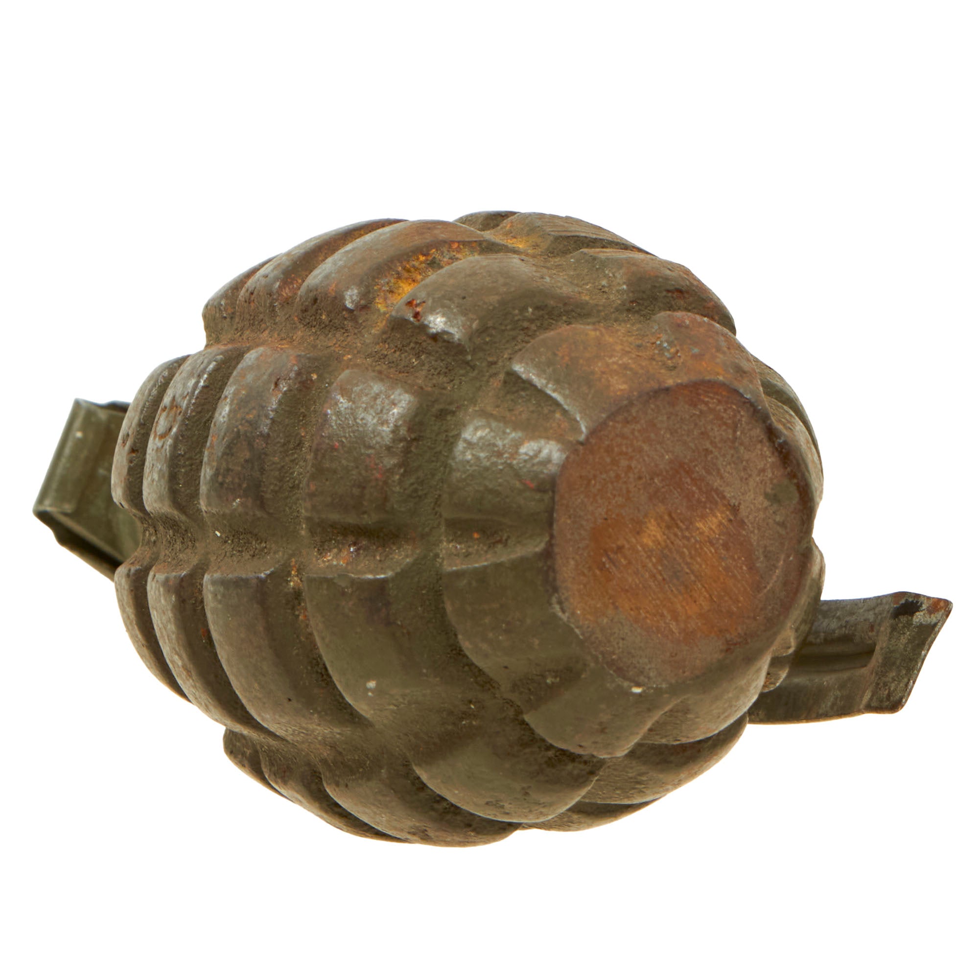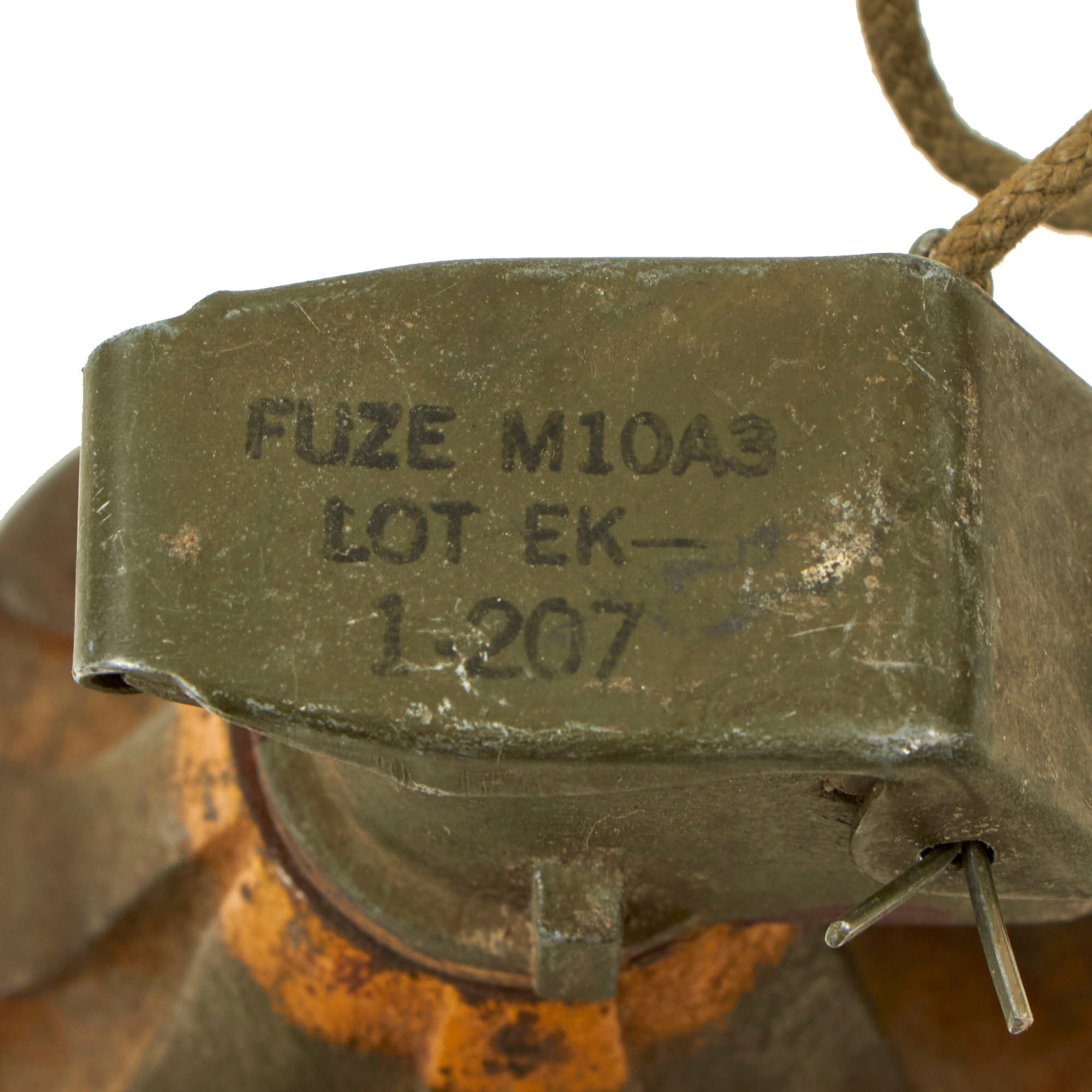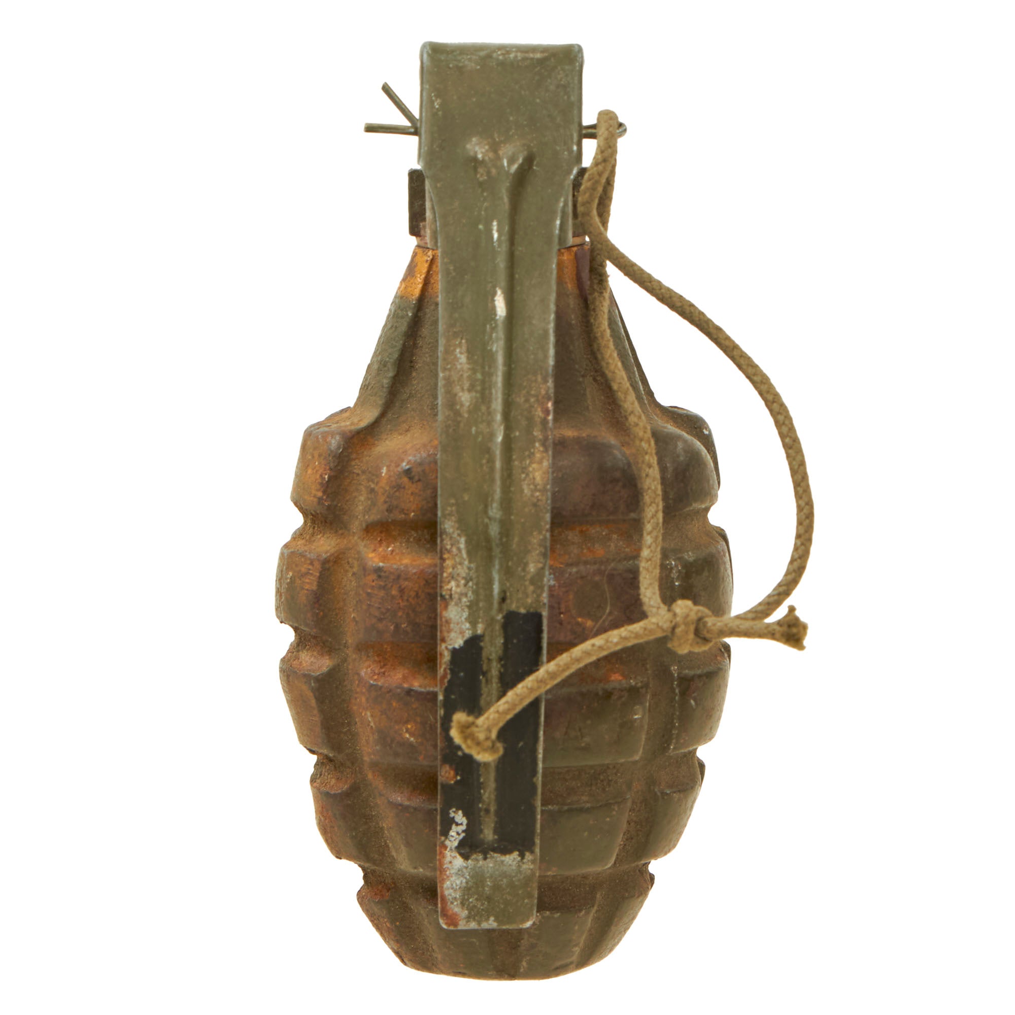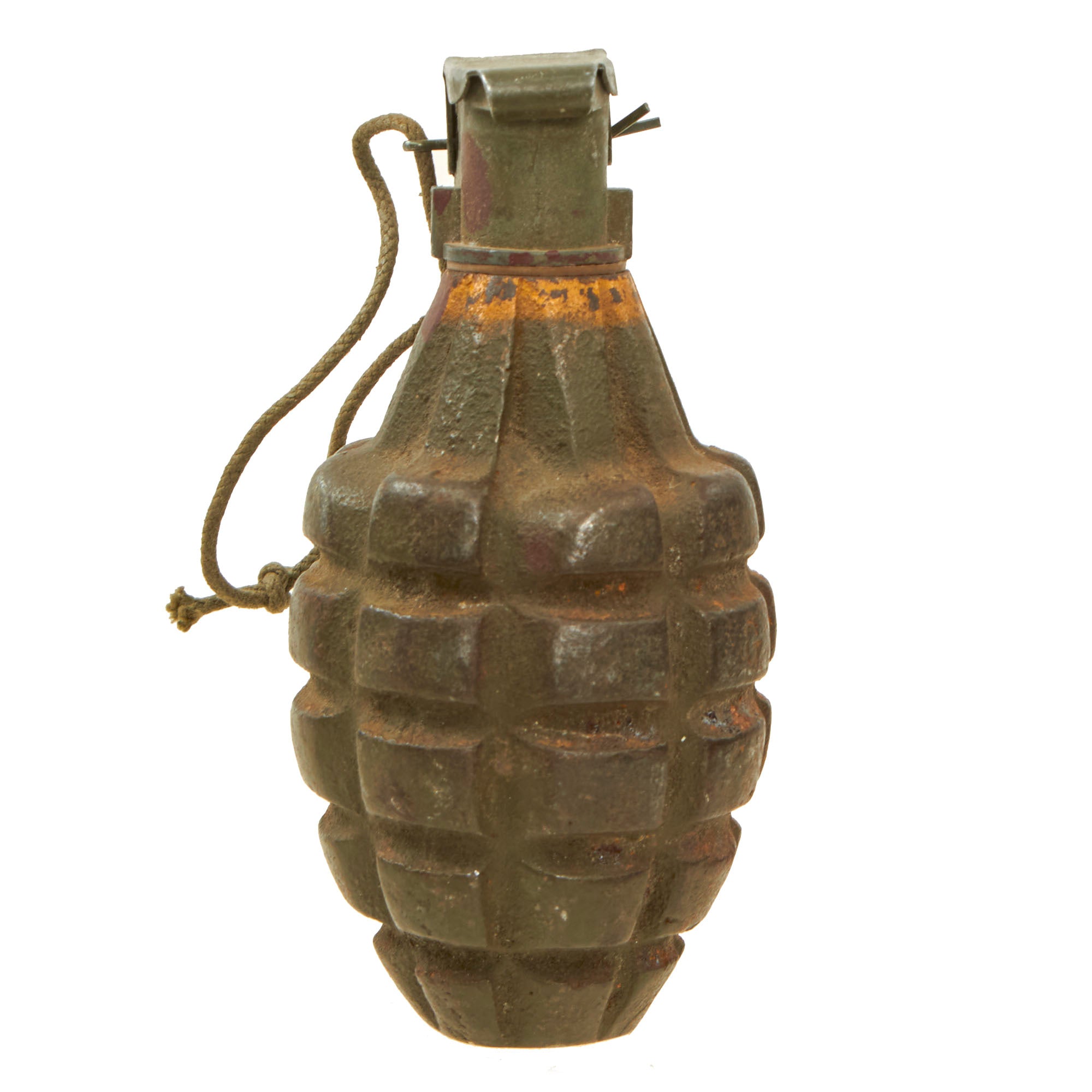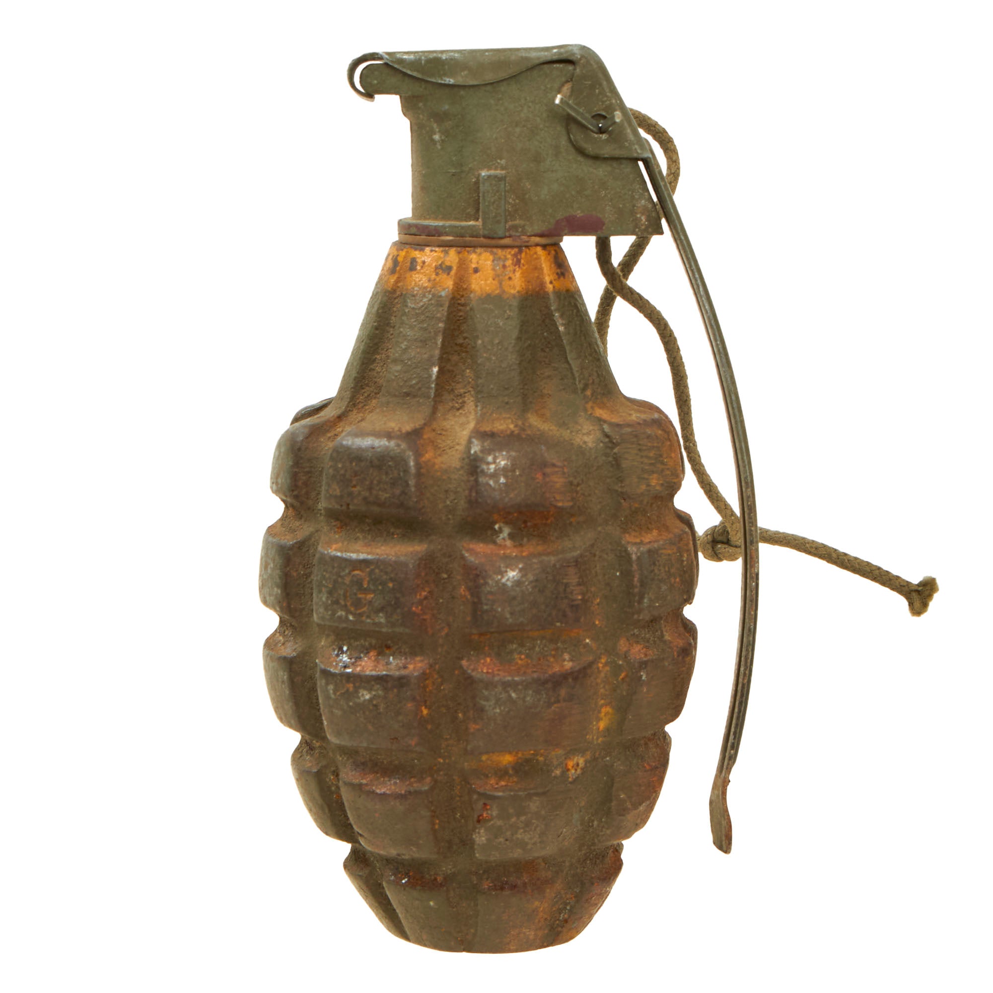 Original Item: Only One Available. This is a wonderful example of an American MkII “Pineapple” grenade. This example is in great shape and is affixed with an M10A3 fuze. This example also retains most of the lovely yellow ring around the neck. The only issue is that the pull ring is missing, and was replaced by a green string. Like all deactivated ordnance, this grenade is Not Available for Export.This is an iconic U.S. fragmentation pineapple grenade issued during WWII. The Mk II was standardized in 1920 replacing the Mk I of 1917. It was phased out gradually, the U.S. Navy being the last users, on 2 April 1945 the Mk II and Mk IIA1 were re-designated the Mk 2 and Mk 2A1.This is an iconic U.S. fragmentation pineapple grenade issued during WWII. The Mk II was standardized in 1920 replacing the Mk I of 1917. It was phased out gradually, the U.S. Navy being the last users, on 2 April 1945 the Mk II and Mk IIA1 were re-designated the Mk 2 and Mk 2A1.The Mk II was commonly known as a pineapple grenade, because of its shape and structure. Grooves were cast into the cast iron shell, which was believed at the time to aid in fragmentation and had the side benefit of aiding in gripping the grenade; this provision gave it the appearance of a pineapple fruit. The Mk II was identified with an all yellow body prior to 1943. They were then painted olive drab for camouflage purposes with a narrow yellow band below the fuse.In the closing years of WWII the Mark II was produced with a solid base and equipped with the M10A3, or M6 series fuze (depending on the explosive filler used).This example is in lovely condition with almost all of the original paint still present, as well as a visible yellow band still around the neck. This example is complete besides the pull ring, which is absent and was replaced by a string. It is also marked on the body with a maker’s mark. The fuze is stamped into the metal:FUZE M10A3LOT EK-1-207This iconic grenade comes ready for further research and display.