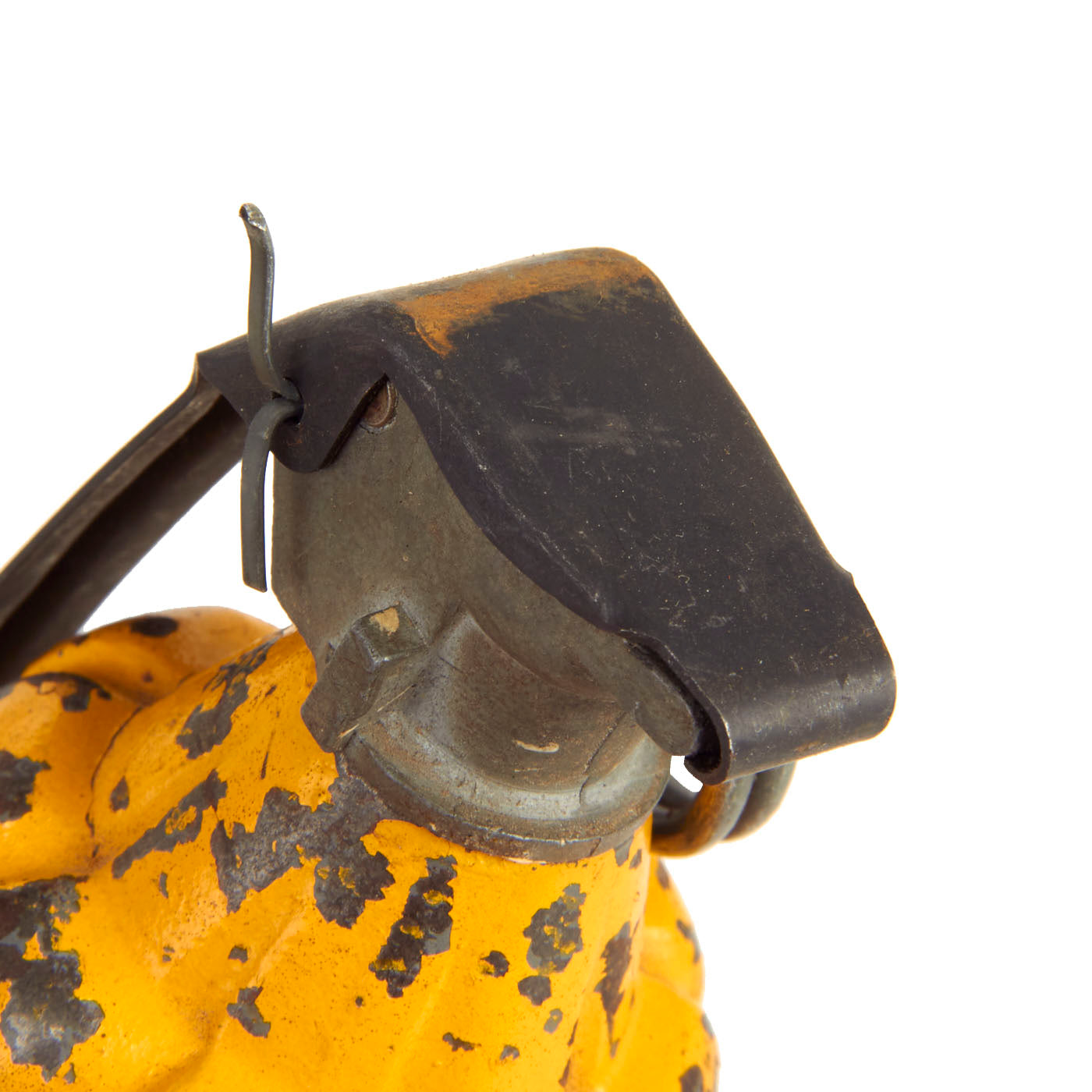 This rare early war grenade bears all original yellow paint over red primer, original M10A3 fuse and pin. It is offered in very good condition. It even still has the bottom fill plug, painted in place. Genuine early war examples in yellow are extremely hard to find on the market today.