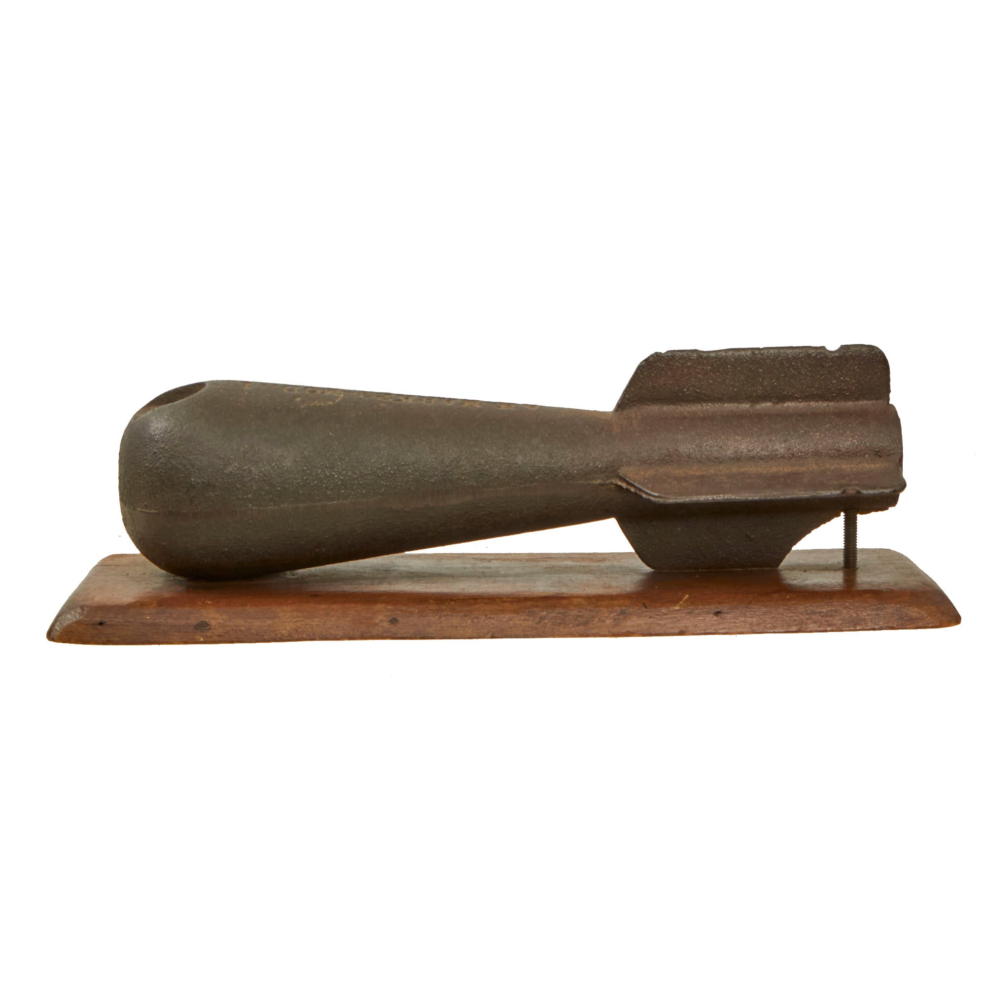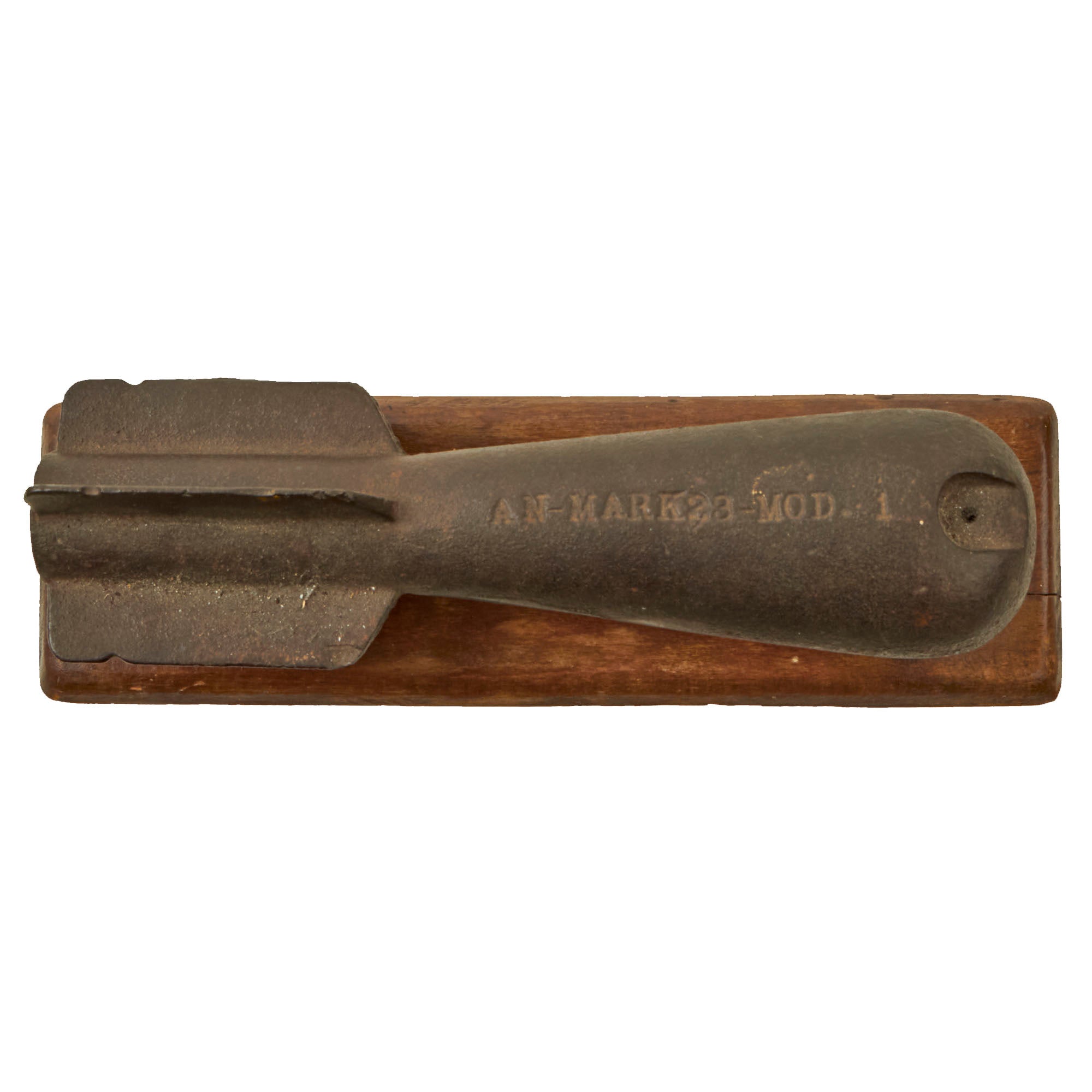 The round is made of lead and was made as a trainer. The round is marked on the side AN-MK23-MOD.1. It is in good shape but has some oxidation pitting and had one of the fins ripped off to make room for the screw to mount it. It measures roughly 8¼” long, and the base measures 9½ x 3”. The base has some cracking in it, but also has a small mount on the bottom to hang the piece on a wall. A great example, ready for further research and display.