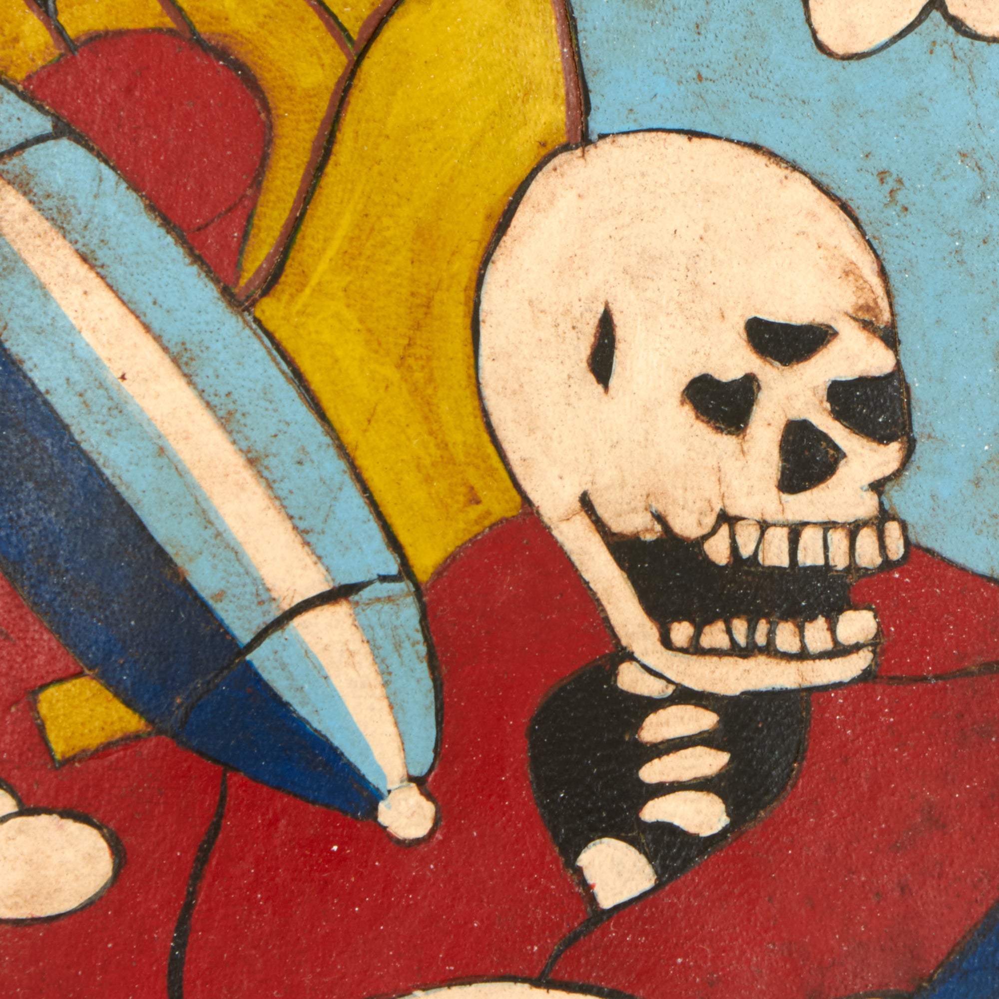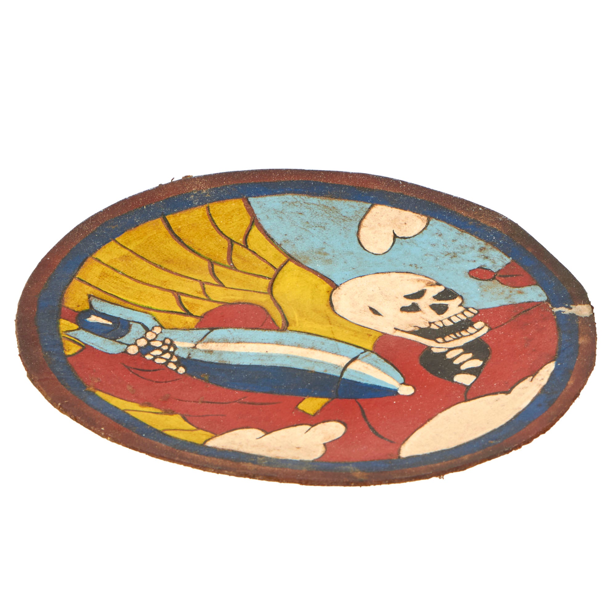 The patch depicts a three-eyed skeleton with wings in a long red robe hurling a bomb down towards the enemy. It has a diameter of about 5”. The colors of the paint are 98% retained with some scuffs and rubbing across, but the patch is absolutely killer, one of the nicest we’ve had. This was a very war-torn Squadron that saw a great deal of combat in Southern Italy & Germany.