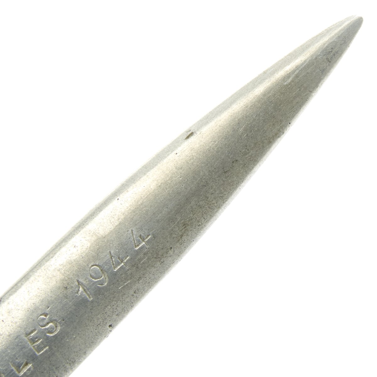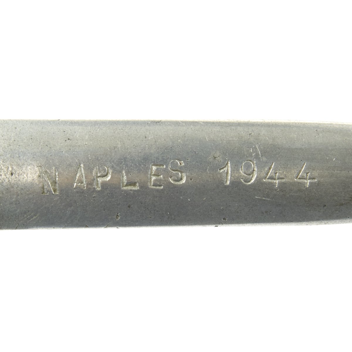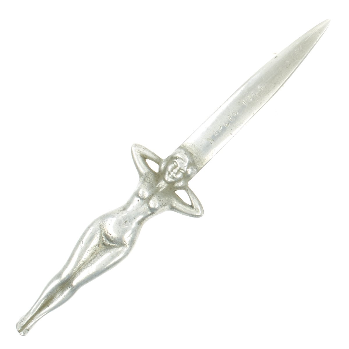 - Original Item: Only One Available. Italian manufactured late WW2 period souvenir knife (not sharp) with a naked lady for a grip. These "nude knives" were popular with American troops and were offered in small street markets throughout Naples. All known examples are stamped NAPLES 1944. USGI Vets bought these as a lighthearted reminder of their time abroad. Constructed of cast aluminum, the blade measures 5 inches long with an overall length of 10.5 inches. This example is offered in very good condition and has correct stamped lettering (many post war examples are marked with electric pencil).