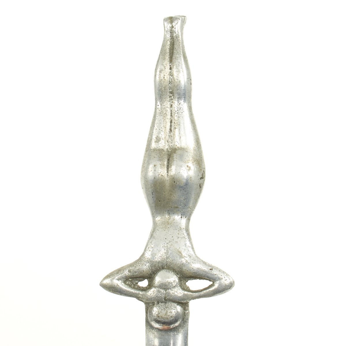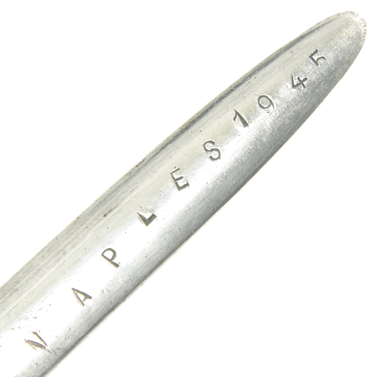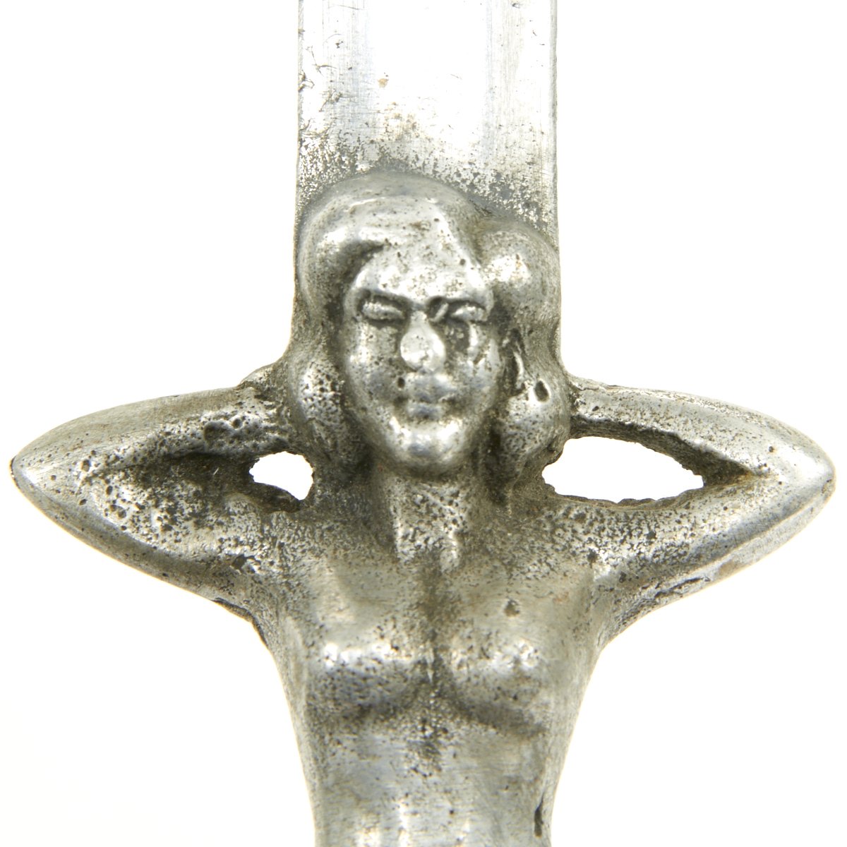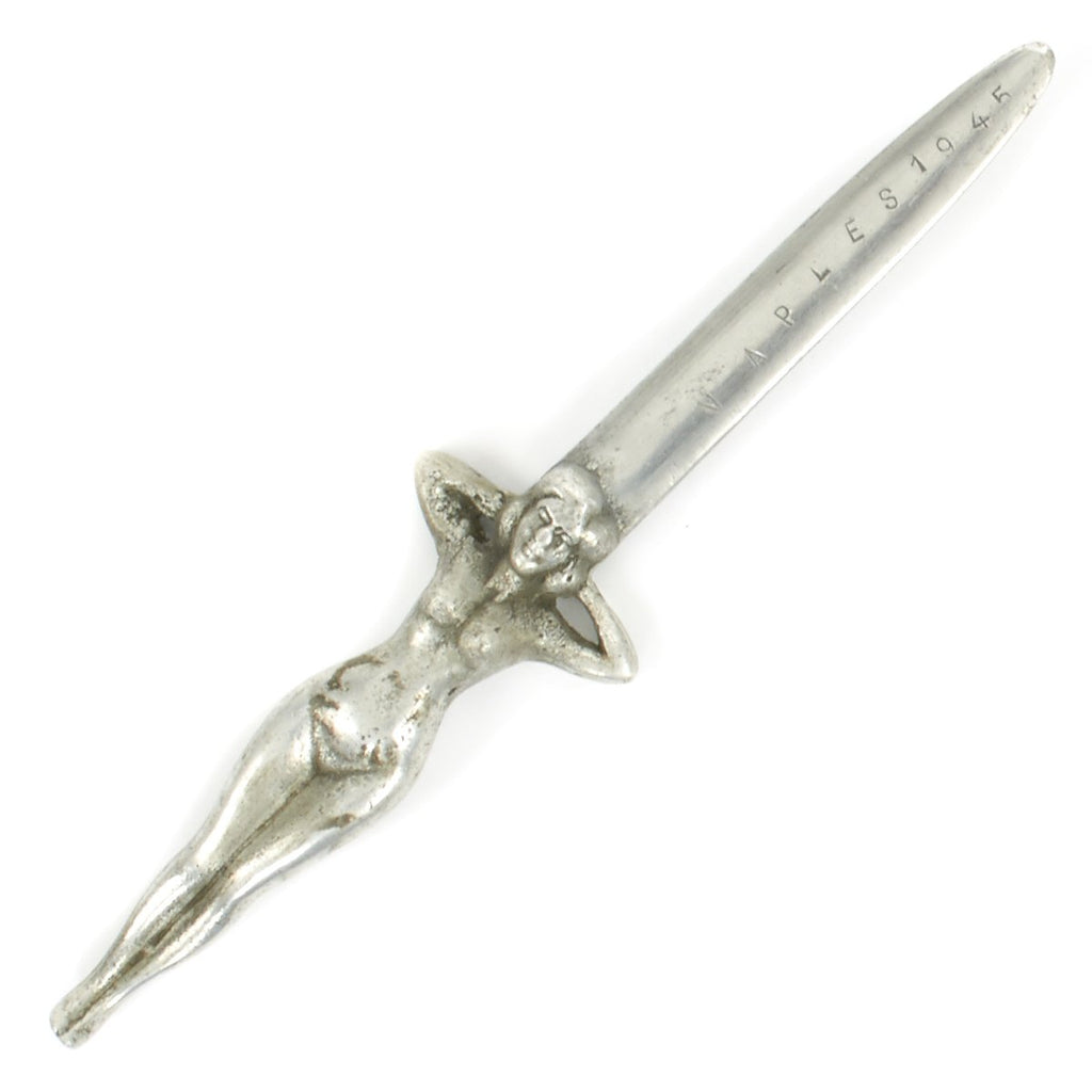 - Original Item: Only One Available. Italian manufactured late WW2 period souvenir knife (not sharp) with a naked lady for a grip. These "nude knives" were popular with American troops and were offered in small street markets throughout Naples. All known examples are stamped NAPLES 1945. USGI Vets bought these as a lighthearted reminder of their time abroad. Constructed of cast aluminum, the blade measures 5 inches long with an overall length of 10.5 inches. This example is offered in very good condition and has correct stamped lettering (many post war examples are marked with electric pencil).