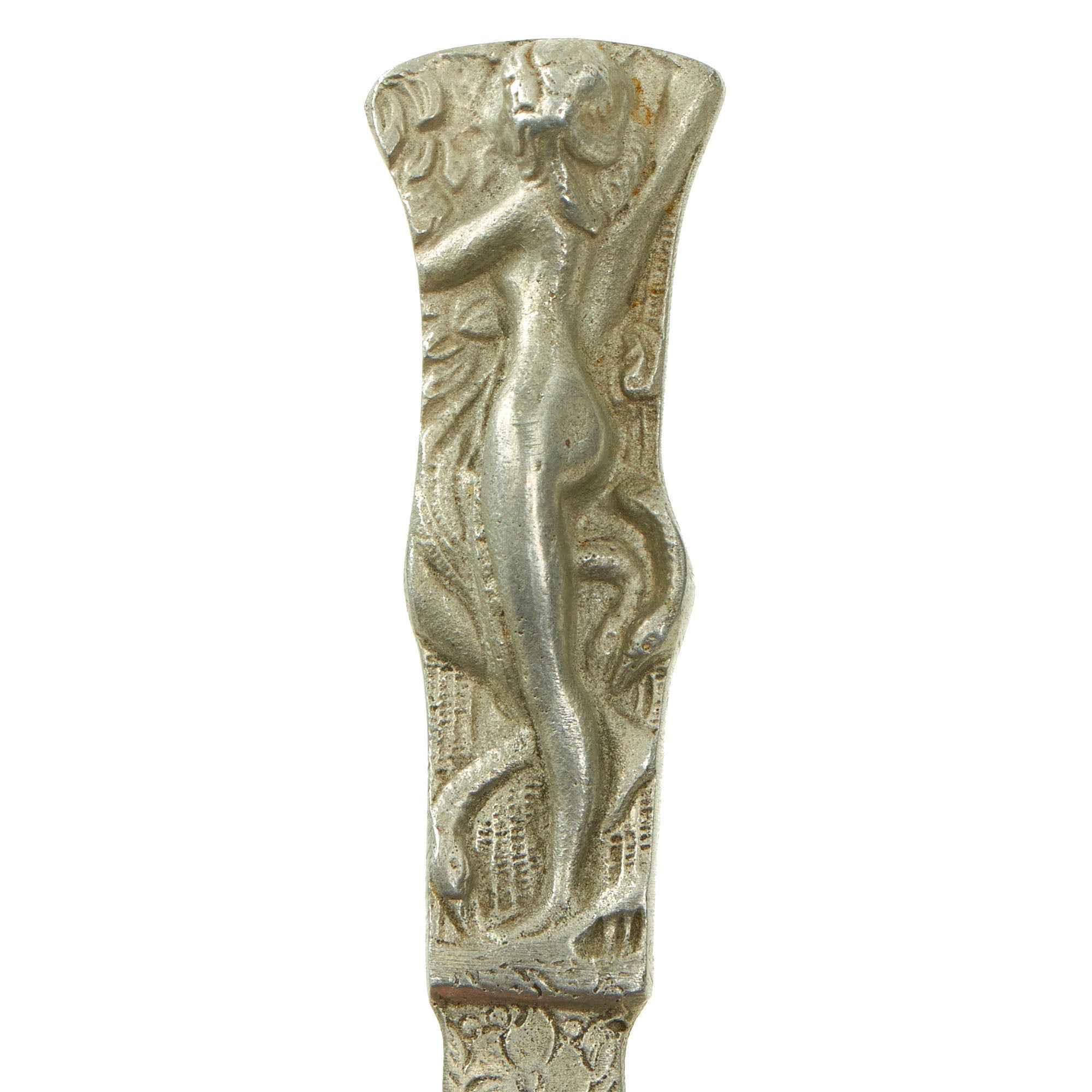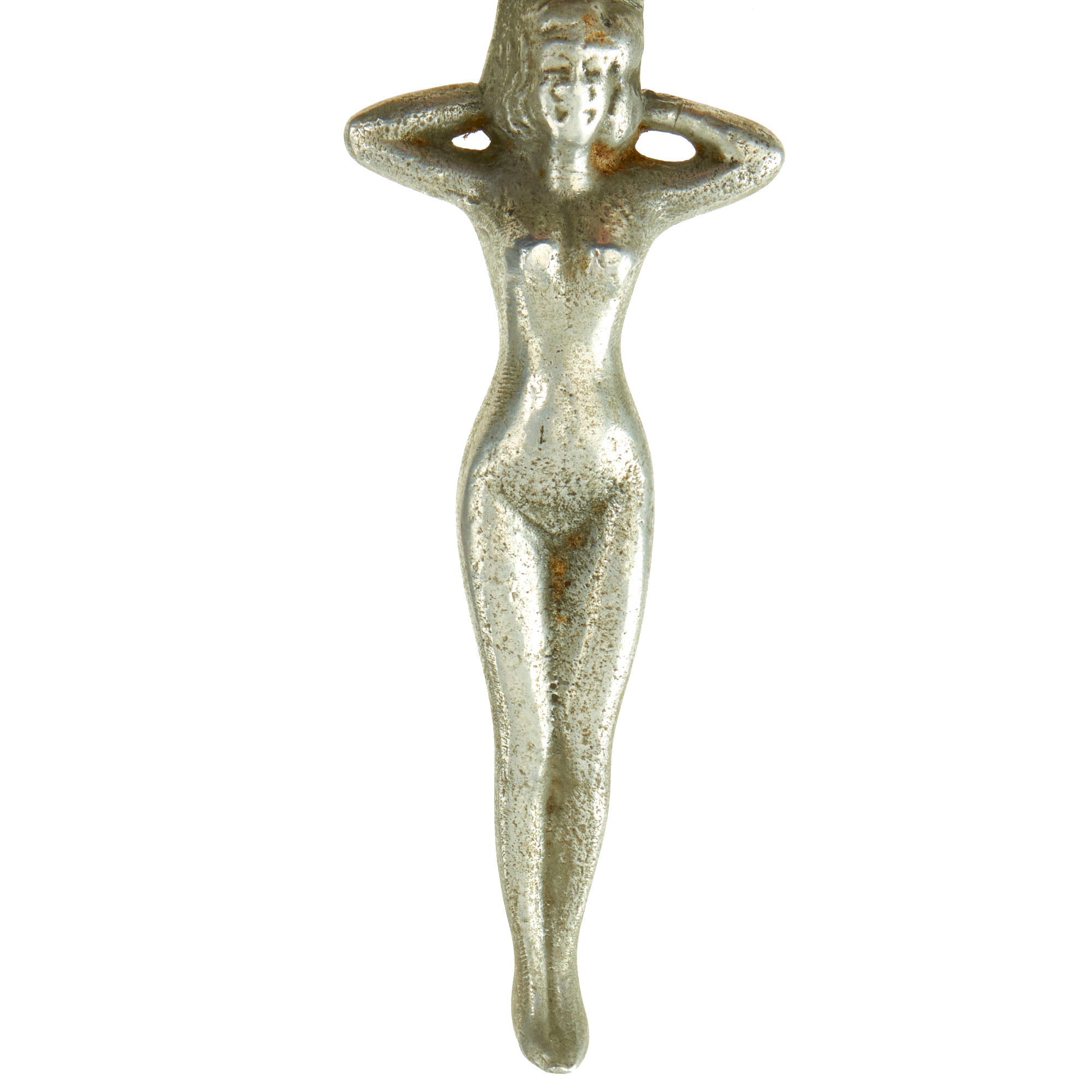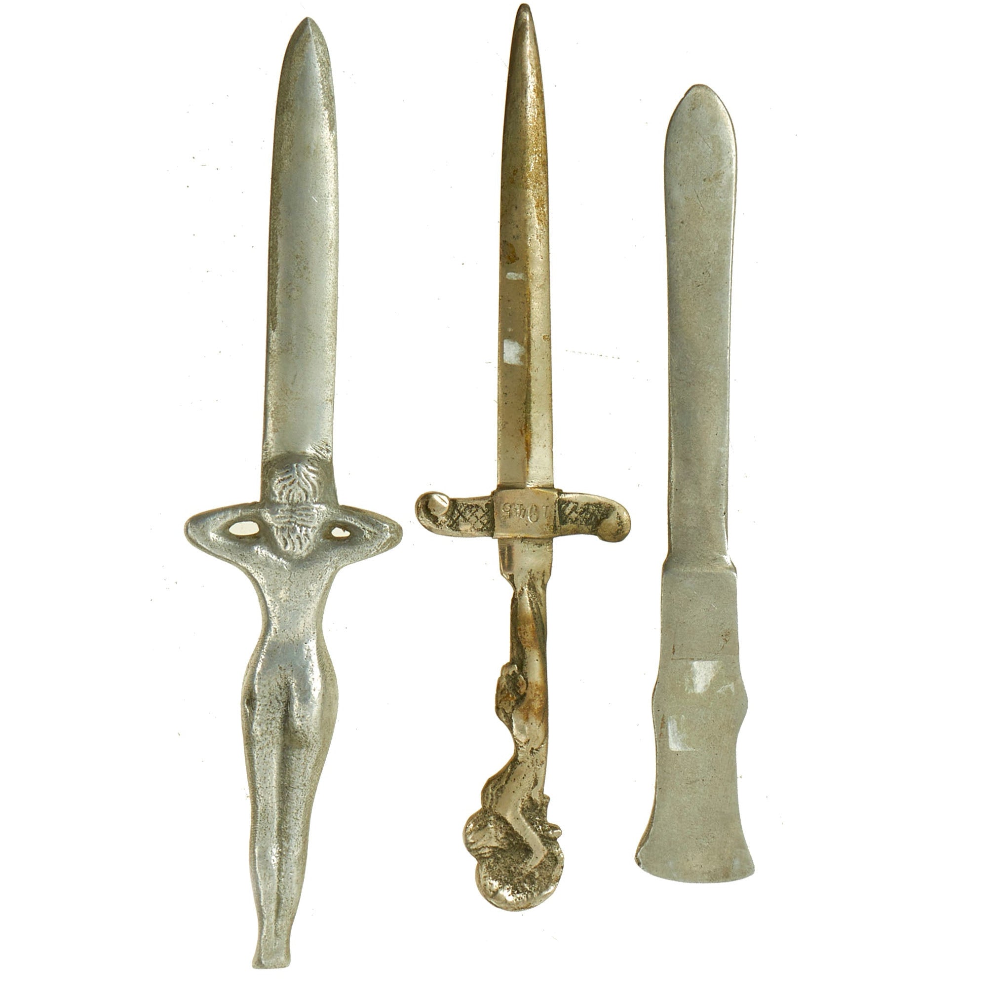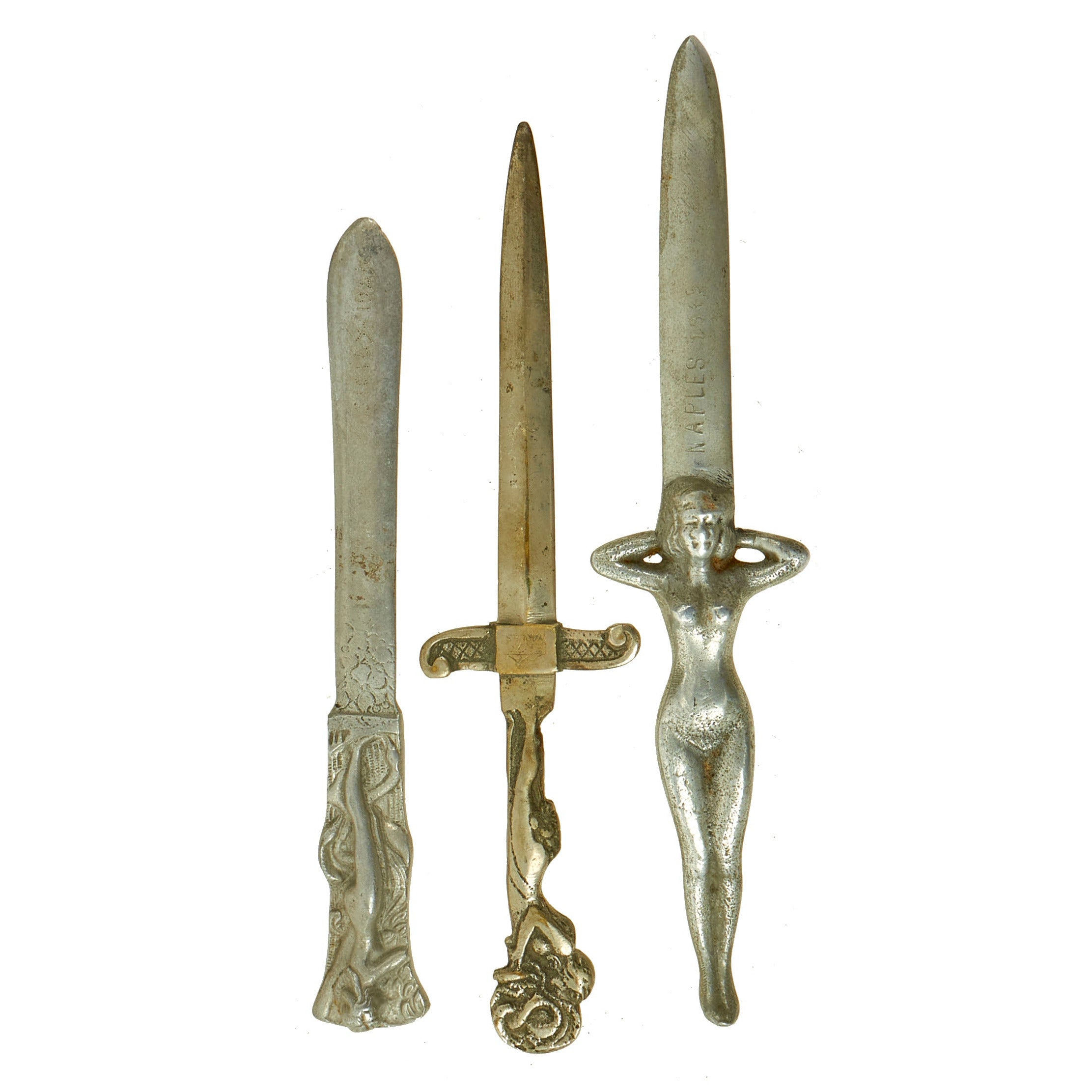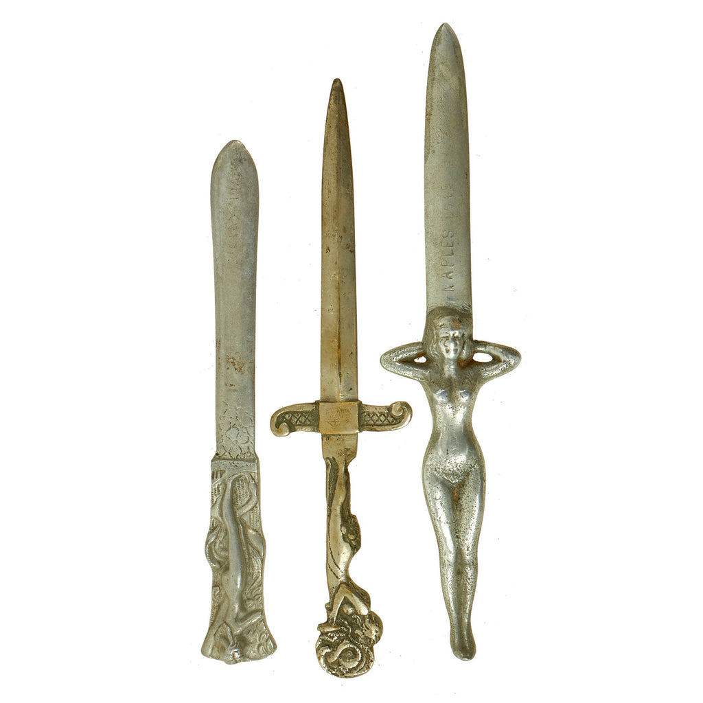 Original Item: Only One Set of Three Available. Italian manufactured, late WWII period souvenir knife set (not sharp) all featured with a naked lady for a grip. These "nude knives" were popular with American troops and were offered in small street markets throughout Naples. These examples are marked with SICILY 1944 and NAPLES 1945 (on two) with an engraving pen on the blades and “crossguard”. Two are cast aluminum, while the other is plated brass alloy.