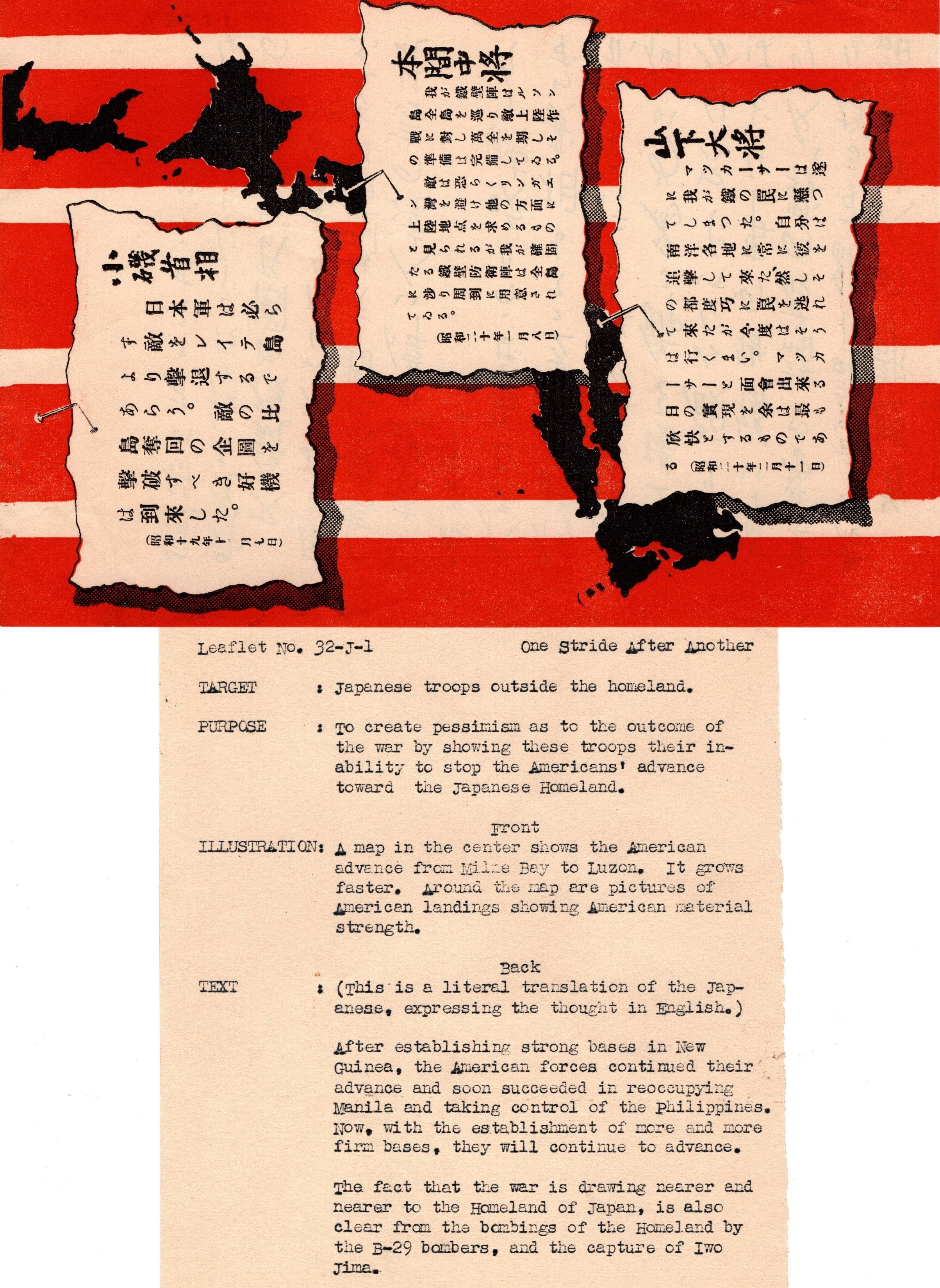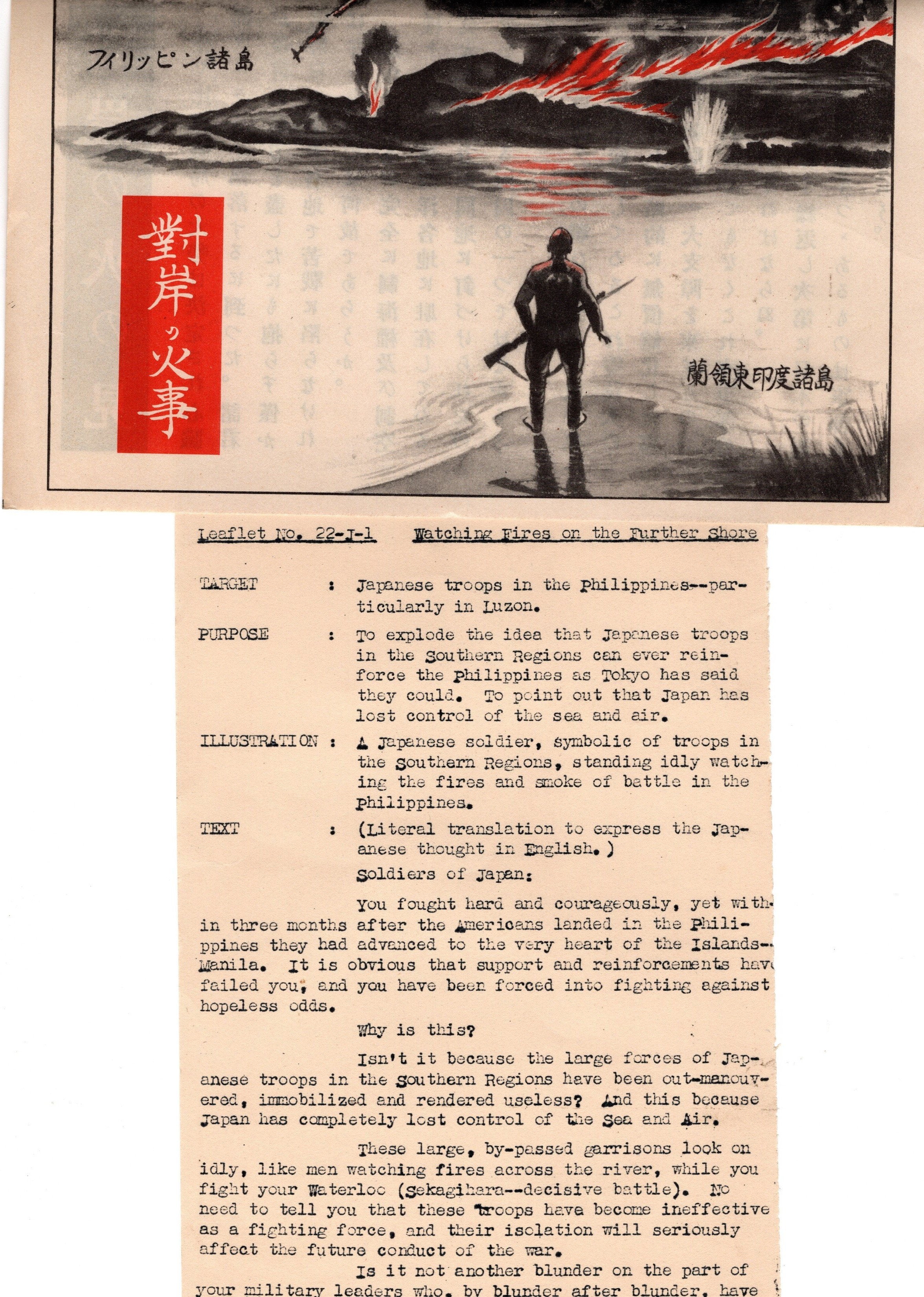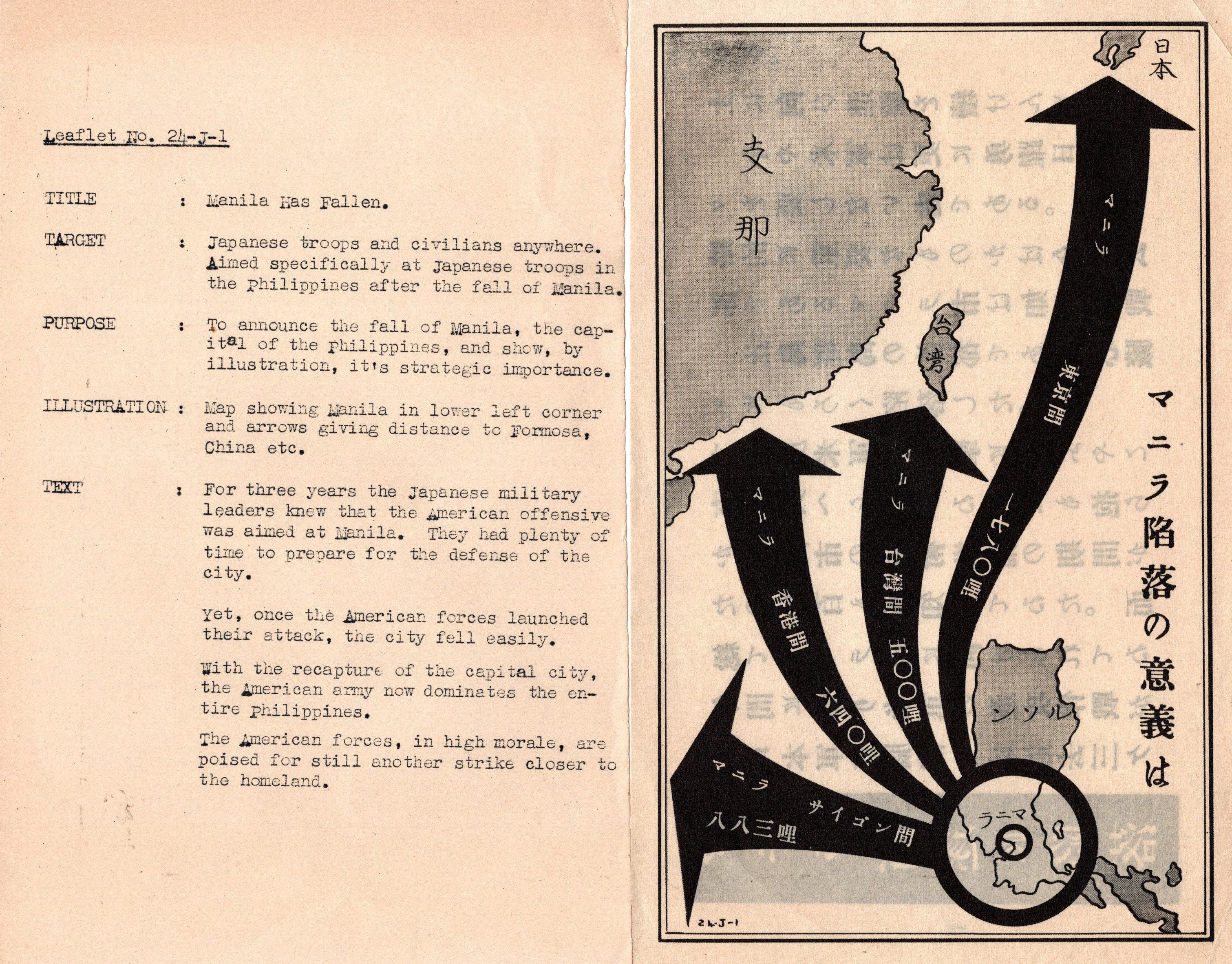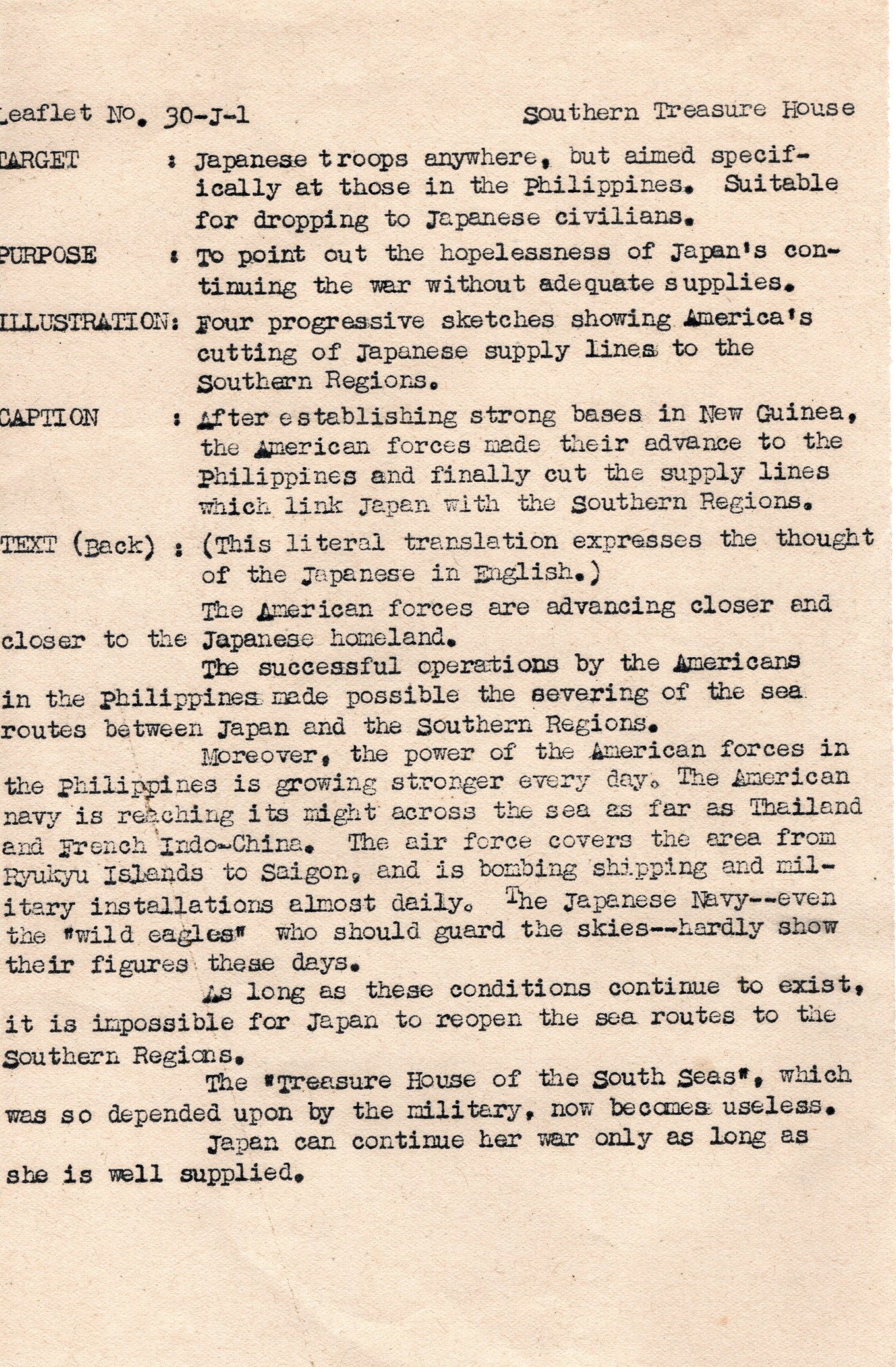 Undoubtedly, the best and most irrefutable propaganda that the Allied can now use in the Philippines is the airplane. This will give lie to the main Japanese propaganda and blow to smithereens their entire propaganda machine. Nothing except invasion can equal the propaganda value of the sight of an American airplane in the Philippine skies today. Even if the airplane were to drop nothing, the mere sight of it and the star on its wings will give the people tangible things to boost their morale and renew their faith in the American pledge to redeem the Philippines.