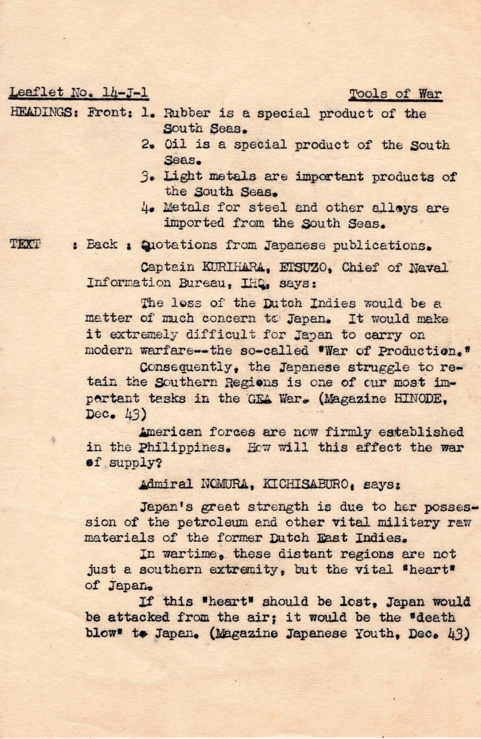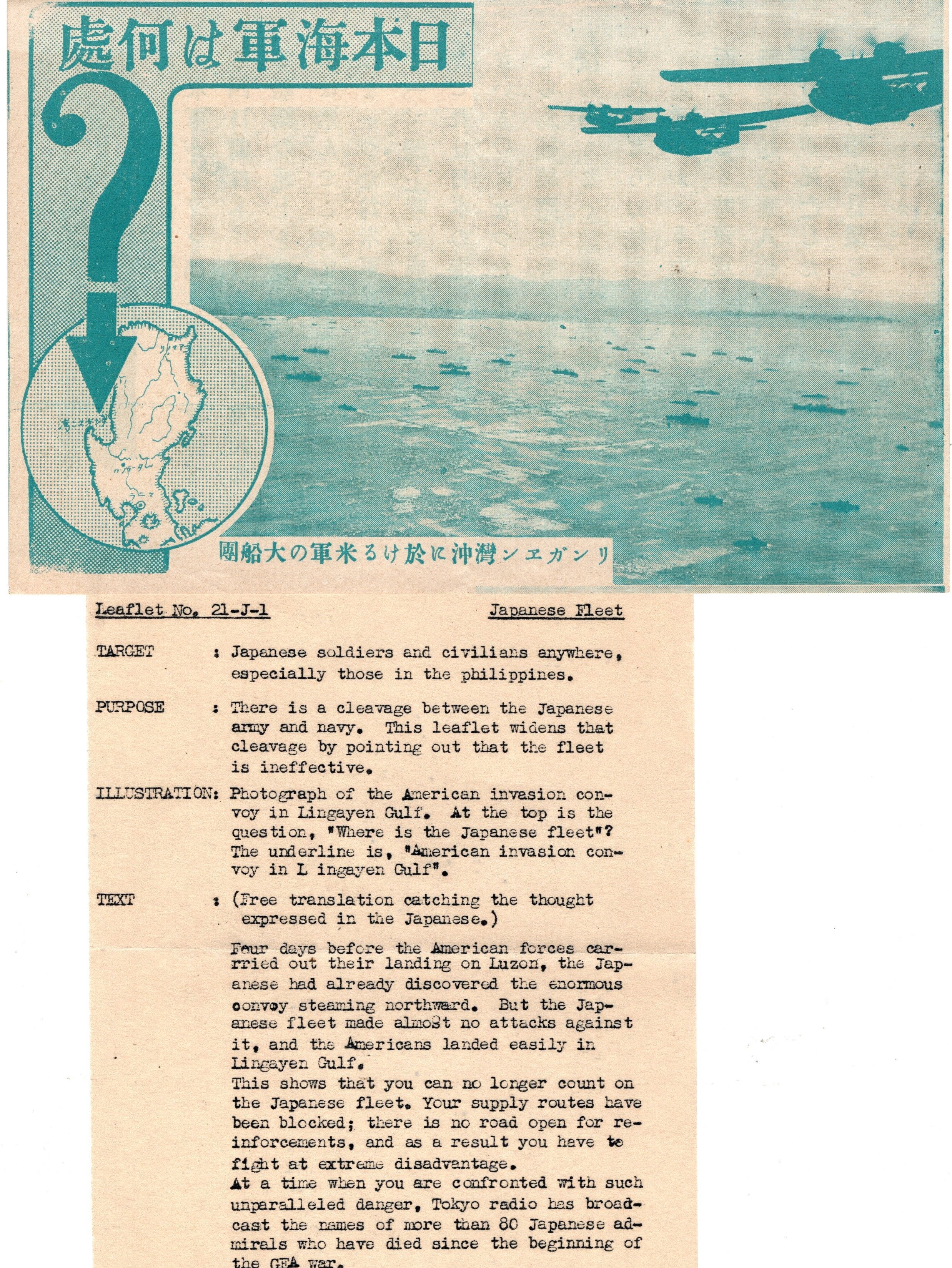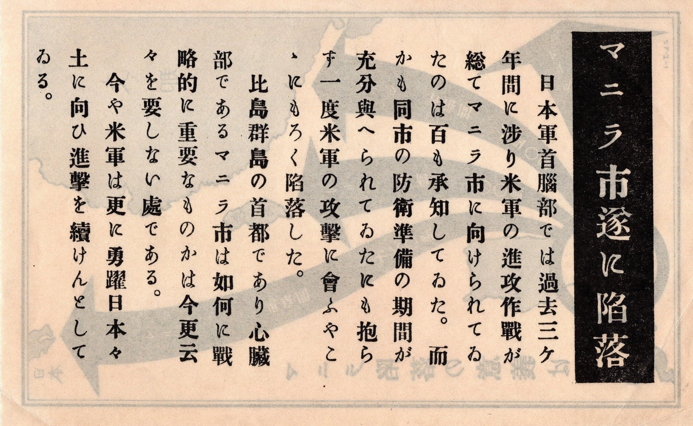 Undoubtedly, the best and most irrefutable propaganda that the Allied can now use in the Philippines is the airplane. This will give lie to the main Japanese propaganda and blow to smithereens their entire propaganda machine. Nothing except invasion can equal the propaganda value of the sight of an American airplane in the Philippine skies today. Even if the airplane were to drop nothing, the mere sight of it and the star on its wings will give the people tangible things to boost their morale and renew their faith in the American pledge to redeem the Philippines.