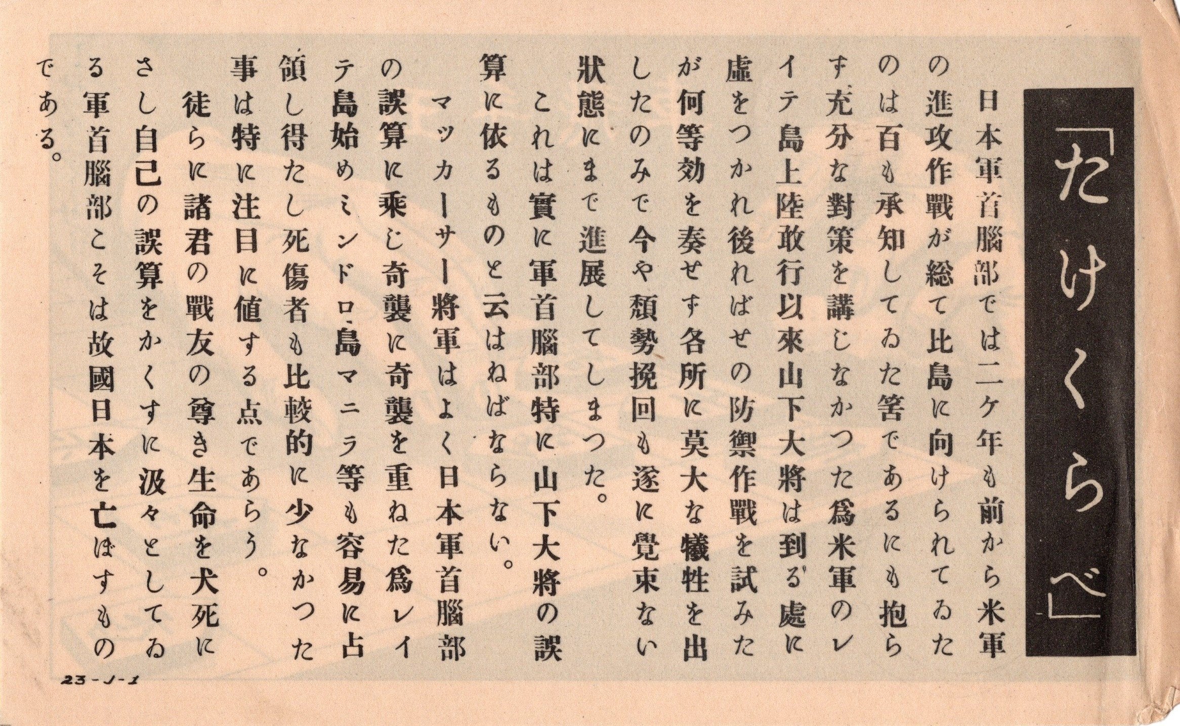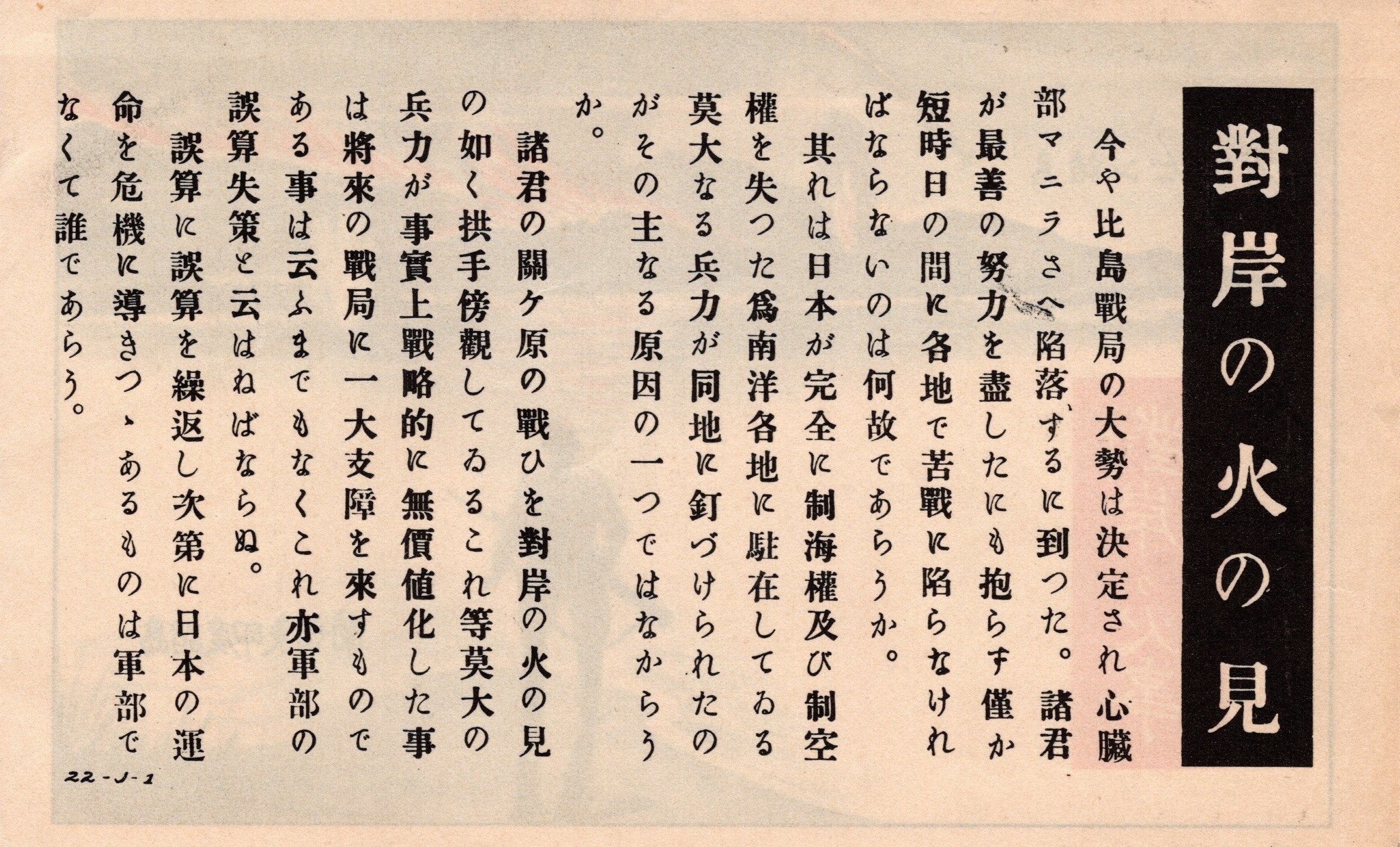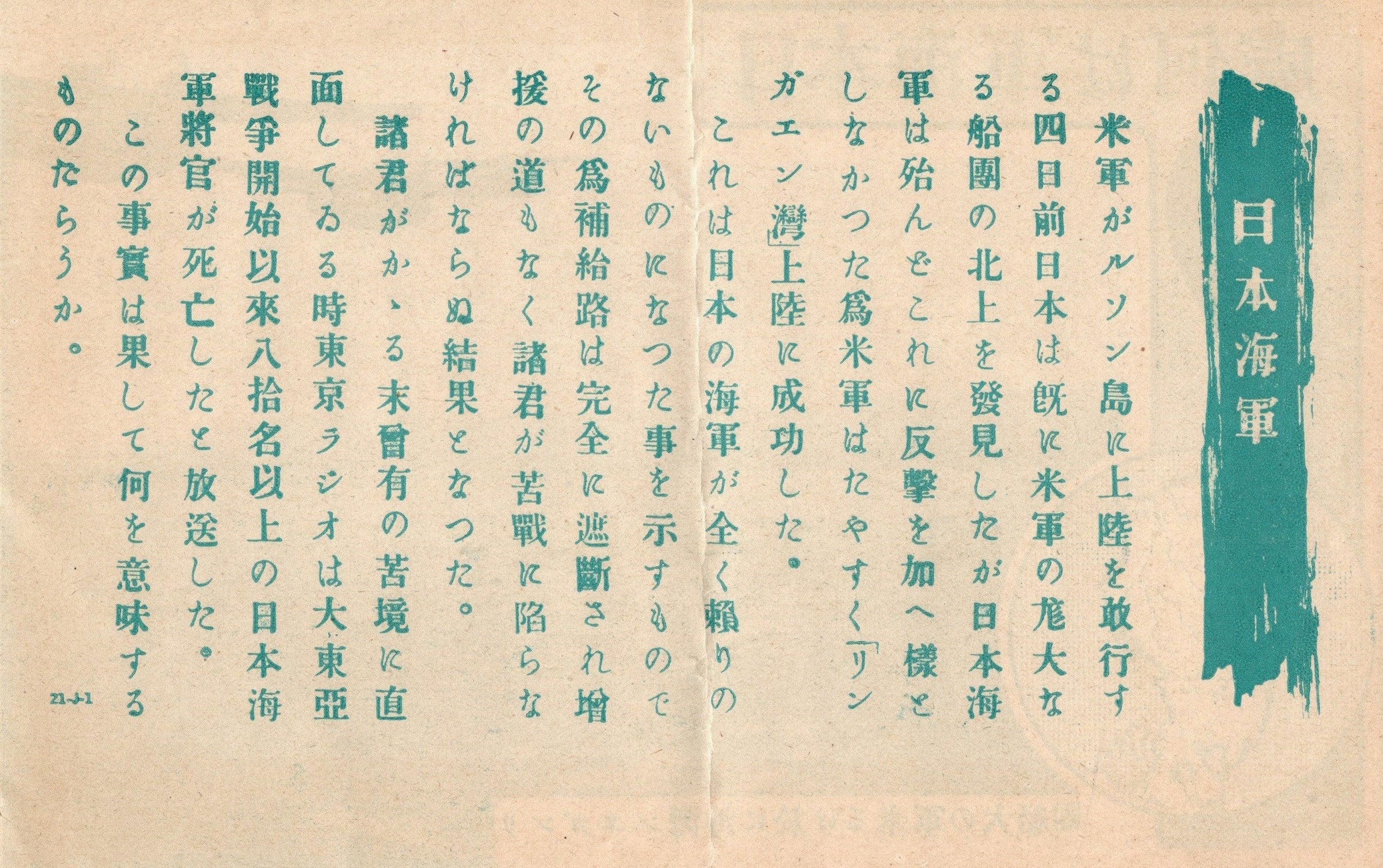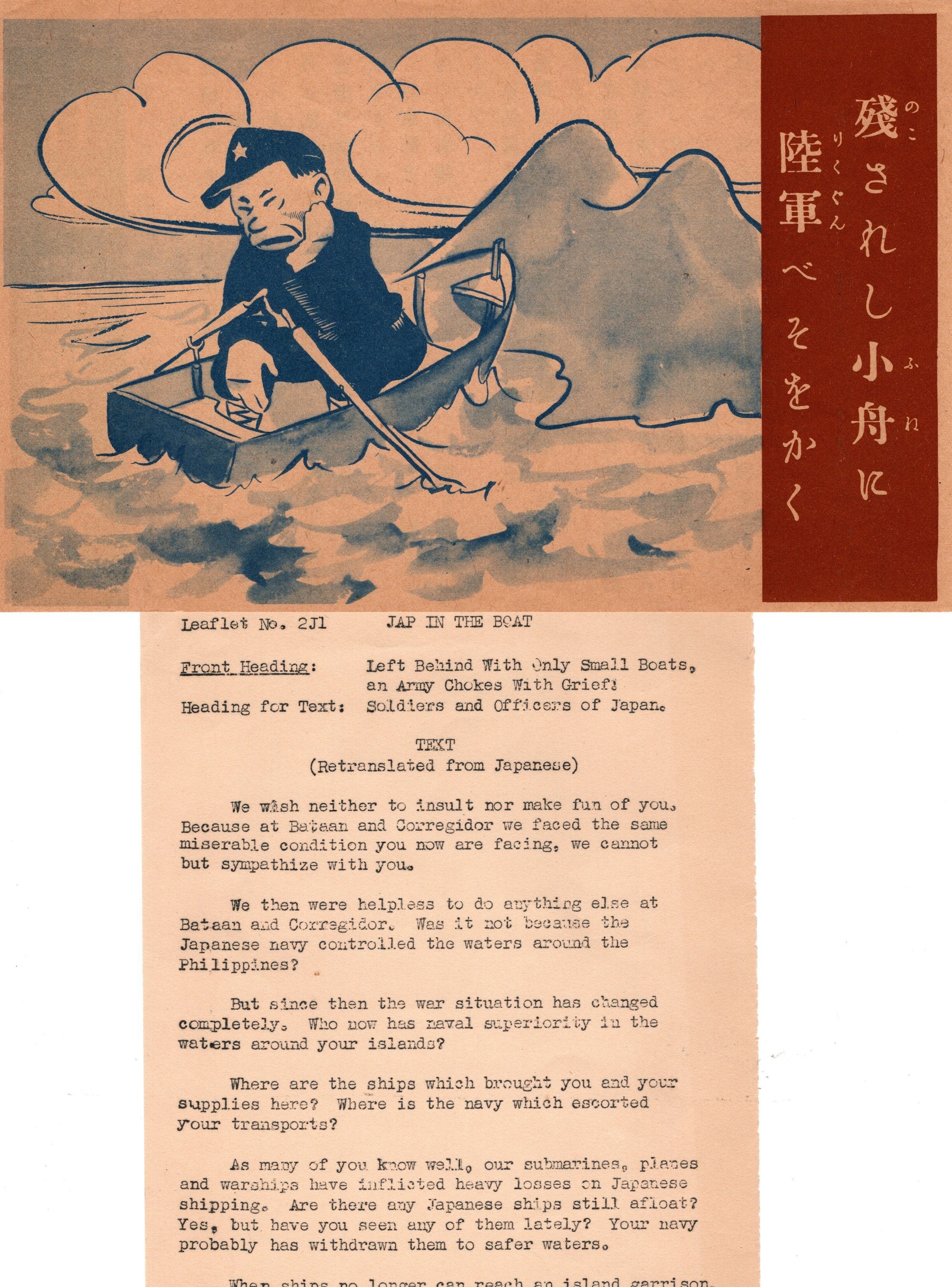 Undoubtedly, the best and most irrefutable propaganda that the Allied can now use in the Philippines is the airplane. This will give lie to the main Japanese propaganda and blow to smithereens their entire propaganda machine. Nothing except invasion can equal the propaganda value of the sight of an American airplane in the Philippine skies today. Even if the airplane were to drop nothing, the mere sight of it and the star on its wings will give the people tangible things to boost their morale and renew their faith in the American pledge to redeem the Philippines.
