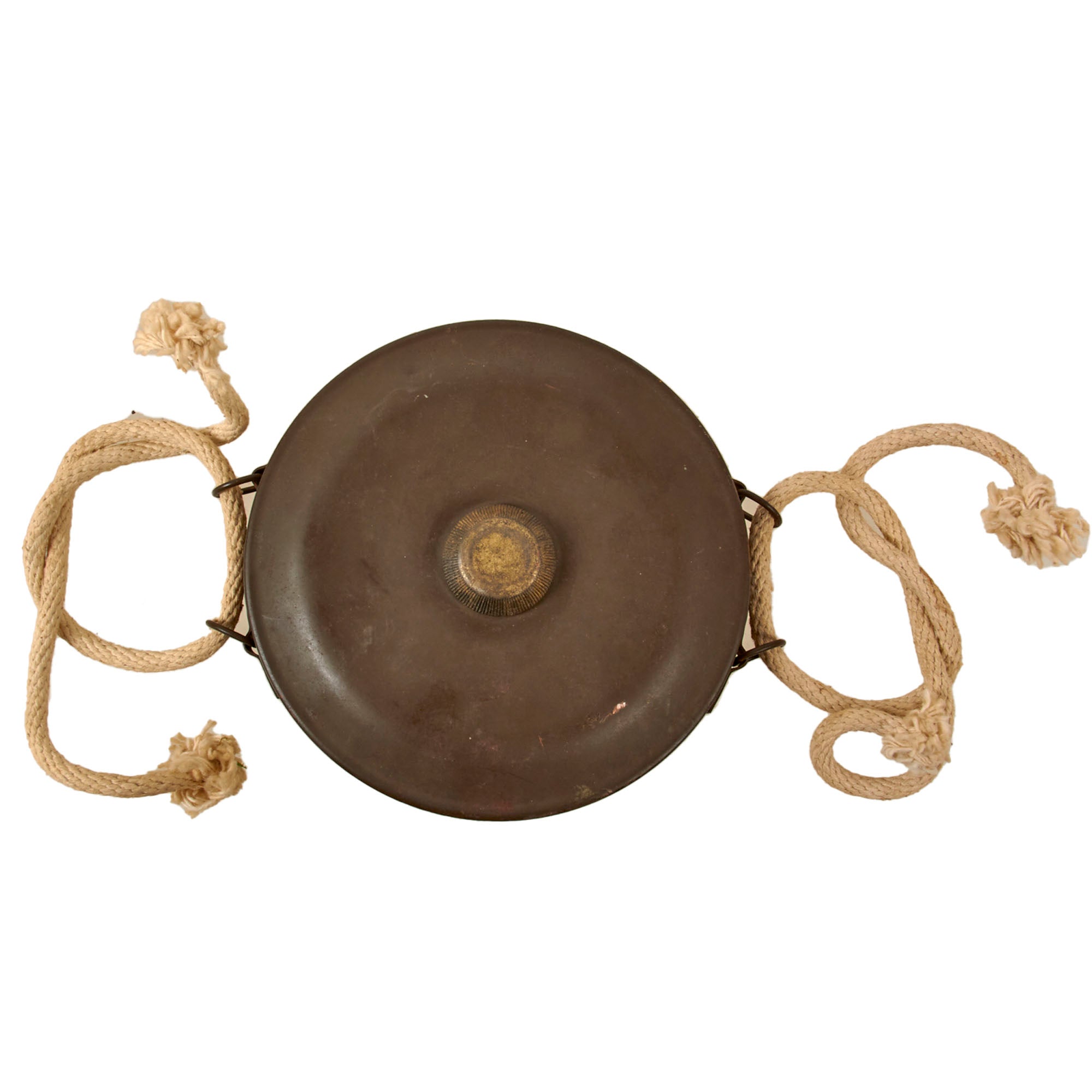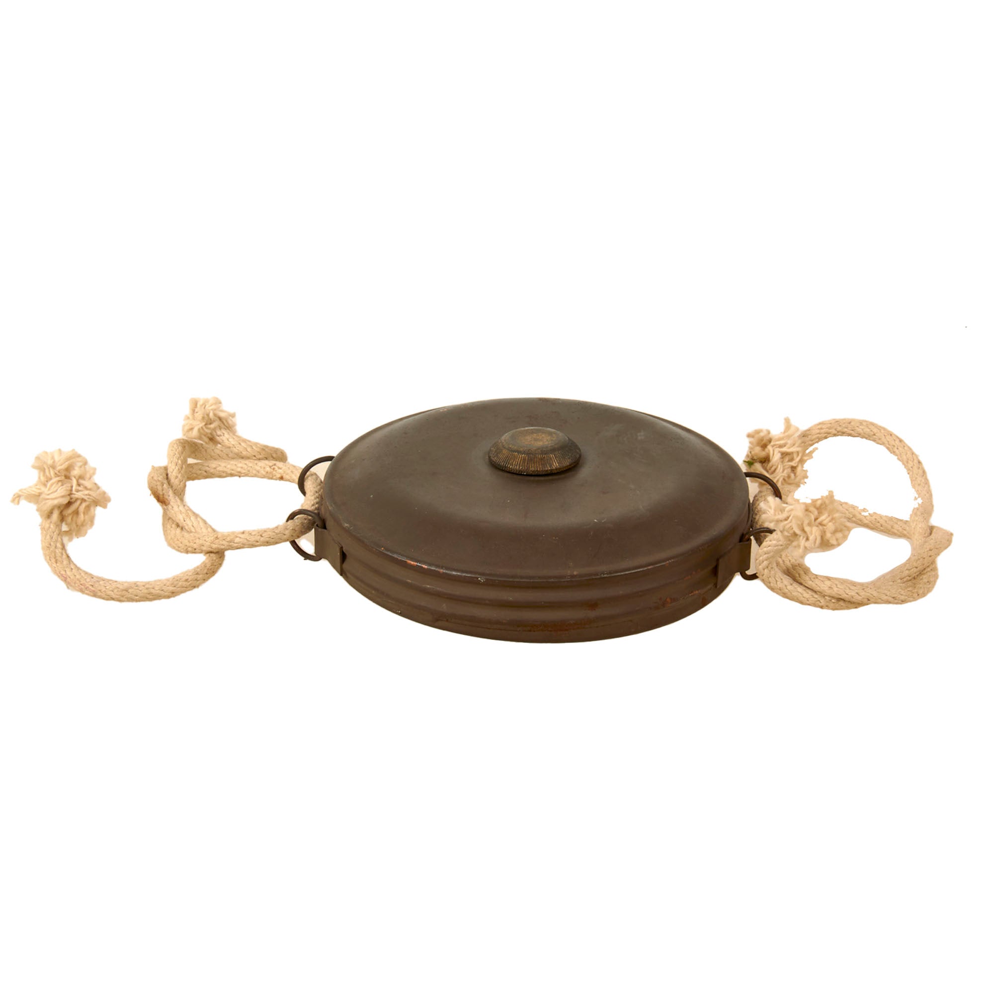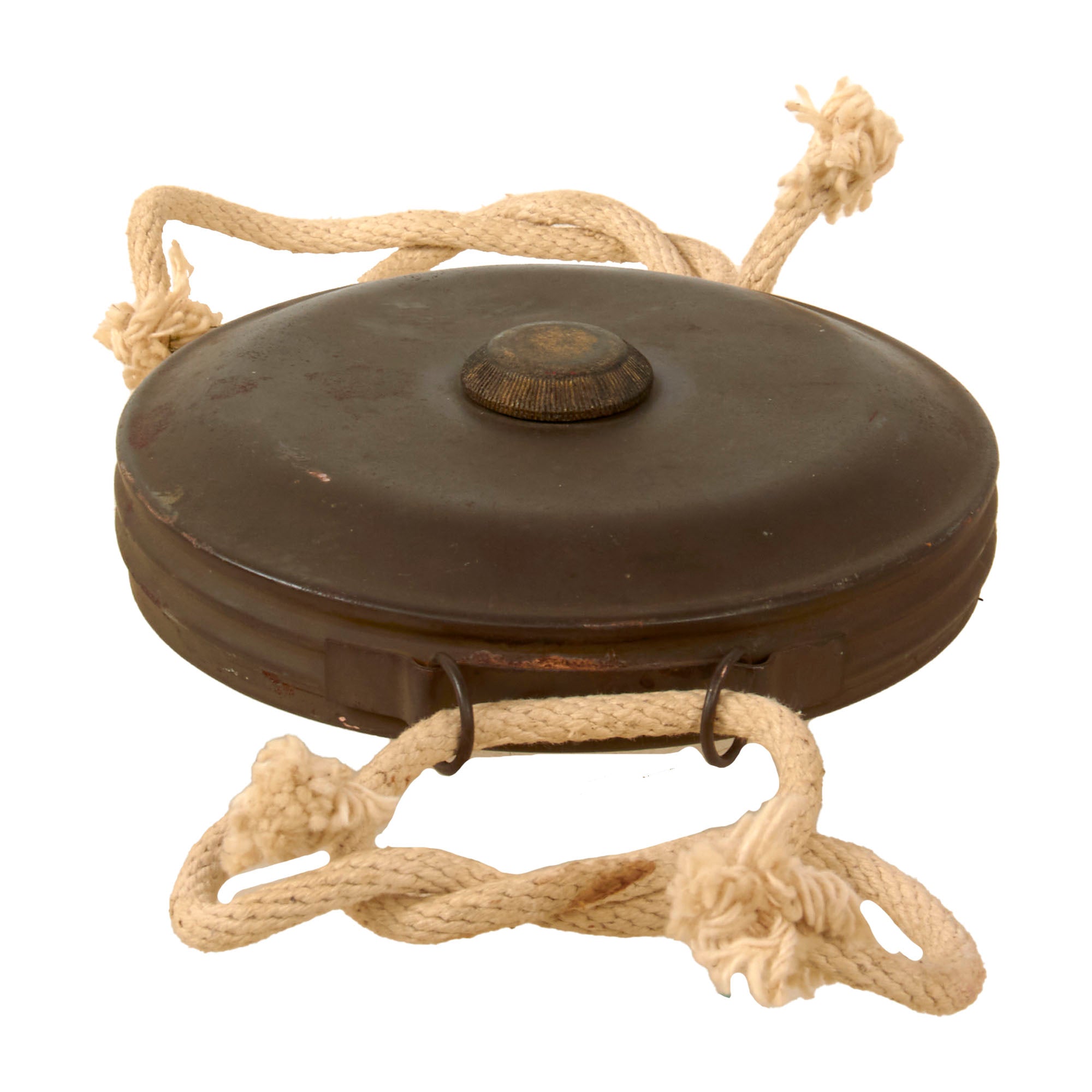 The mine itself measures about 7 inches across, and is about 1 inch tall. The condition is very good, with just a few chips and scuffs from years of storage. We are not sure when the ropes were added.