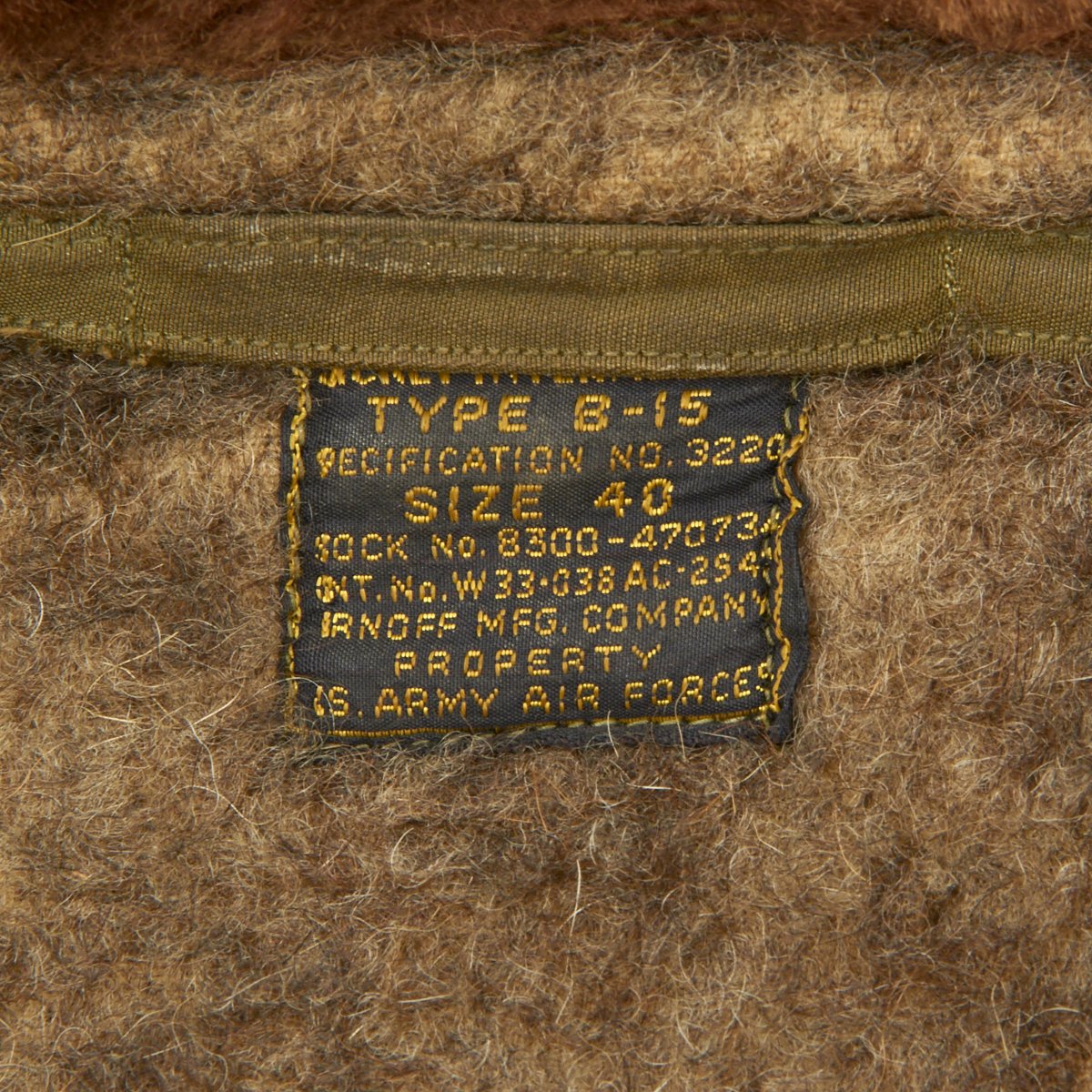 History of the Type B-15 Intermediate Flight JacketThe U. S. Army Air Force Type B-15 Intermediate Flight Jacket was developed from lessons learned in field use of the highly popular B-10 Flight Jacket of 1943. As early as 1942, the Materiel Division of the US Army Air Forces was seeking an alternative material to sheepskin for producing flying suits, and by October of that same year development had begun at Wright Field on the Intermediate Flying Jacket, Type B-10. Originally constructed of an outer shell made from a fine, cotton twill, and lined with an alpaca-and-wool pile lining, the B-10 Flight Jacket was standardized on July 22,1943, though it was superseded less than 9 months later by the B-15 Flight Jacket. Both the B-10 and B-15 Flight Jackets were designed as replacements for the sheepskin flight jackets of the 1930s and early 1940s, and represented the first cloth-shelled, alpaca fur-lined flight jackets of the USAAF. These flight jackets were an instant success with just about every aviator who encountered one, being much lighter and more versatile than the flight jackets they replaced. Intended for wear in climates between 25 degrees and 55 degrees Fahrenheit, the B-15 Flight Jacket was ideally suited for early spring and late fall and winter.