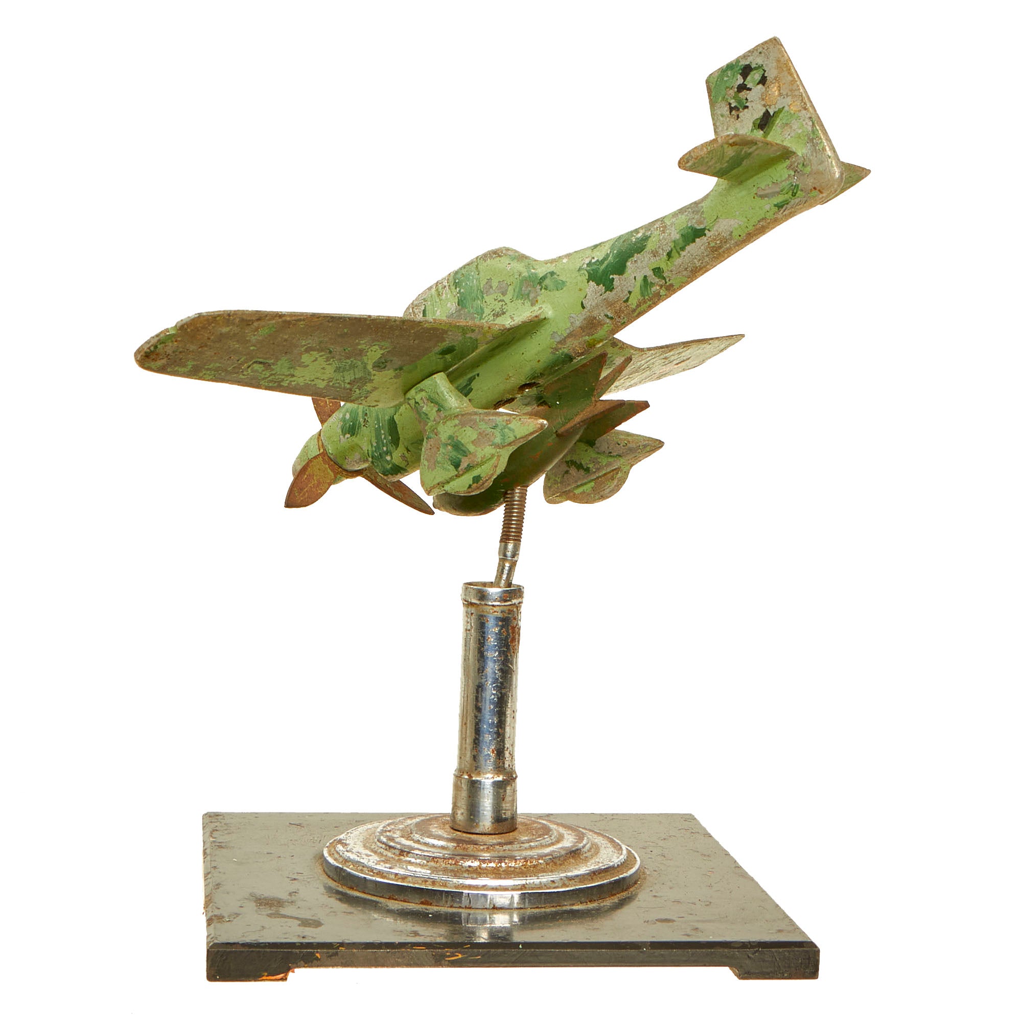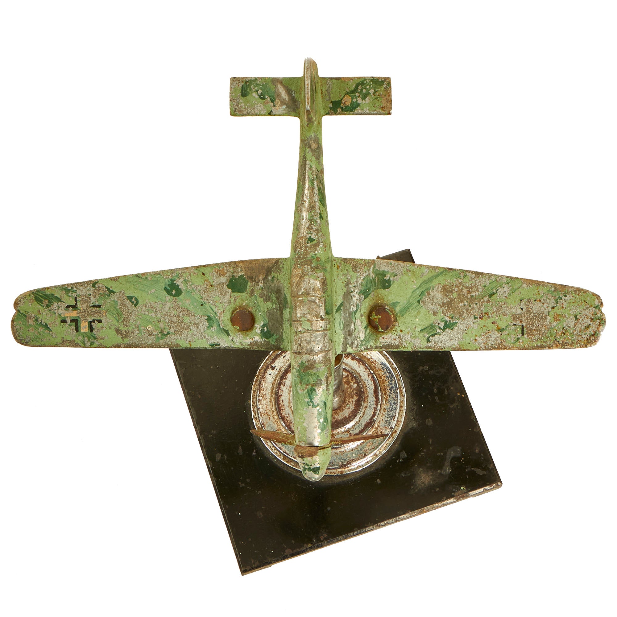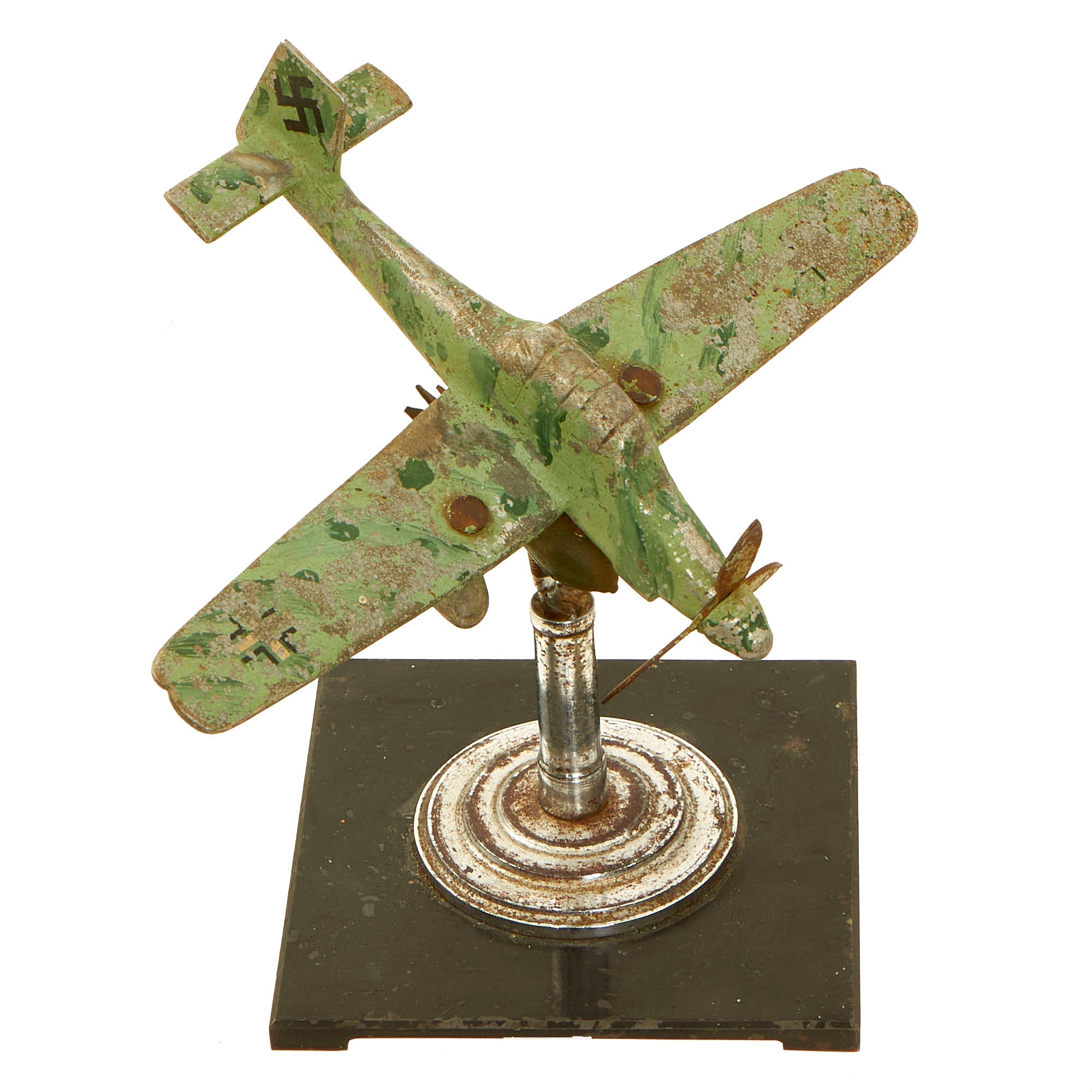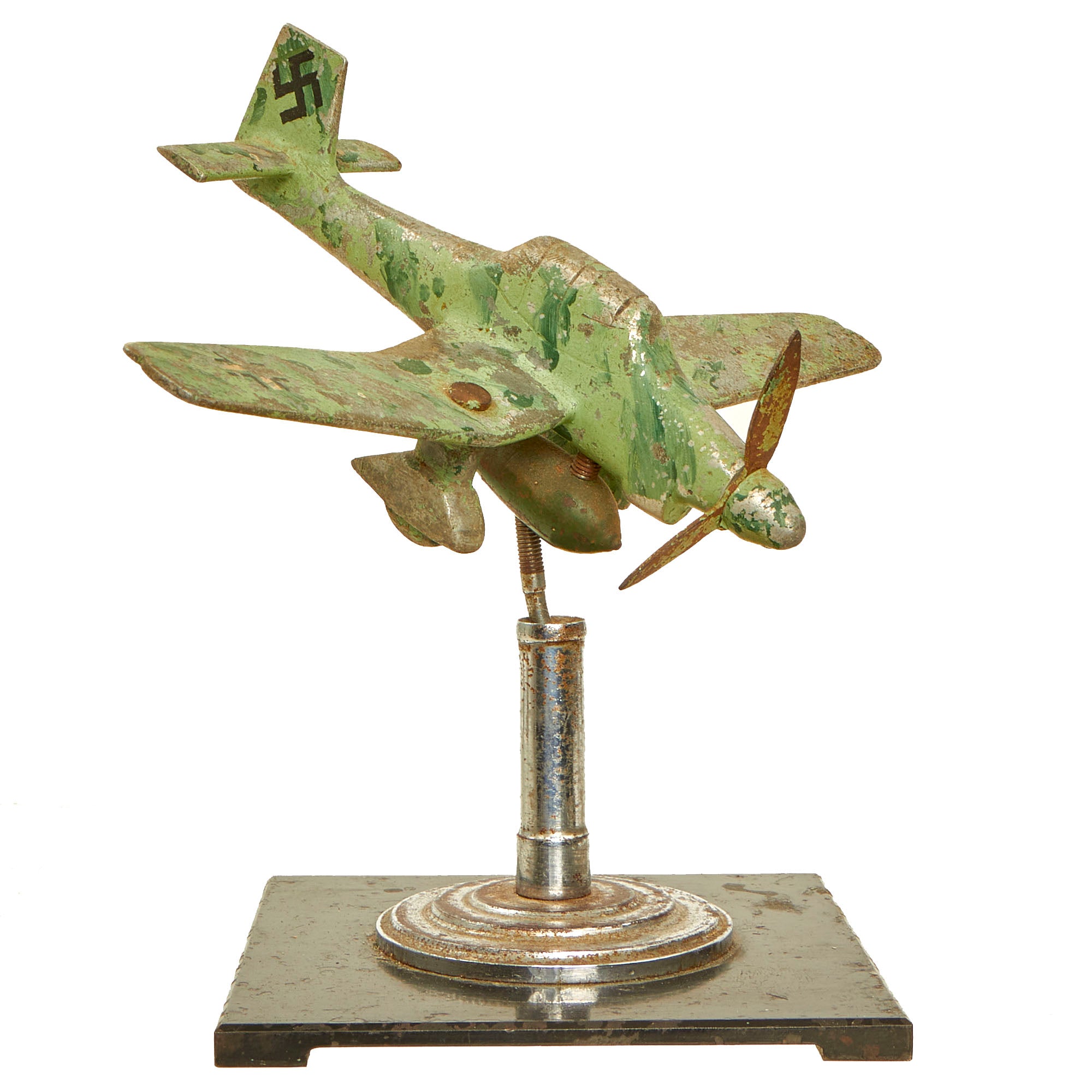 There is no extensive damage present and it does appear to be complete. There is minor chipping present on a few of the edges, but they could have been made when constructing this item. The paint that is present on it may have been done post war. The base in which the model sits on is moveable, allowing you to essentially angle the aircraft and rotate it by means of a ball joint.