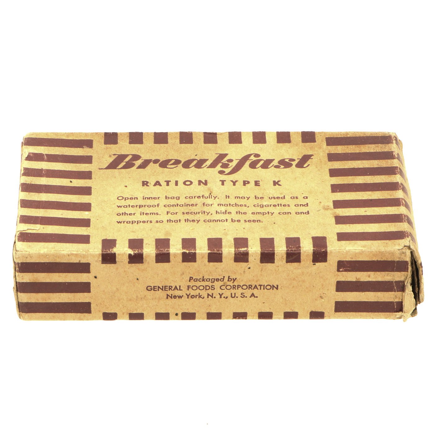 Original Items: Only One Available. The K-ration was an individual daily combat food ration which was introduced by the United States Army during World War II. It was originally intended as an individually packaged daily ration for issue to airborne troops, tank crews, motorcycle couriers, and other mobile forces for a short duration. The K-ration provided three separately boxed meal units: breakfast, dinner (lunch) and supper (dinner).