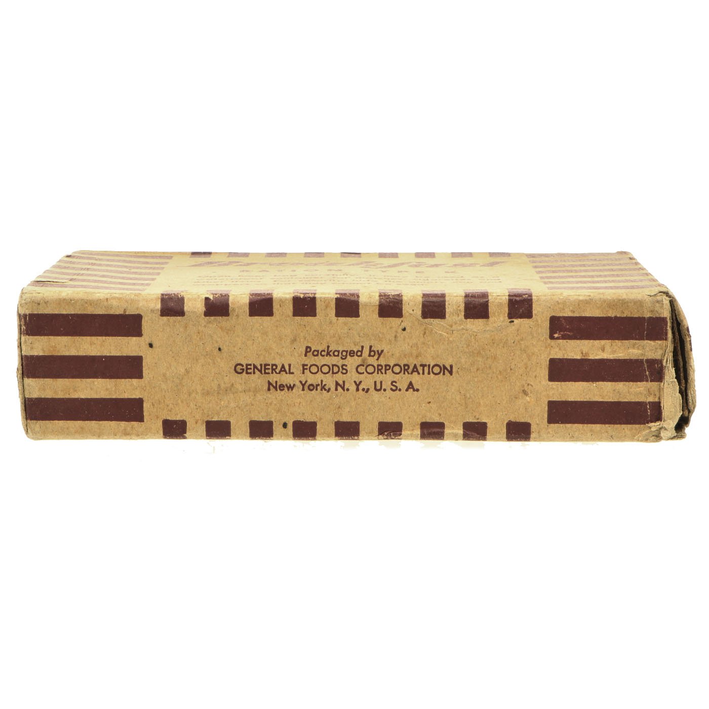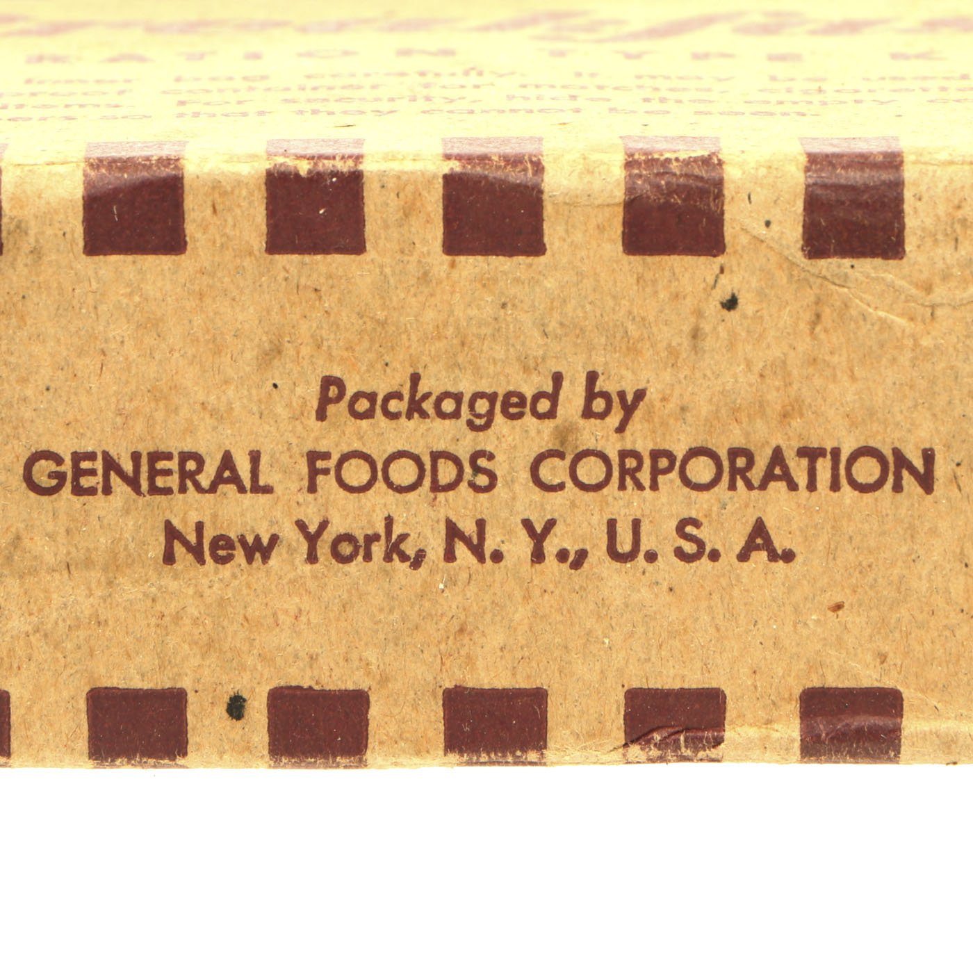 This is a very nice unissued DINNER unit by General Foods Corporation. It is the later war "Morale Series", with the maroon design on the exterior. While we did not open it, years of storage and bouncing around have caused the interior wax paper container to open at one end, so we can see inside from that end. We have not removed any contents for inspection or inventory.