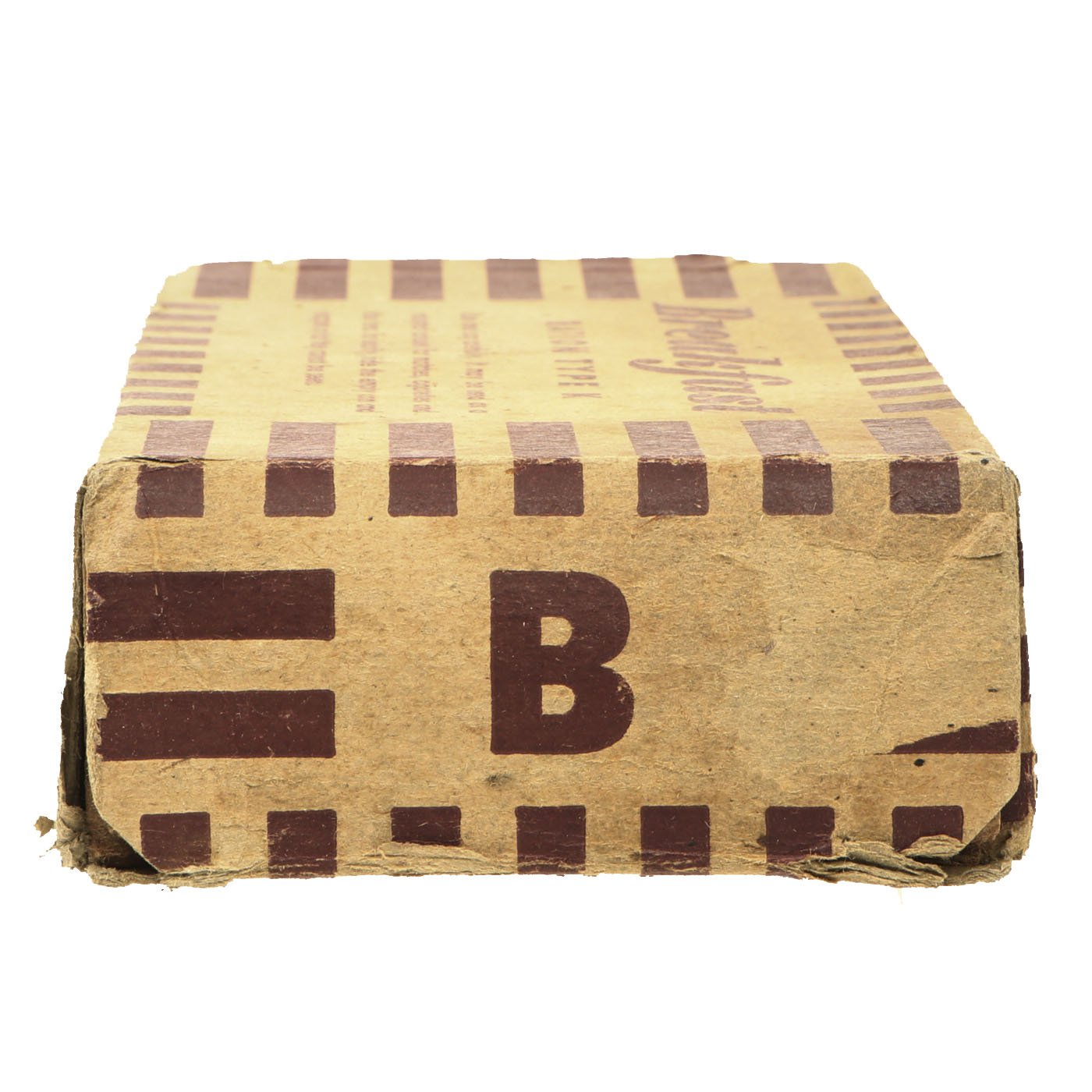 The K-ration originally came packed in an unbleached tan-colored rectangular cardstock box with black lettering. The outer box was printed on its top in bold capital sans serif block letter type with the text: "US ARMY FIELD RATION K", with the meal unit type (BREAKFAST, DINNER, or SUPPER UNIT) printed underneath it and a capital letter on each end (B, D, or S). While it was intended that the three meals be eaten in their named order, they were not always consumed in this manner. The inner box had the meal unit type printed across its top and a capital letter on each end (B, D, or S).