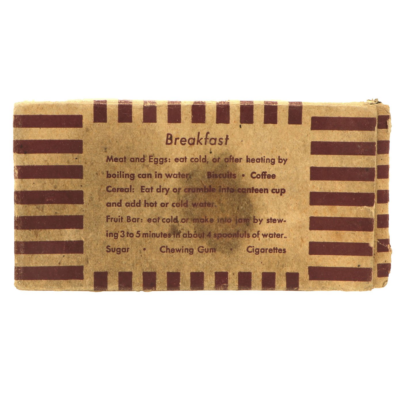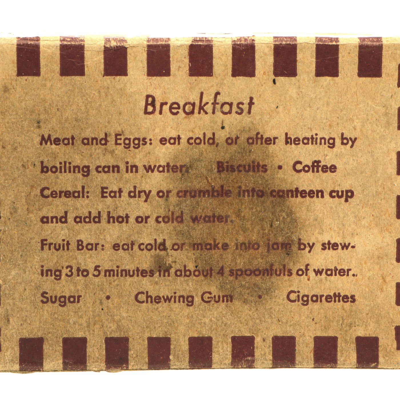 The breakfast units would contain: canned entree veal (early version), canned chopped ham and eggs (all subsequent versions), biscuits, dextrose or malted milk tablets (early version), dried fruit bar, pre-mixed oatmeal cereal (late version) Halazone water purification tablets, a four-pack of cigarettes, Dentyne or Wrigley chewing gum, instant coffee, a packet of toilet paper tissues, and sugar (granulated, cubed, or compressed).