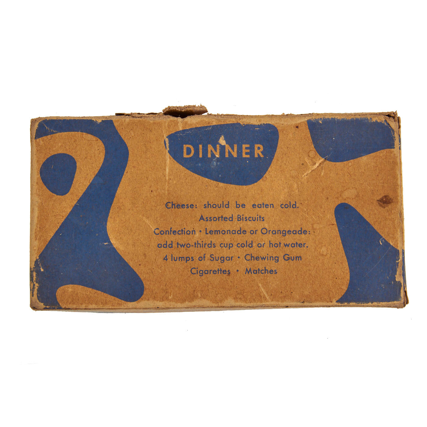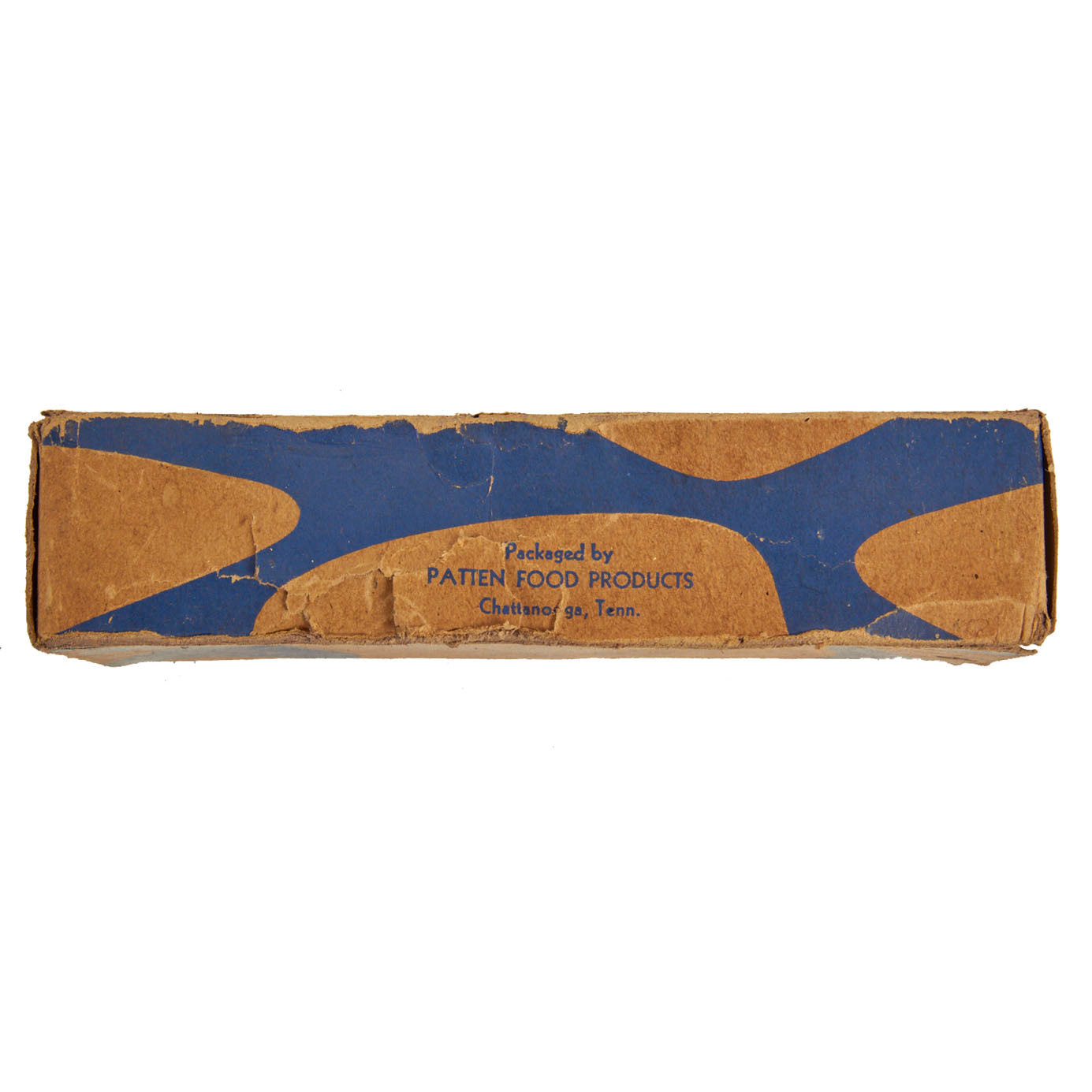 This is a very nice unissued DINNER unit by PATTEN FOOD PRODUCTS of Chattanooga,Tennessee. It is the later war "Morale Series", with the blue design on the exterior. While we did not open it, years of storage and bouncing around have caused the interior main cardboard container to open at one end, so we can still see the unopened wax sealed inner box.