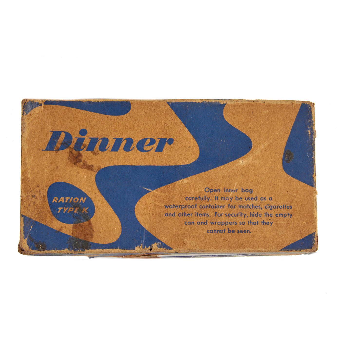 Original Items: Only One Available. The K-ration was an individual daily combat food ration which was introduced by the United States Army during World War II. It was originally intended as an individually packaged daily ration for issue to airborne troops, tank crews, motorcycle couriers, and other mobile forces for a short duration. The K-ration provided three separately boxed meal units: breakfast, dinner (lunch) and supper (dinner).