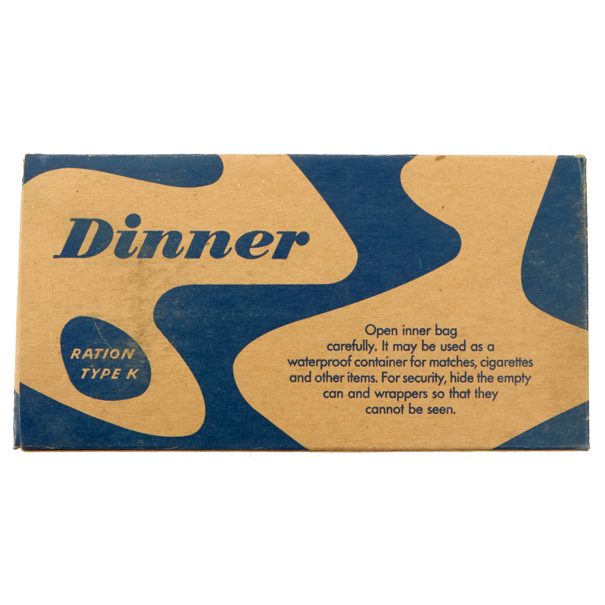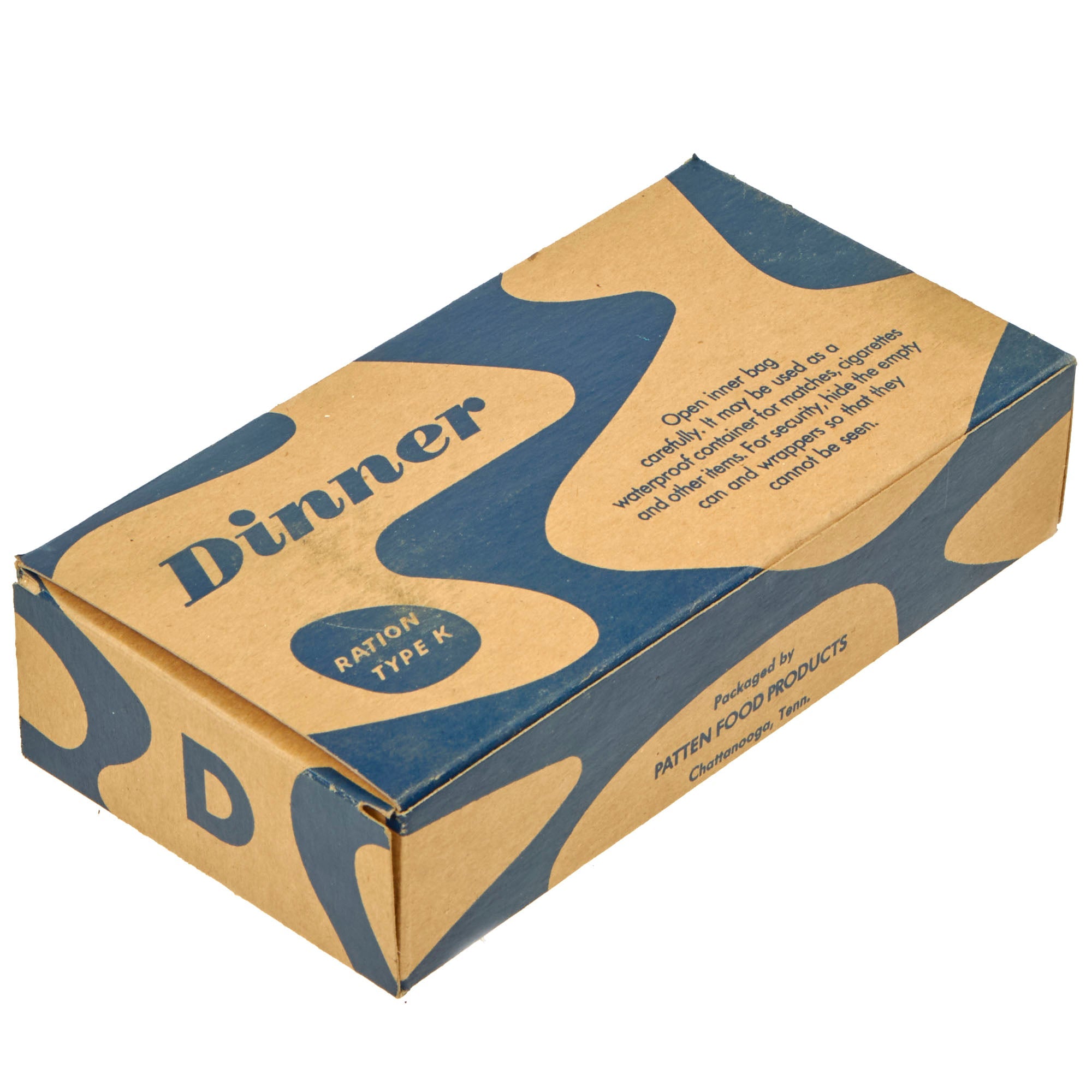 Original Items: Only One Available. The K-ration was an individual daily combat food ration which was introduced by the United States Army during World War II. It was originally intended as an individually packaged daily ration for issue to airborne troops, tank crews, motorcycle couriers, and other mobile forces for a short duration. The K-ration provided three separately boxed meal units: breakfast, dinner (lunch) and supper (dinner).