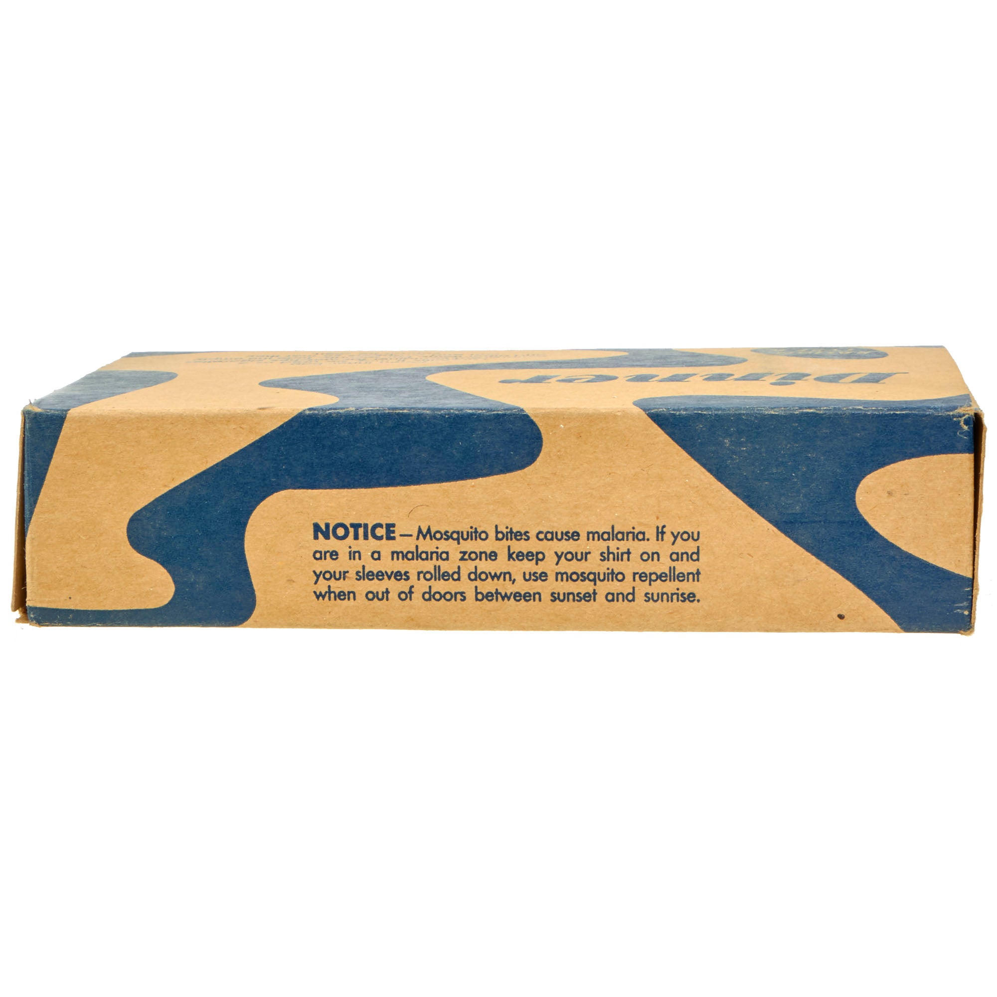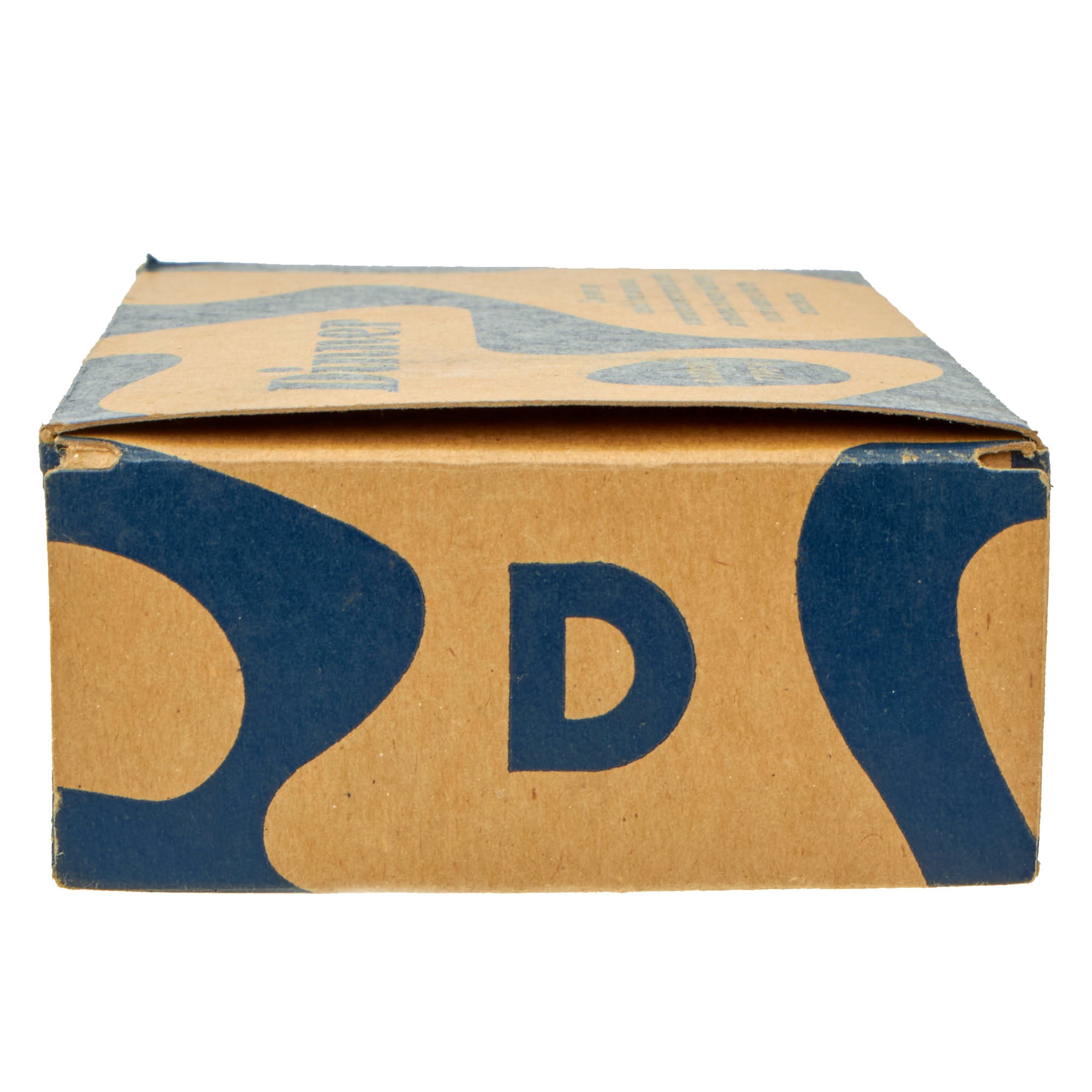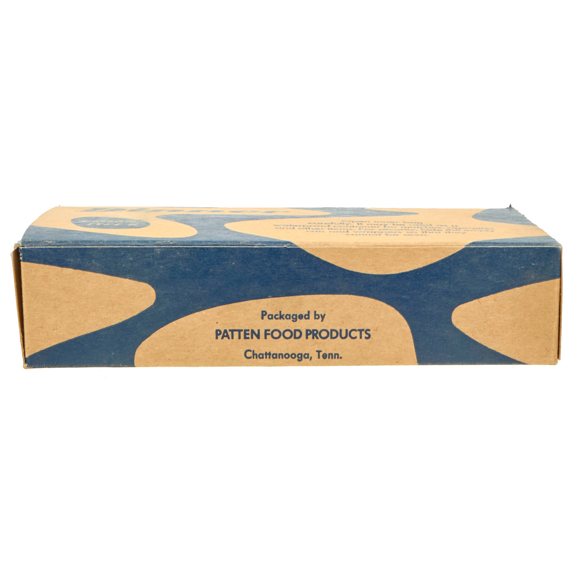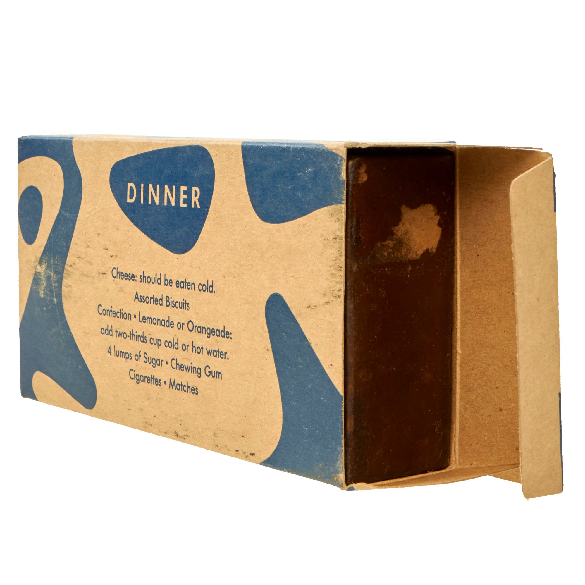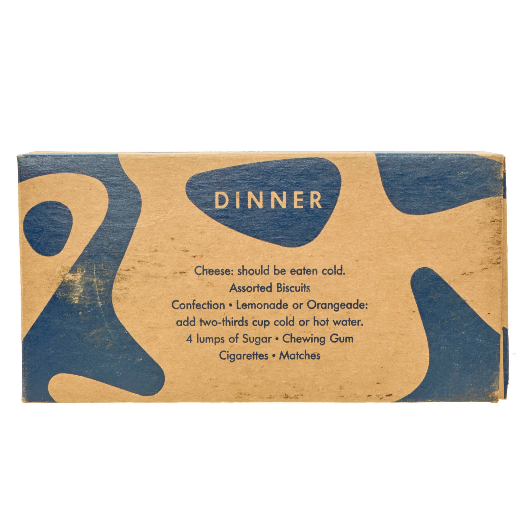 This is a very nice unissued DINNER unit by PATTEN FOOD PRODUCTS of Chattanooga, Tenn. It is the later war "Morale Series", with the blue design on the exterior. This is an unopened example and one of the best we have encountered. There are no foul odors leaking from the box like you usually come across nor are there any holes or tearing in the box.