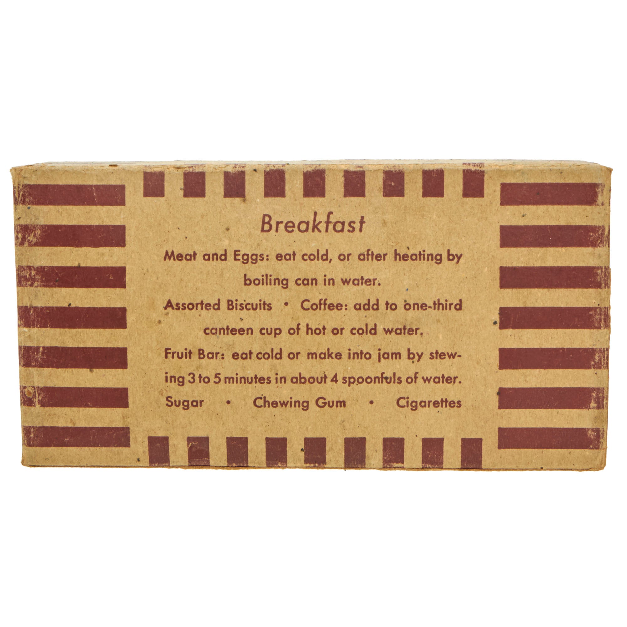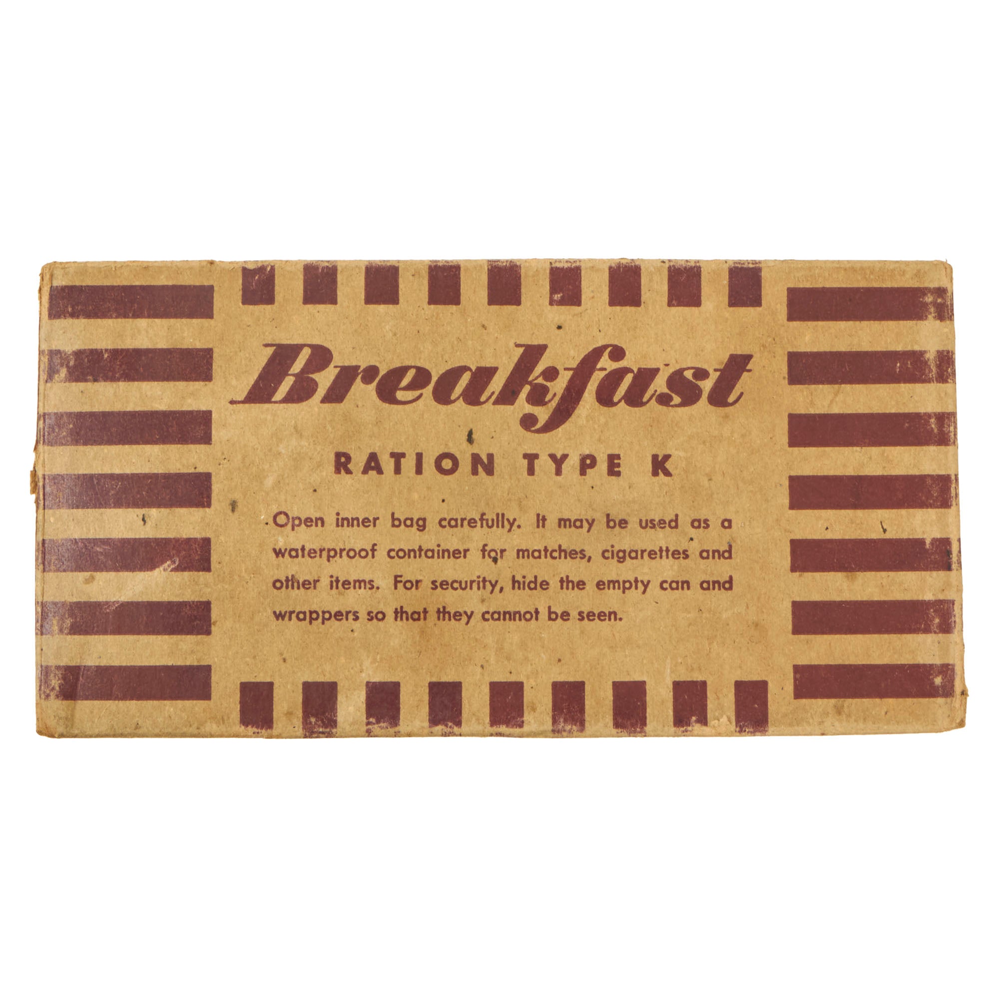 - Unopened Breakfast Ration Type K (Kellogg Company): This is a very nice unissued BREAKFAST unit by Kellogg COMPANY. It is the later war "Morale Series", with the maroon design on the exterior. This is one of the nicest rations we have encountered. There is minimal faults on the exterior carton and no foul odors of the long expired meals on the inside. The outer cardboard box is not opened.
